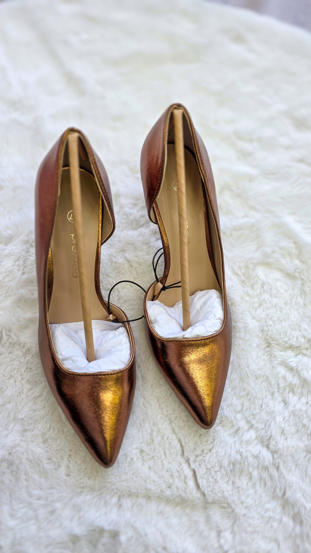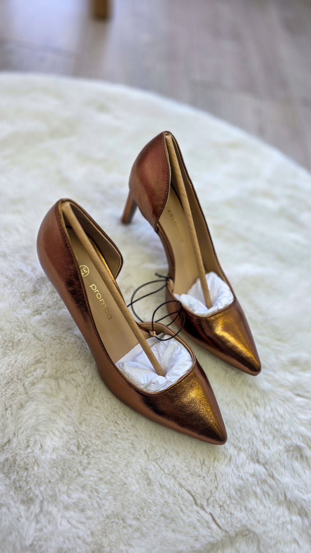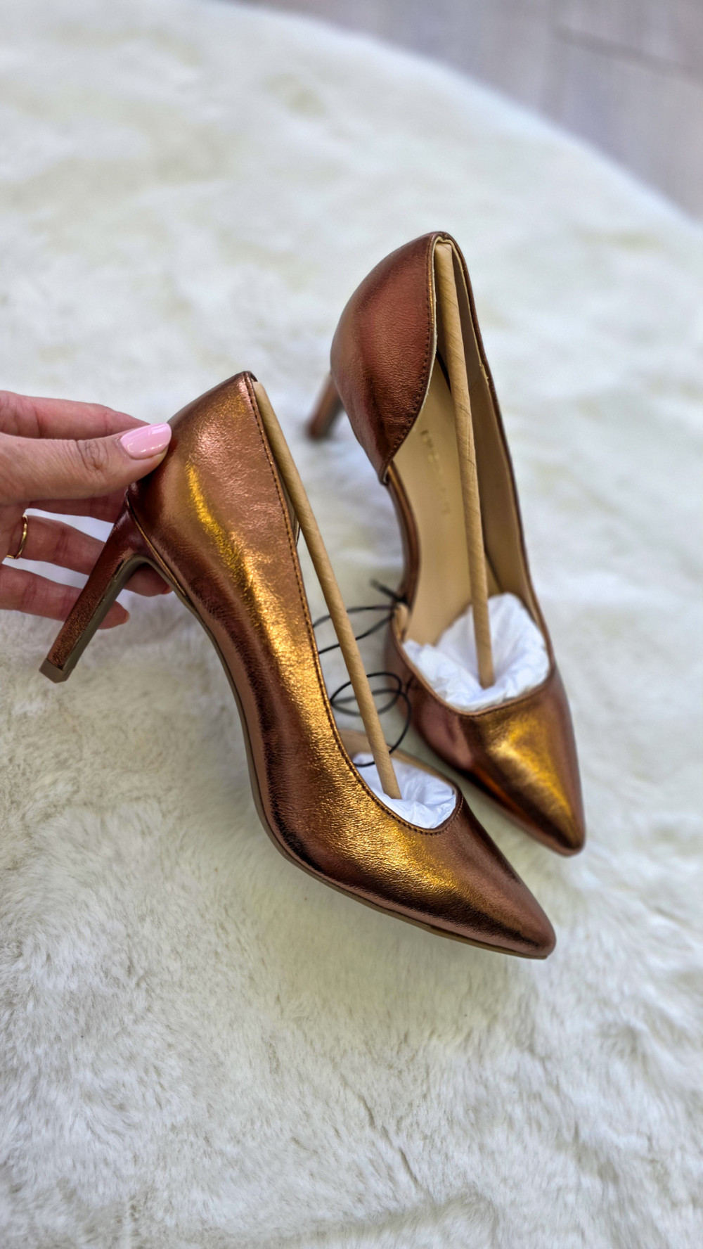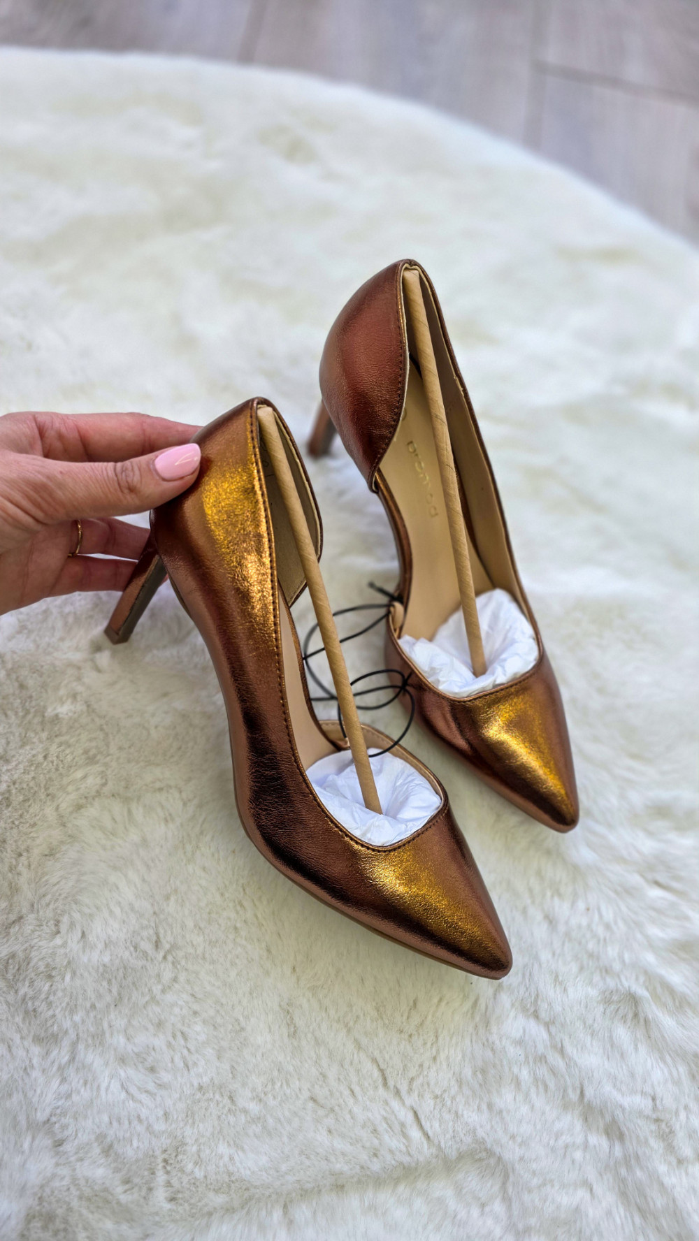Modne szpilki PROMOD w rozmiarze 37 o metalicznym, miedzianym wykończeniu to propozycja dla kobiet lubiących przyciągać spojrzenia. Połyskująca powierzchnia, smukły obcas i elegancki fason sprawiają, że te czółenka świetnie sprawdzą się na wesele, imprezę, randkę czy wyjątkowe wyjście.