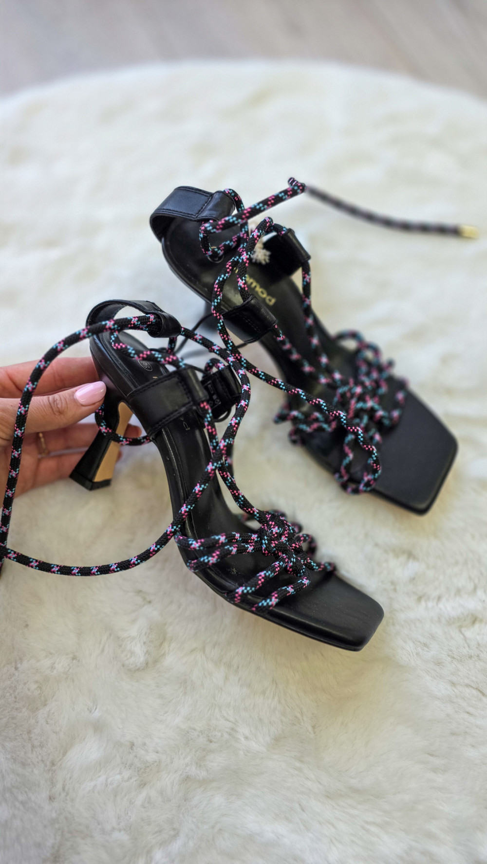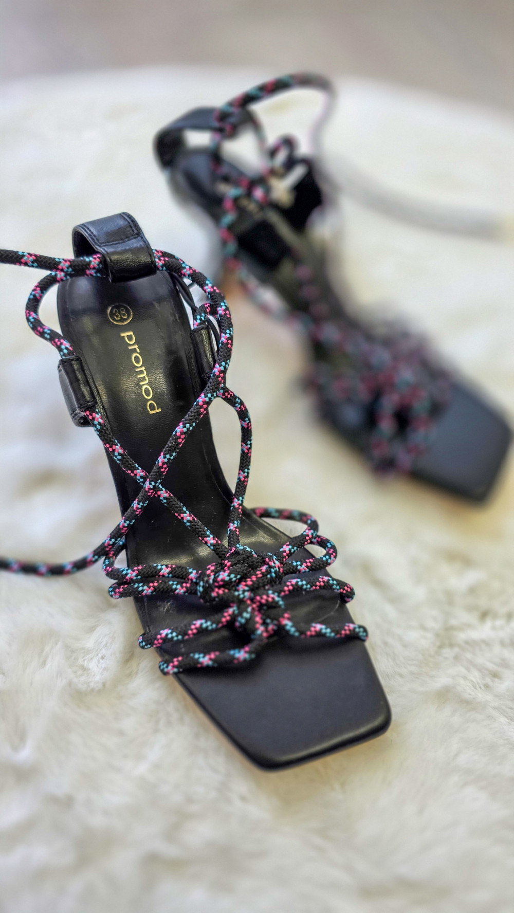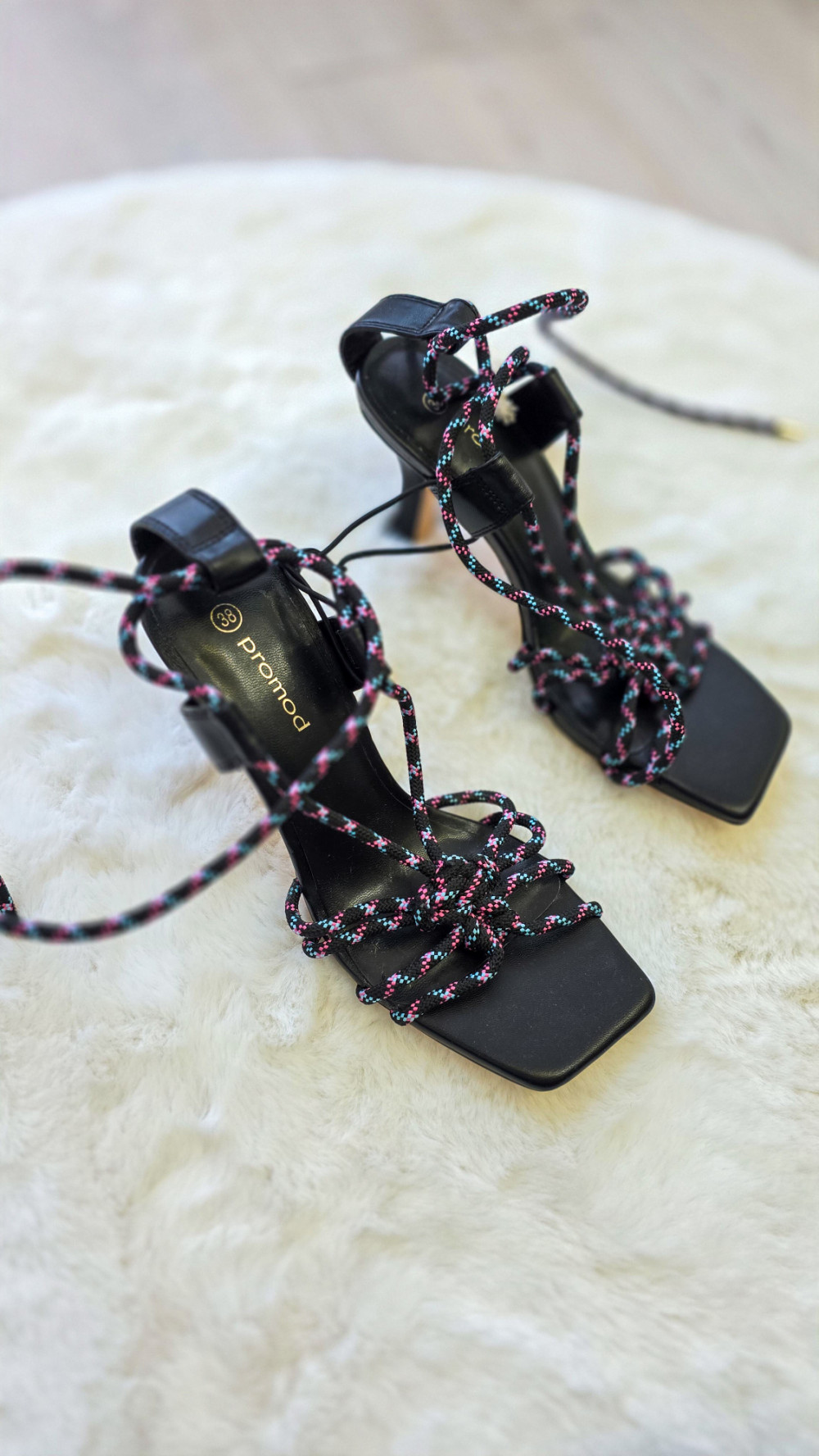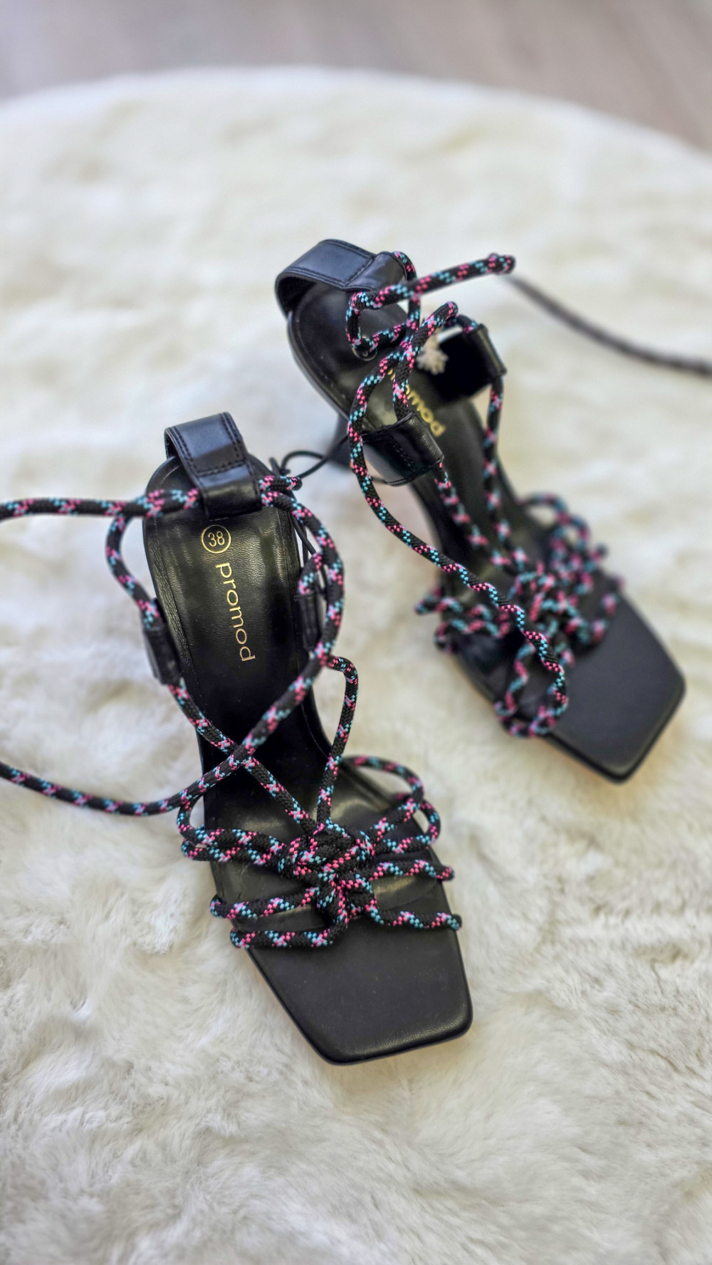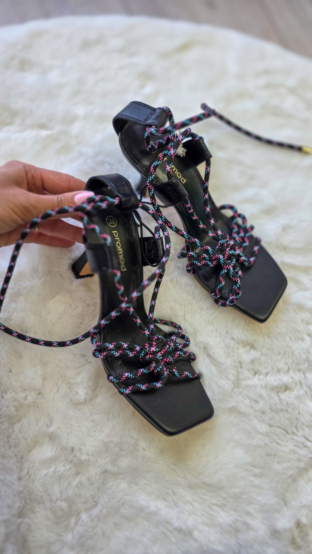 Eleganckie sandały damskie marki PROMOD na stabilnym obcasie. Model z modnym wiązaniem wokół kostki oraz ozdobnymi sznurkami z kolorowymi akcentami. Kwadratowy nosek nadaje im nowoczesnego charakteru. Idealne na wesele, imprezę lub letnie stylizacje.