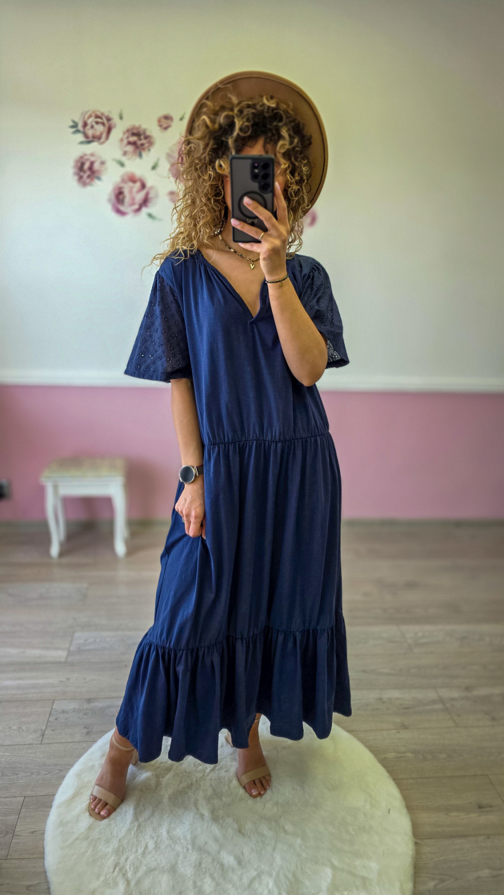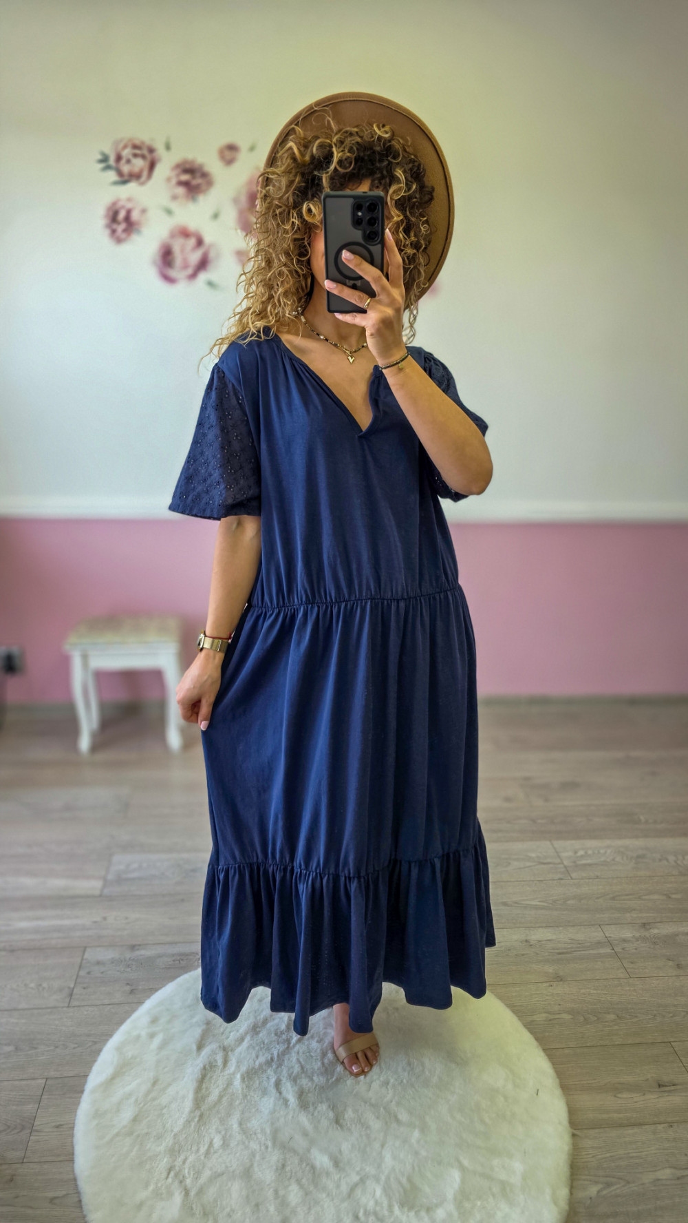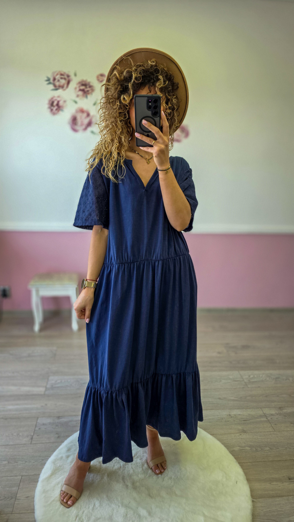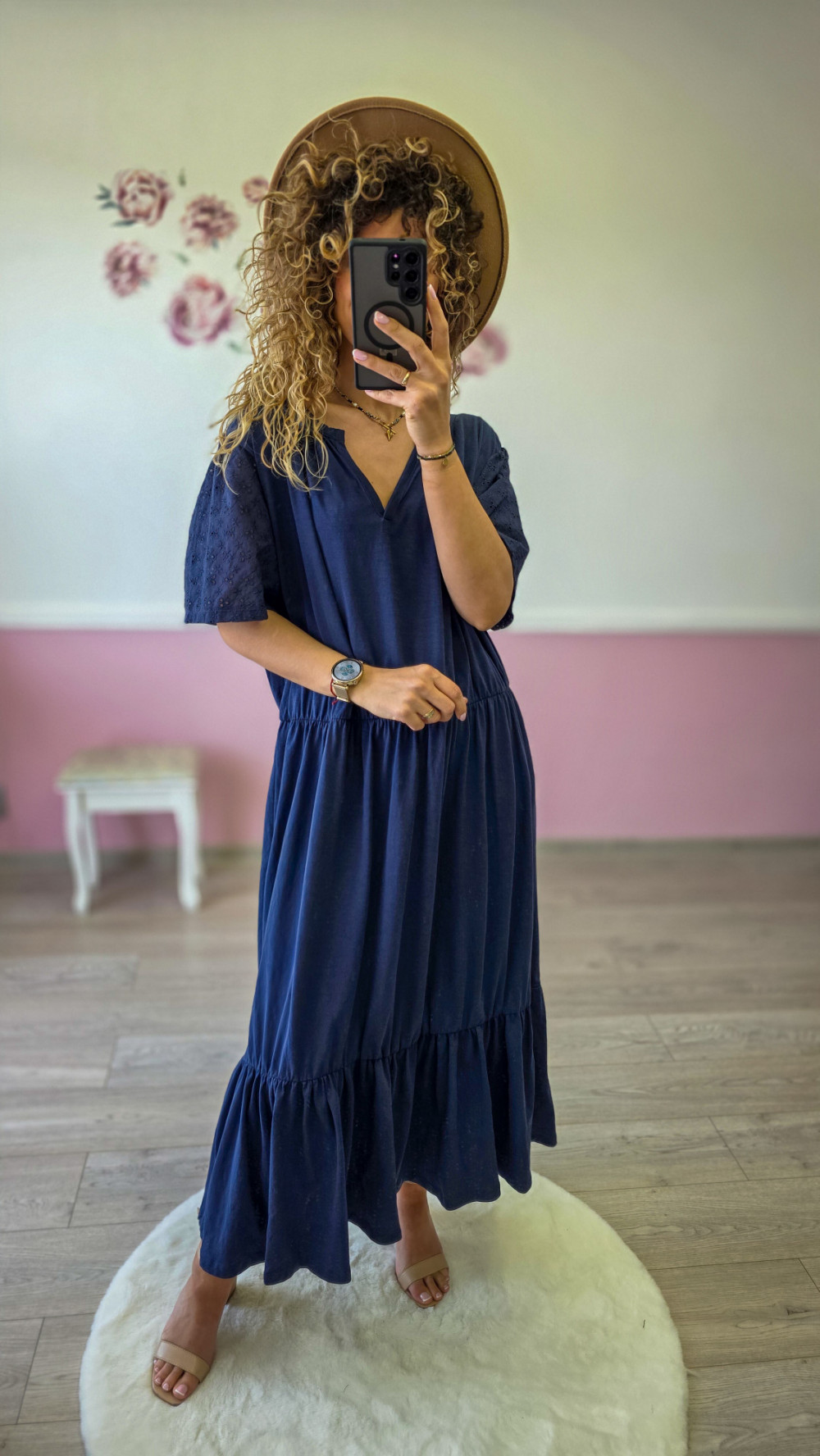 Granatowa sukienka midi damska – falbana i ozdobne rękawy