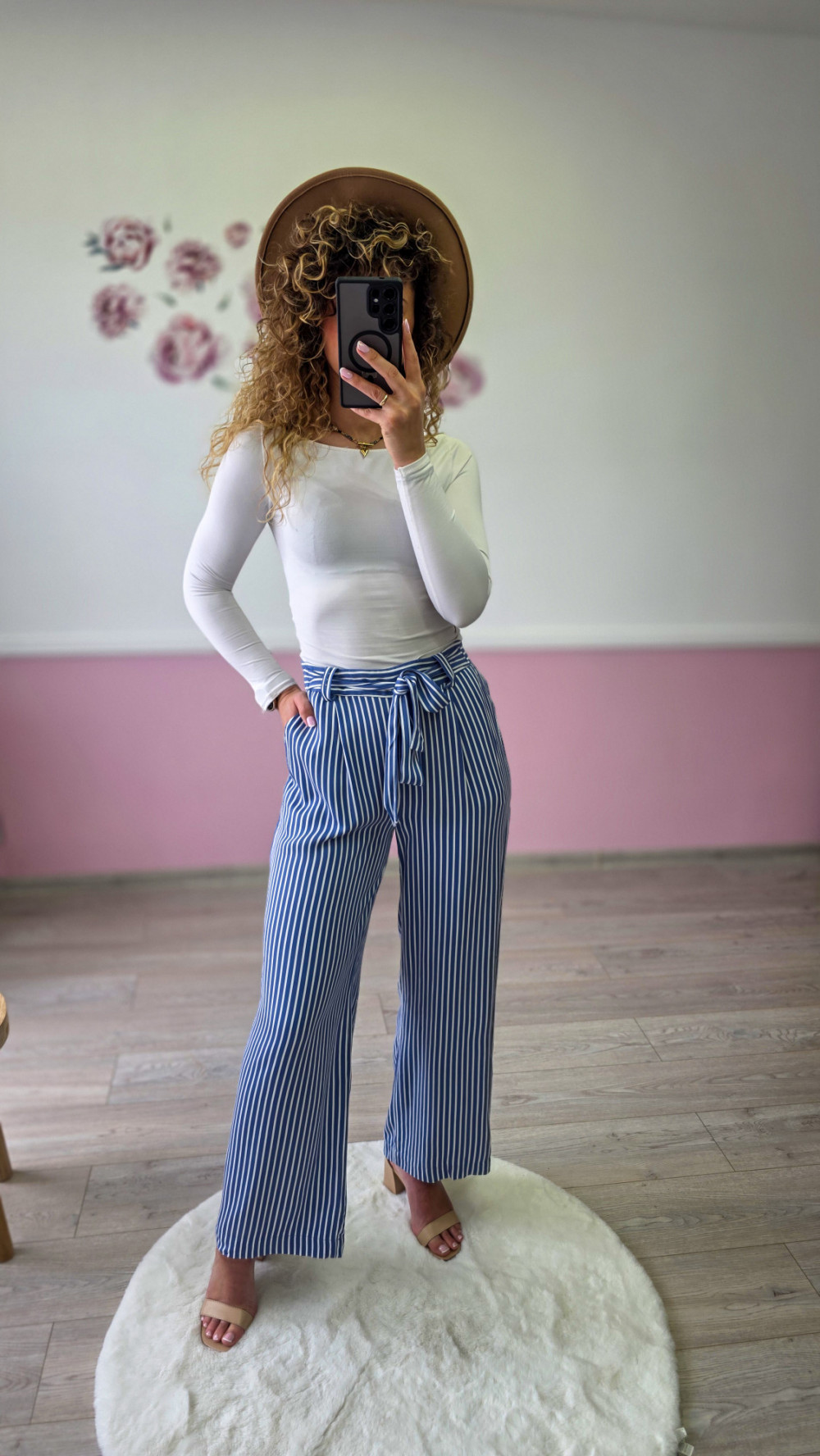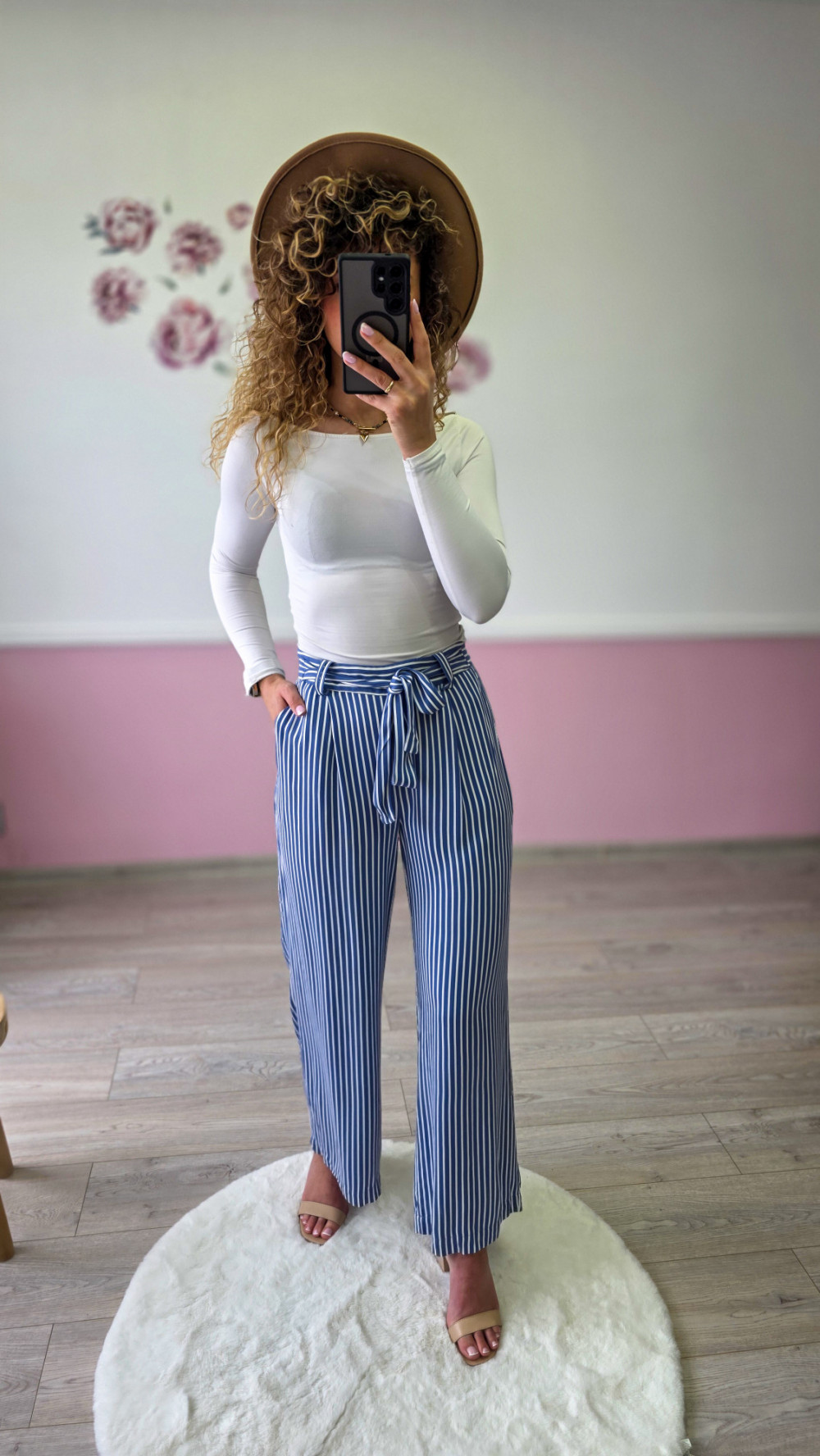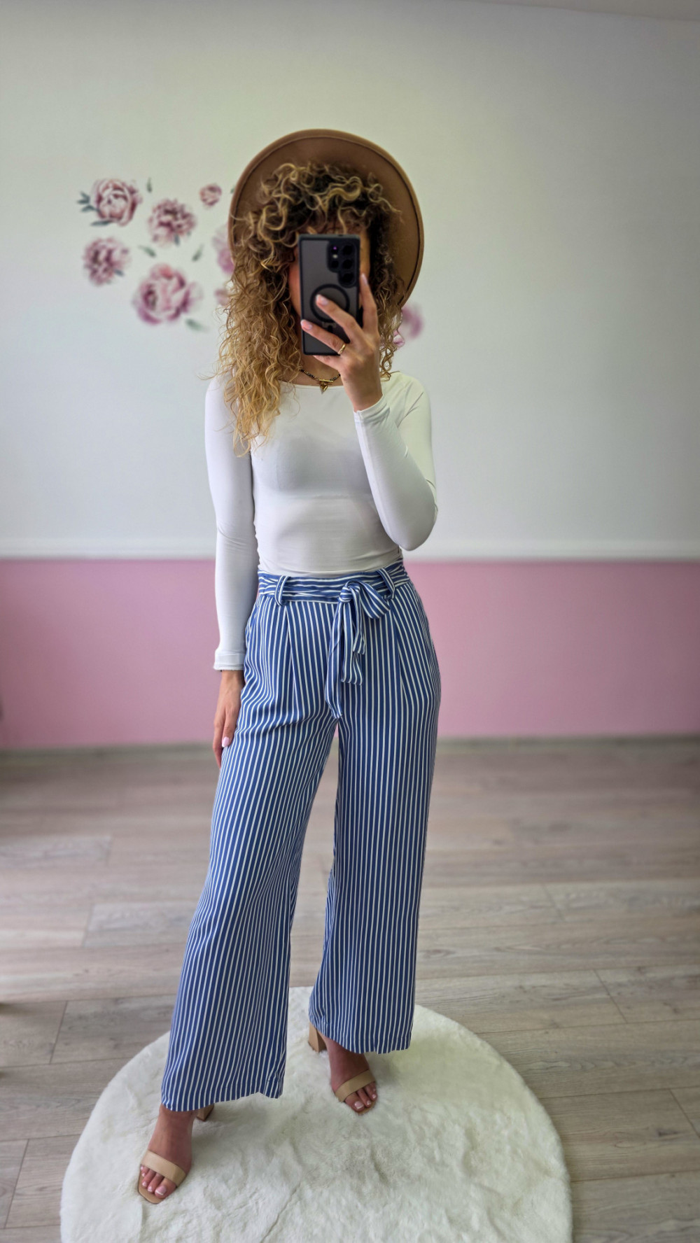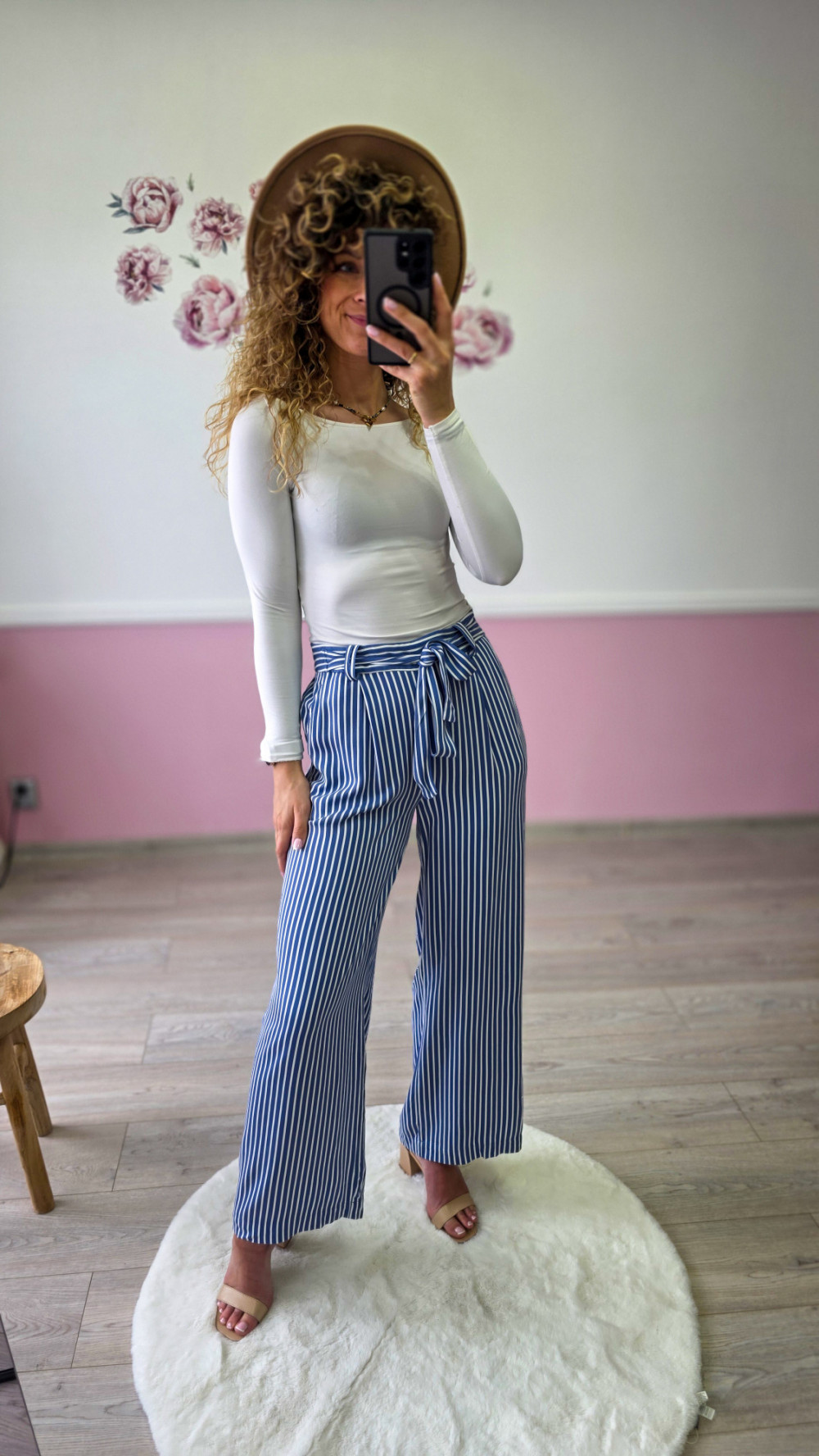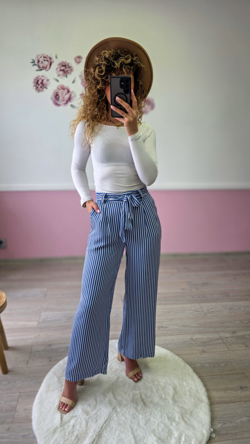 Model z wysokim stanem i szeroką nogawką, który pięknie wydłuża sylwetkę. W talii wiązanie, które podkreśla figurę i dodaje kobiecego charakteru.