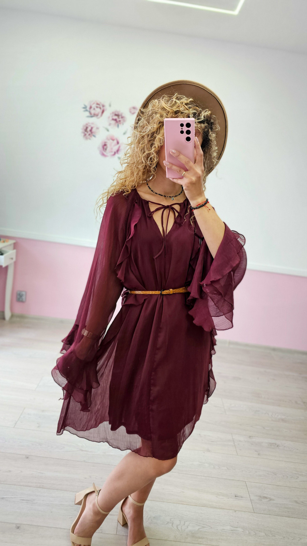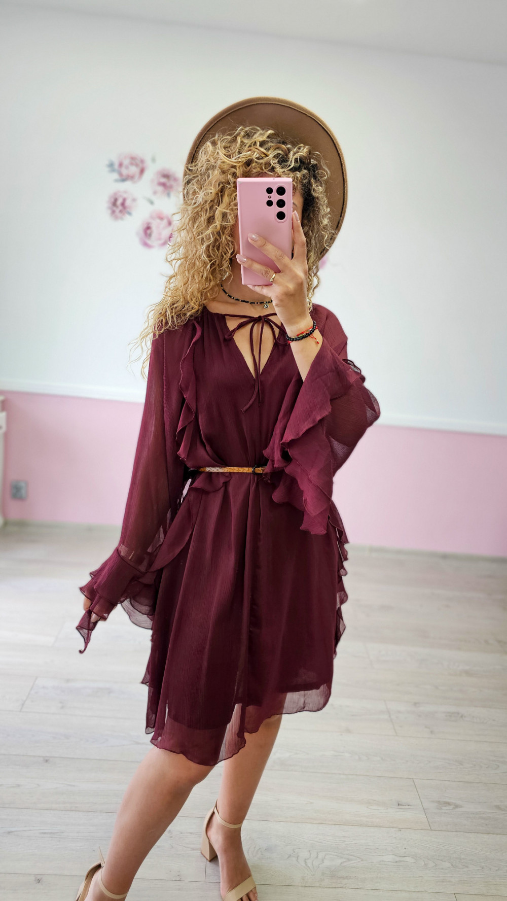 Bordowa sukienka z falbankami
