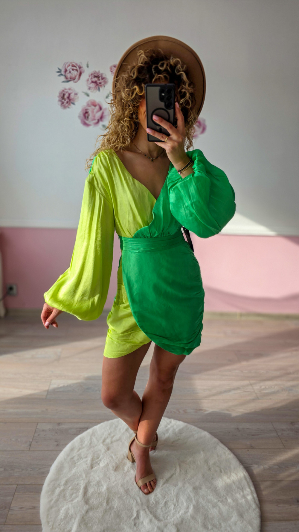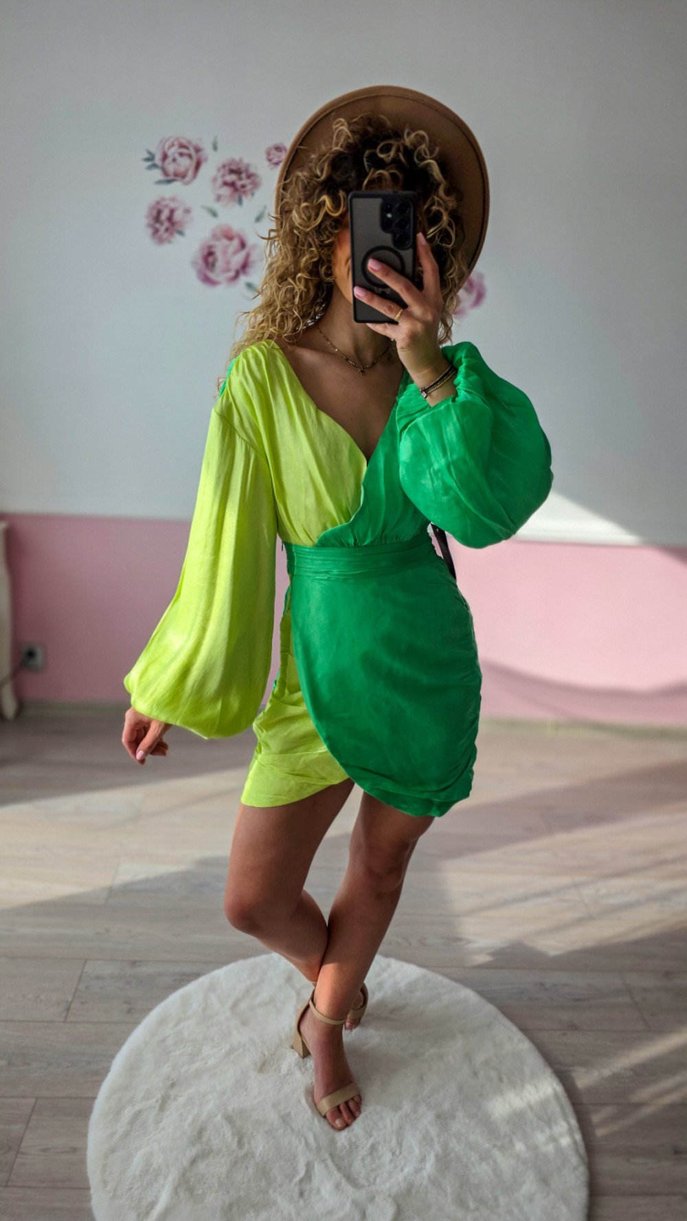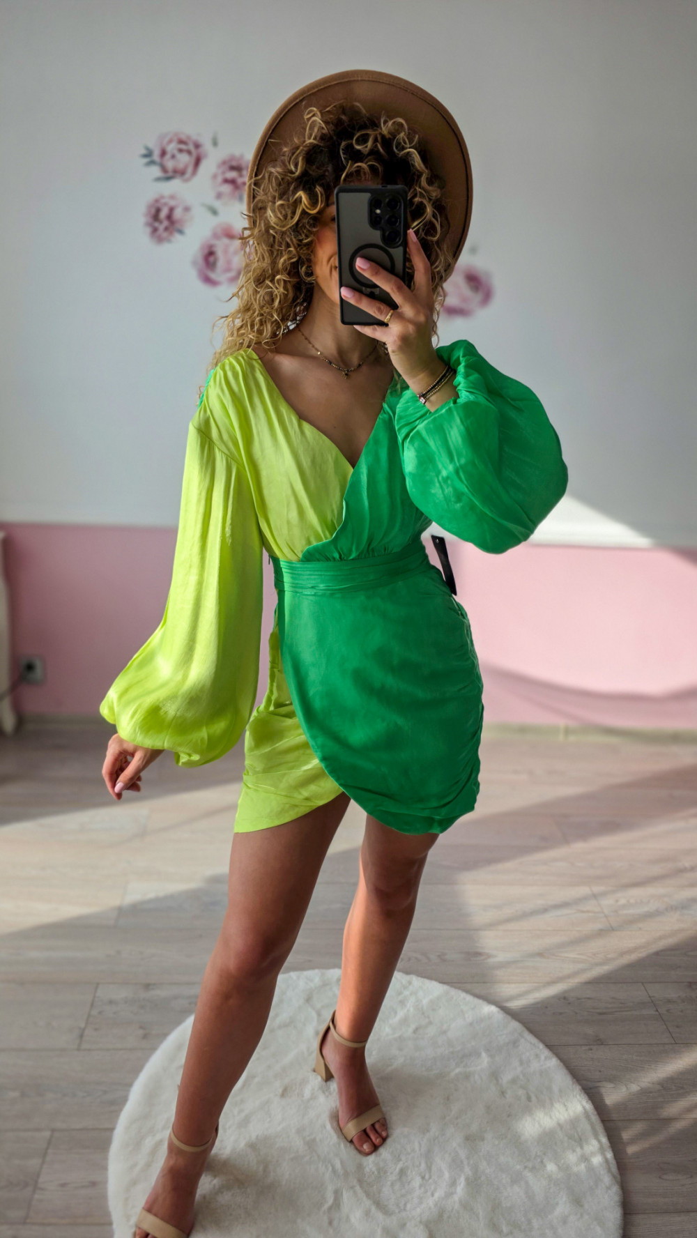 Ta zielona sukienka mini to połączenie kobiecości i wyrazistego designu. Wystarczy dobrać sandały na obcasie lub klasyczne szpilki, aby stworzyć efektowną stylizację, która nie potrzebuje wielu dodatków.