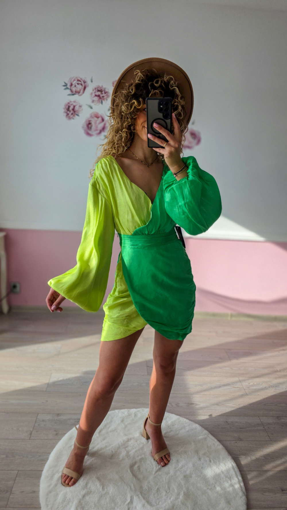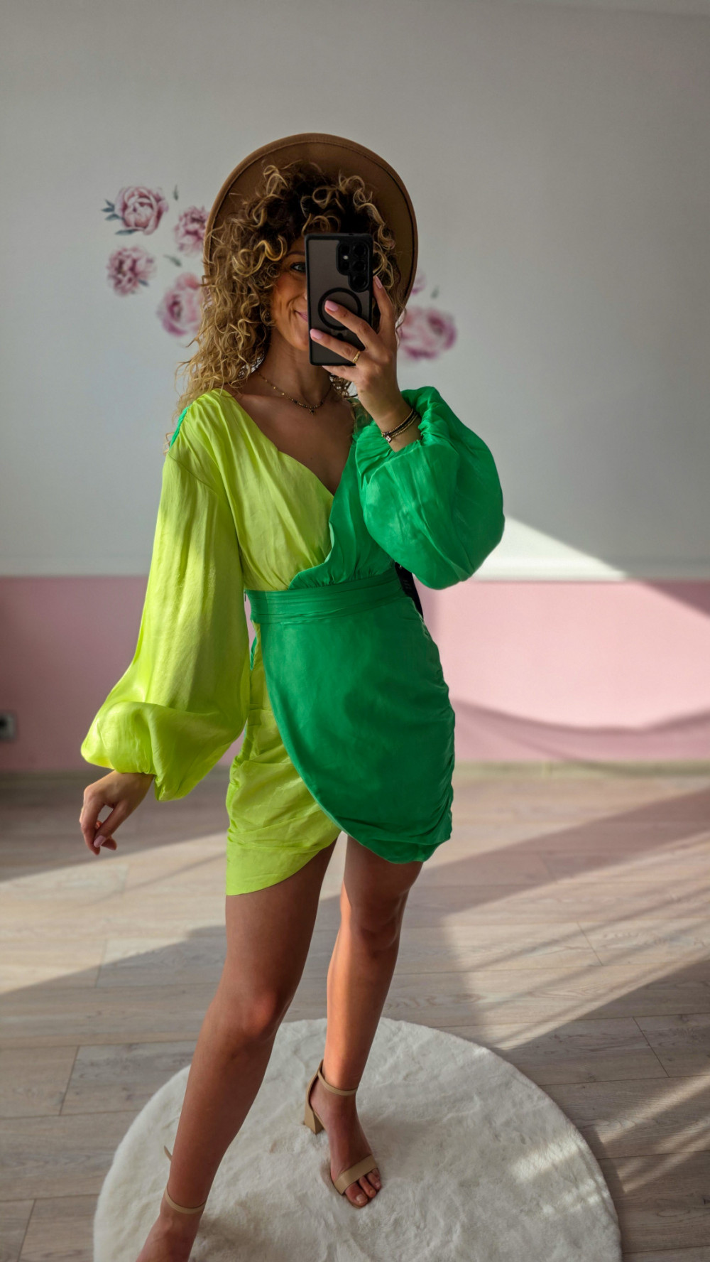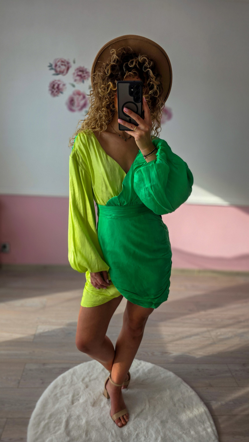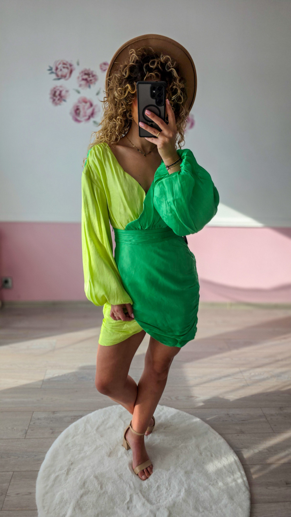 Ta zielona sukienka mini to połączenie kobiecości i wyrazistego designu. Wystarczy dobrać sandały na obcasie lub klasyczne szpilki, aby stworzyć efektowną stylizację, która nie potrzebuje wielu dodatków.