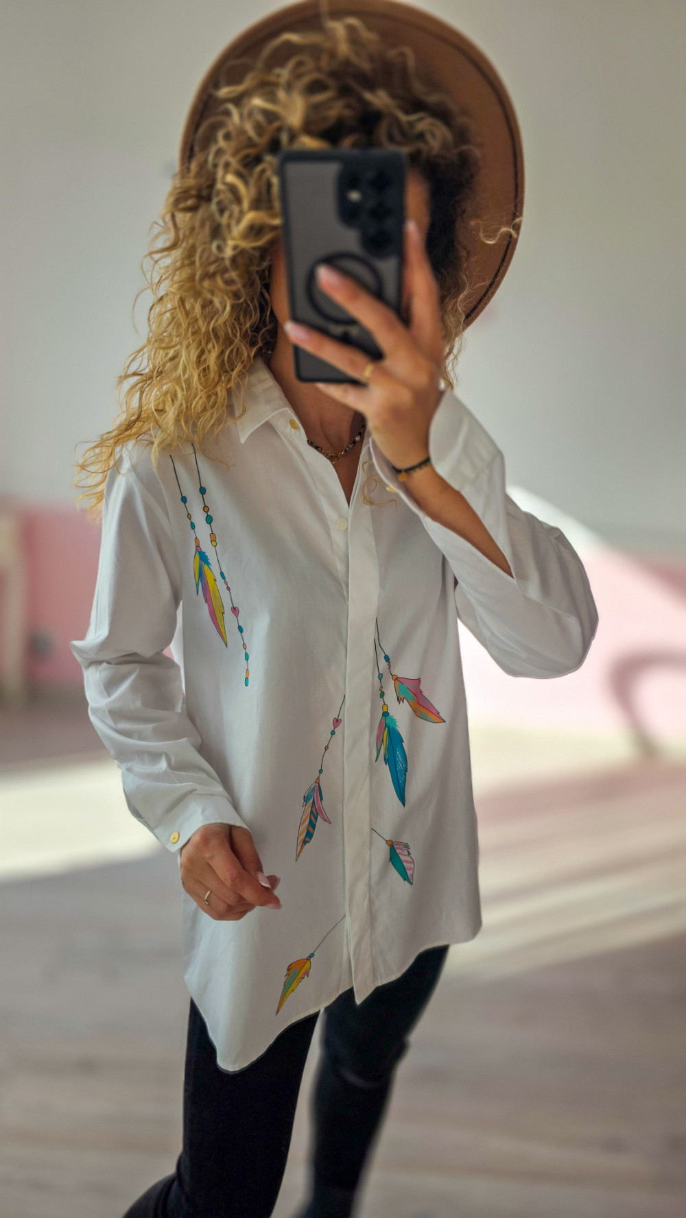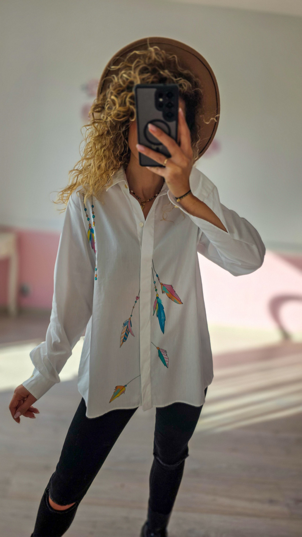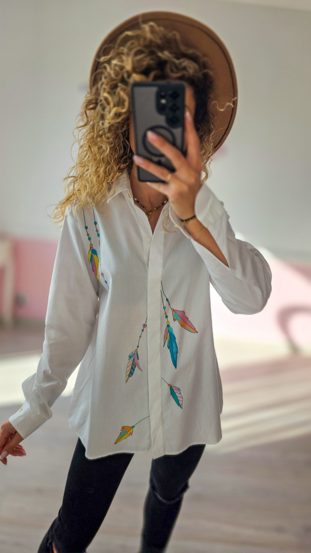 Unikatowa koszula z malowanymi piórami – biała