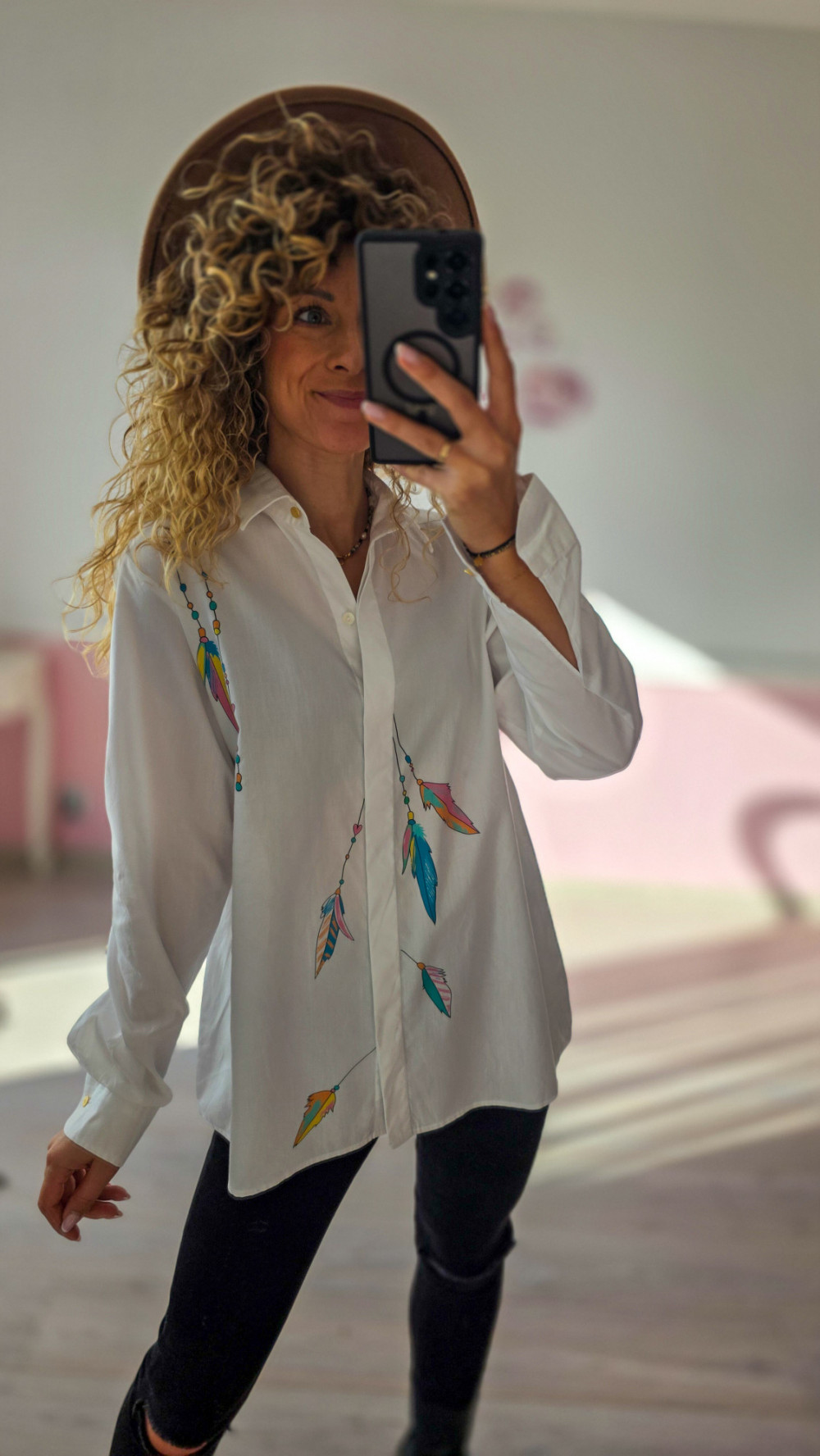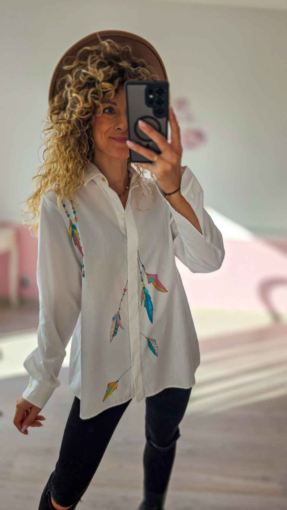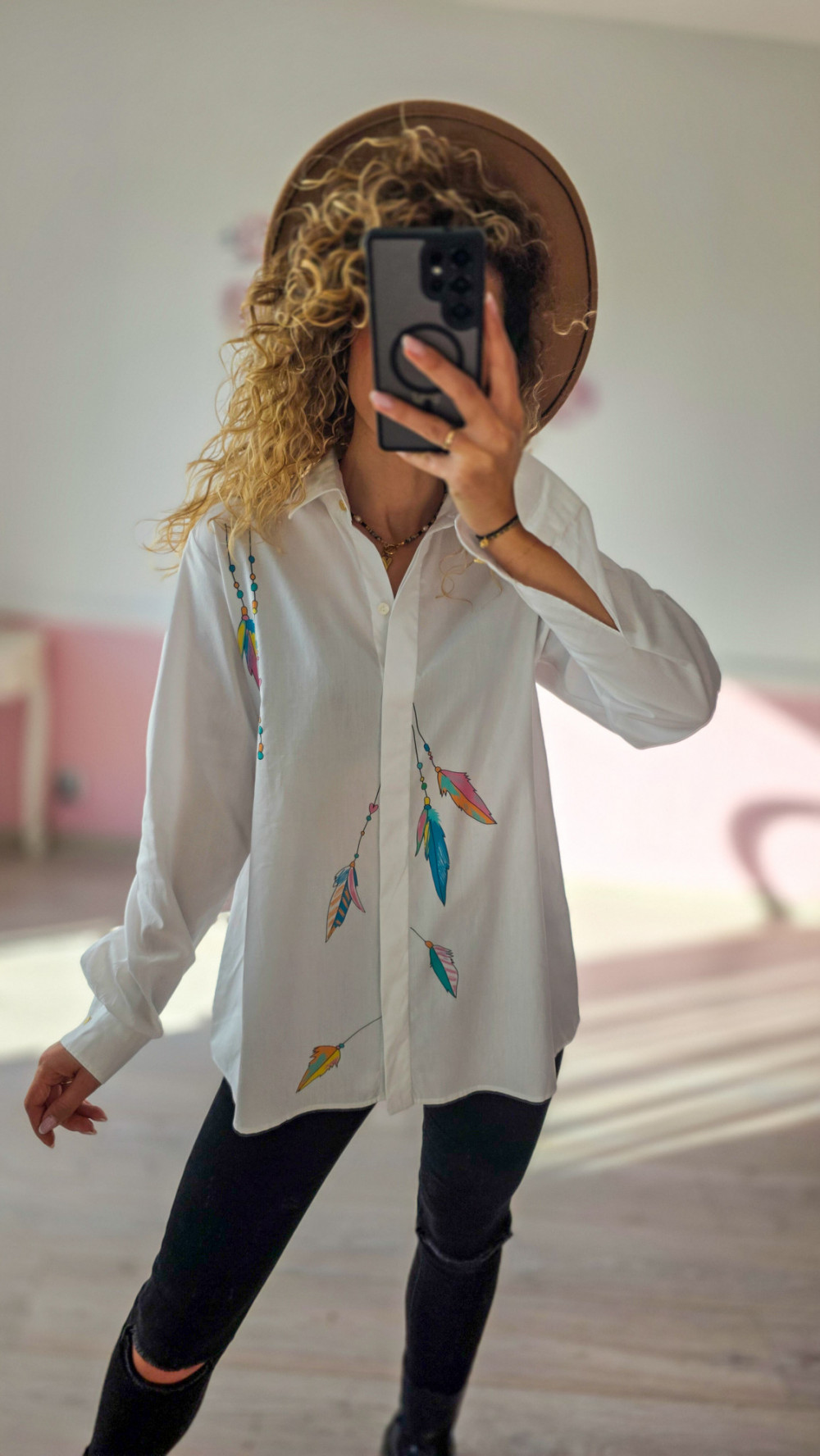 Unikatowa koszula z malowanymi piórami – biała