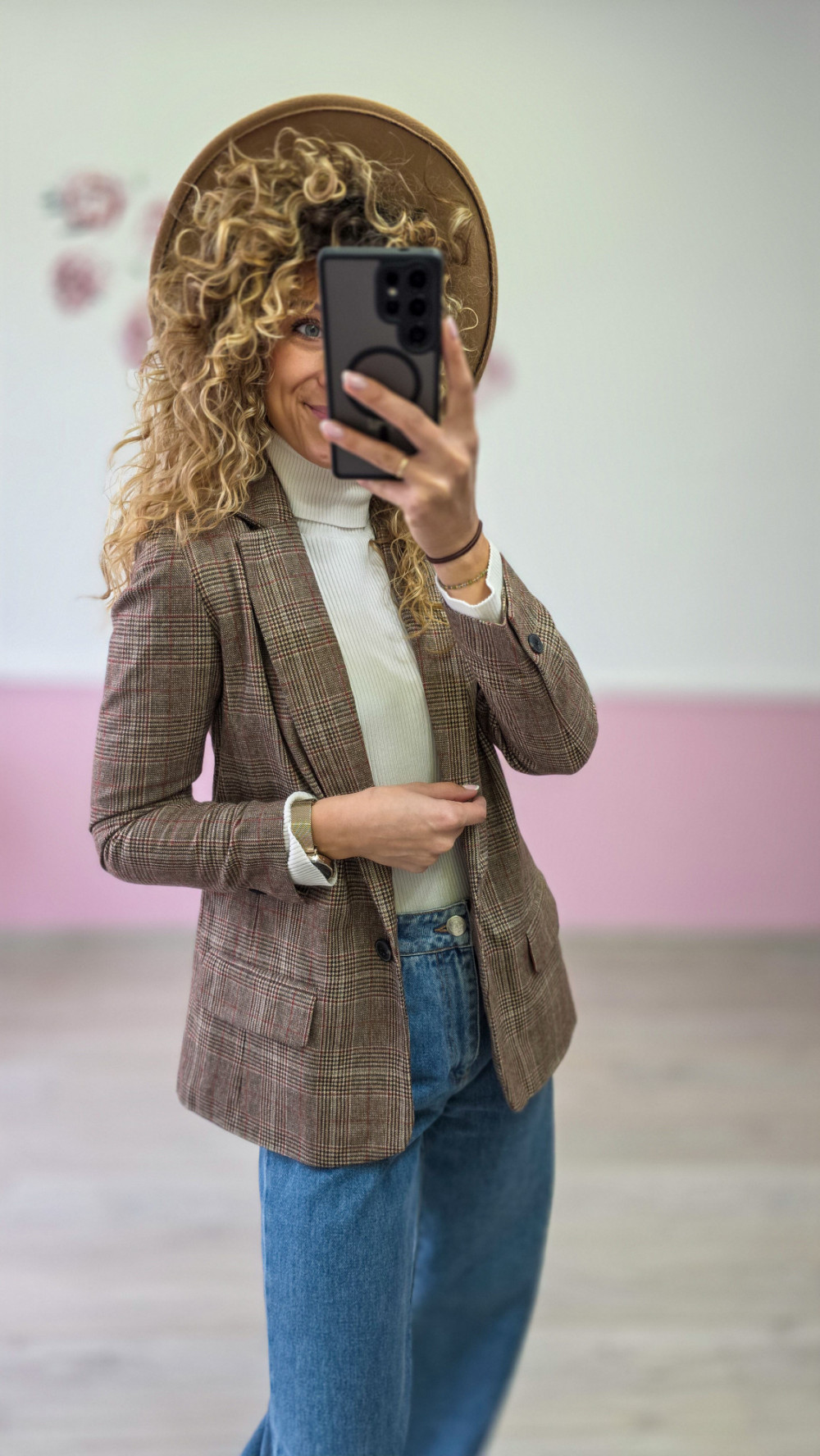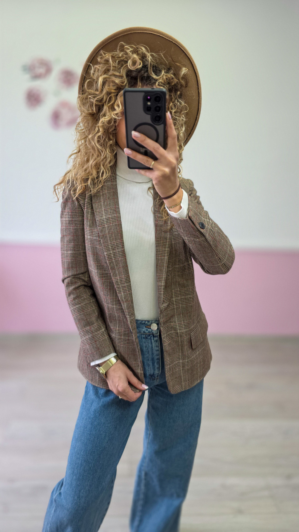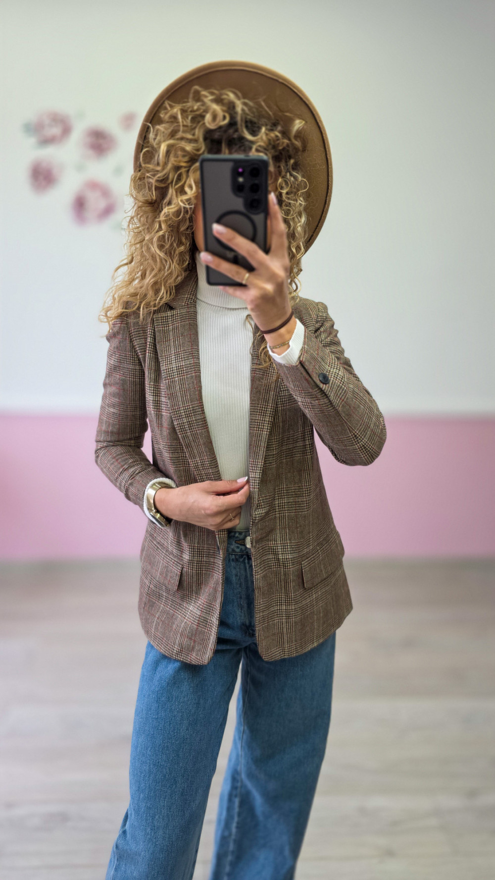 Stylowa brązowa marynarka w kratę to ponadczasowy element garderoby, który doda elegancji każdej stylizacji. Klasyczny fason z dopasowanym krojem pięknie podkreśla sylwetkę, a wzór w kratę nadaje jej szykownego, jesiennego charakteru. Świetnie prezentuje się w połączeniu z jeansami, golfem lub elegancką koszulą. To idealna propozycja zarówno do pracy, jak i na co dzień dla kobiet ceniących styl i wygodę.