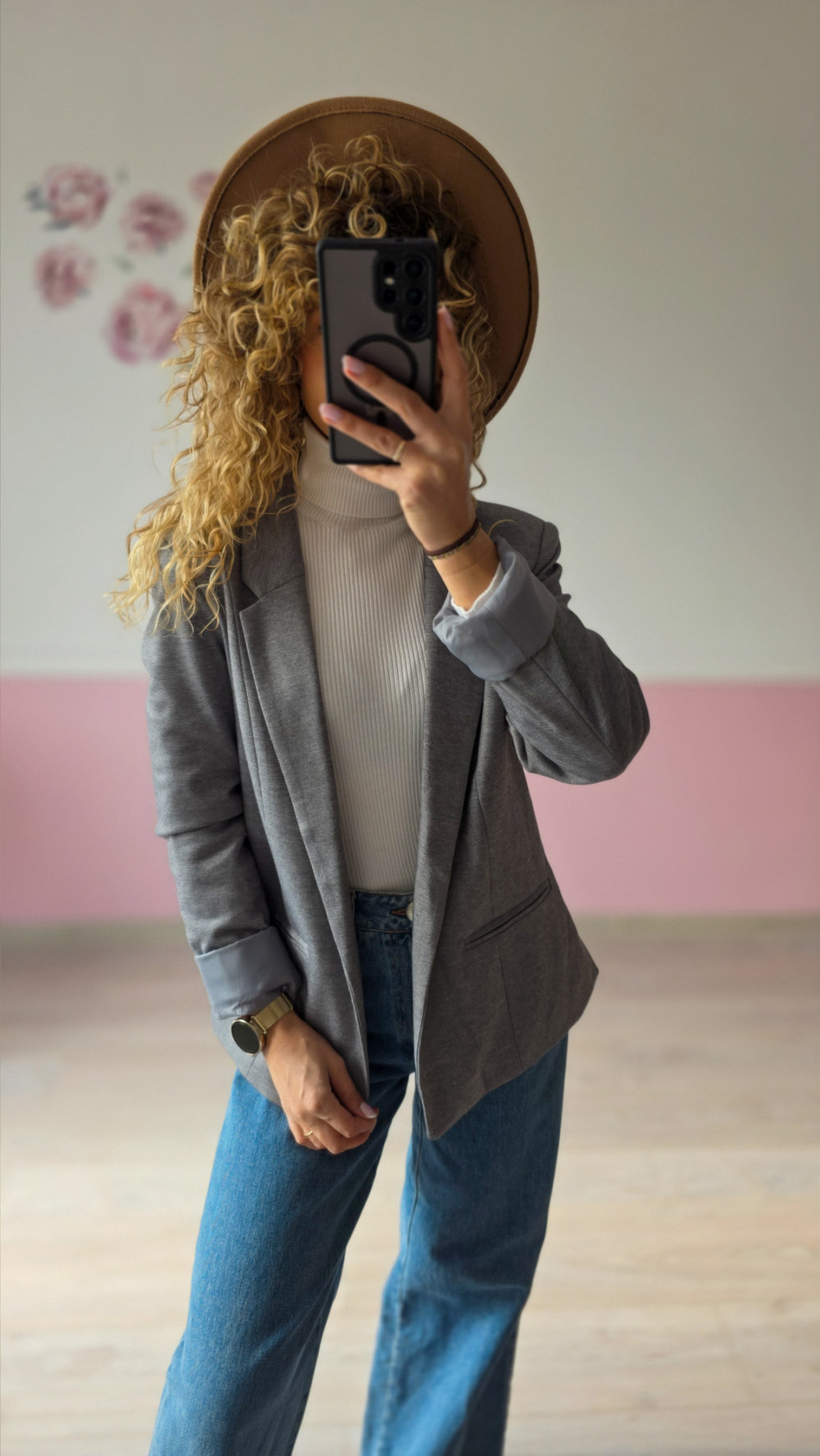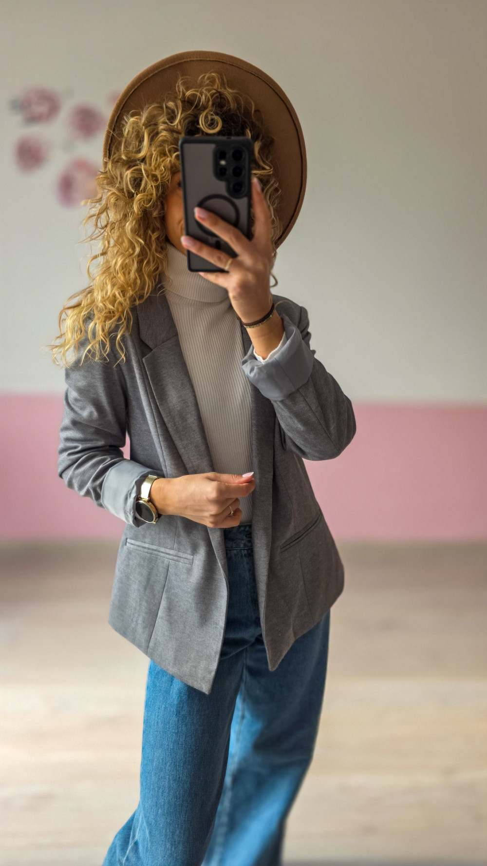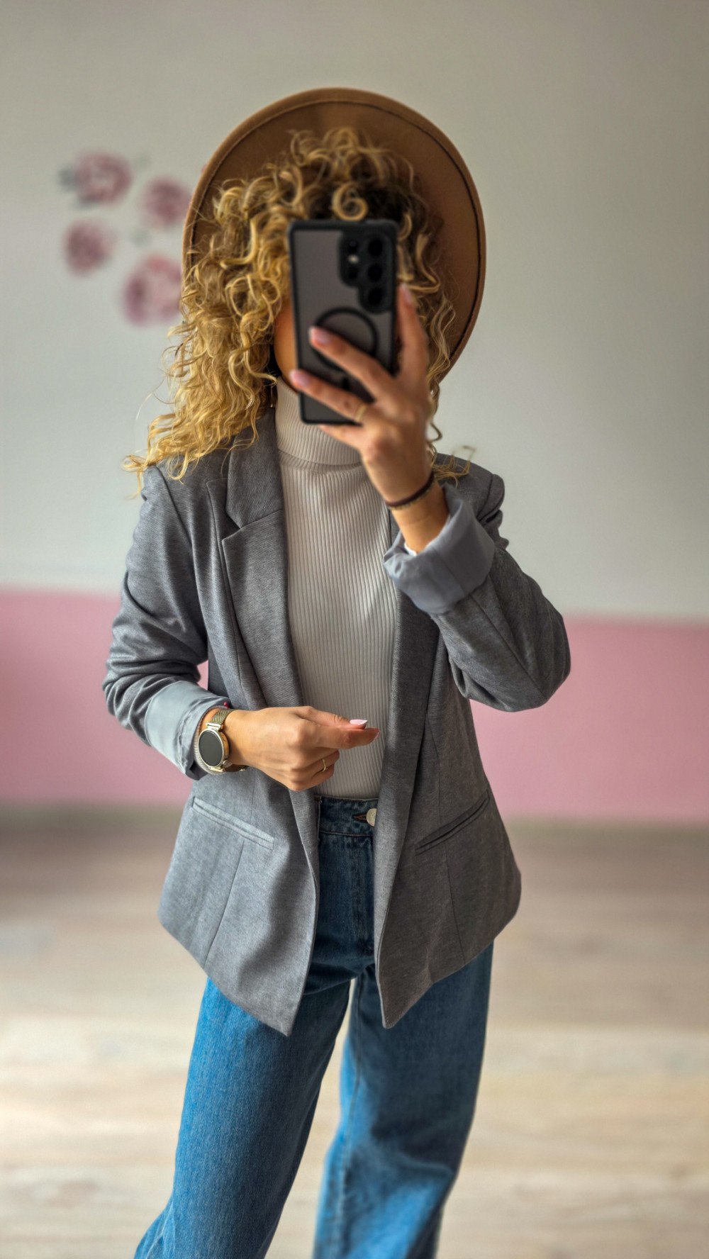 Klasyczny szary żakiet damski to must-have w szafie każdej kobiety. Uniwersalny kolor i ponadczasowy krój sprawiają, że pasuje do wszystkiego – od jeansów po eleganckie spodnie i sukienki. Delikatnie taliowany fason podkreśla sylwetkę, zachowując jednocześnie pełen komfort noszenia. Idealny wybór do pracy, spotkań lub codziennych stylizacji, gdy chcesz wyglądać schludnie i stylowo.