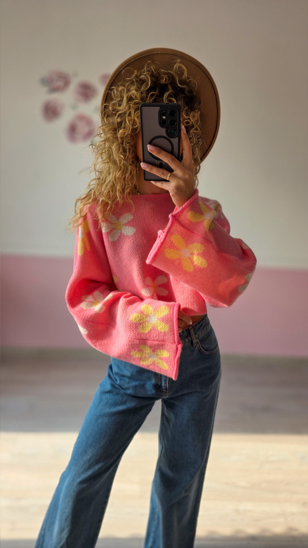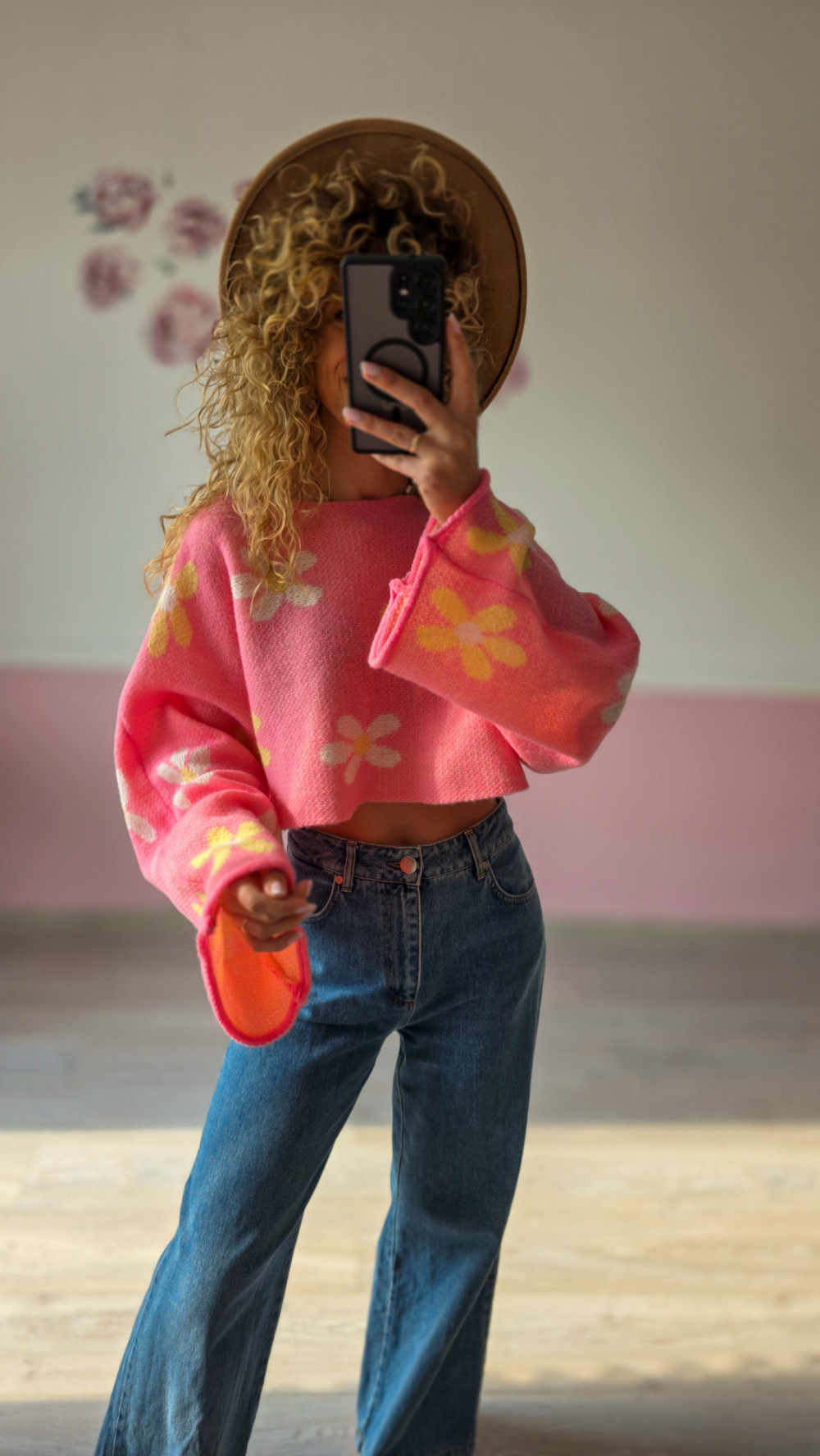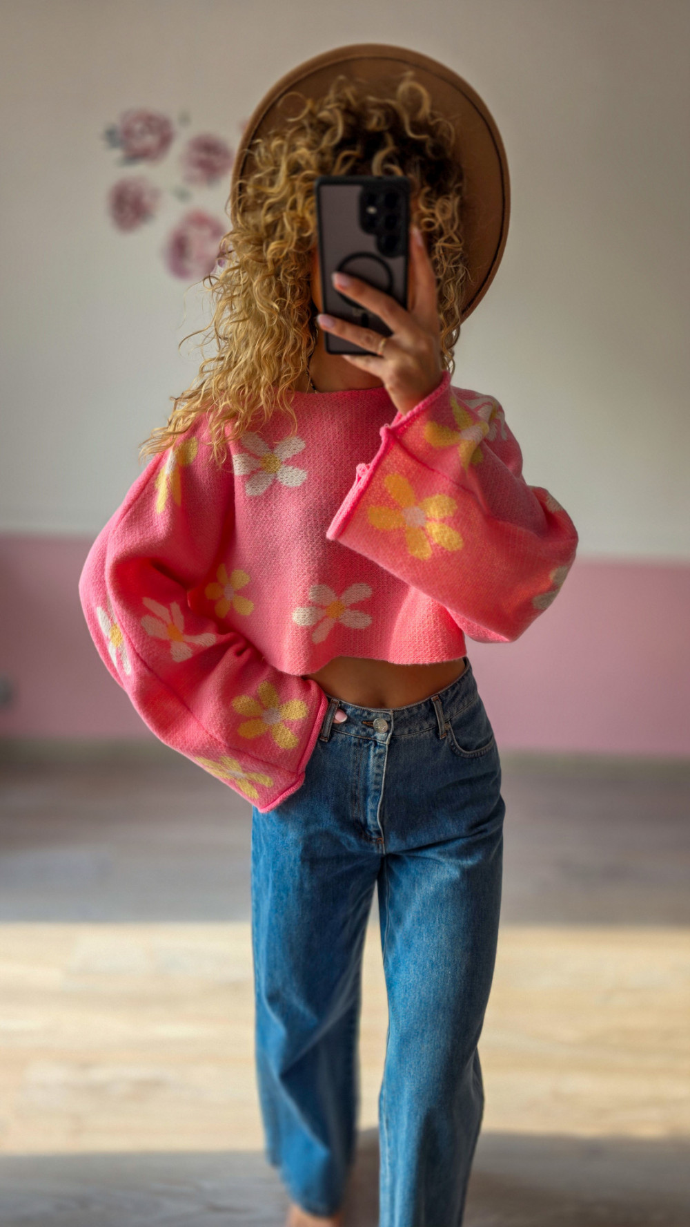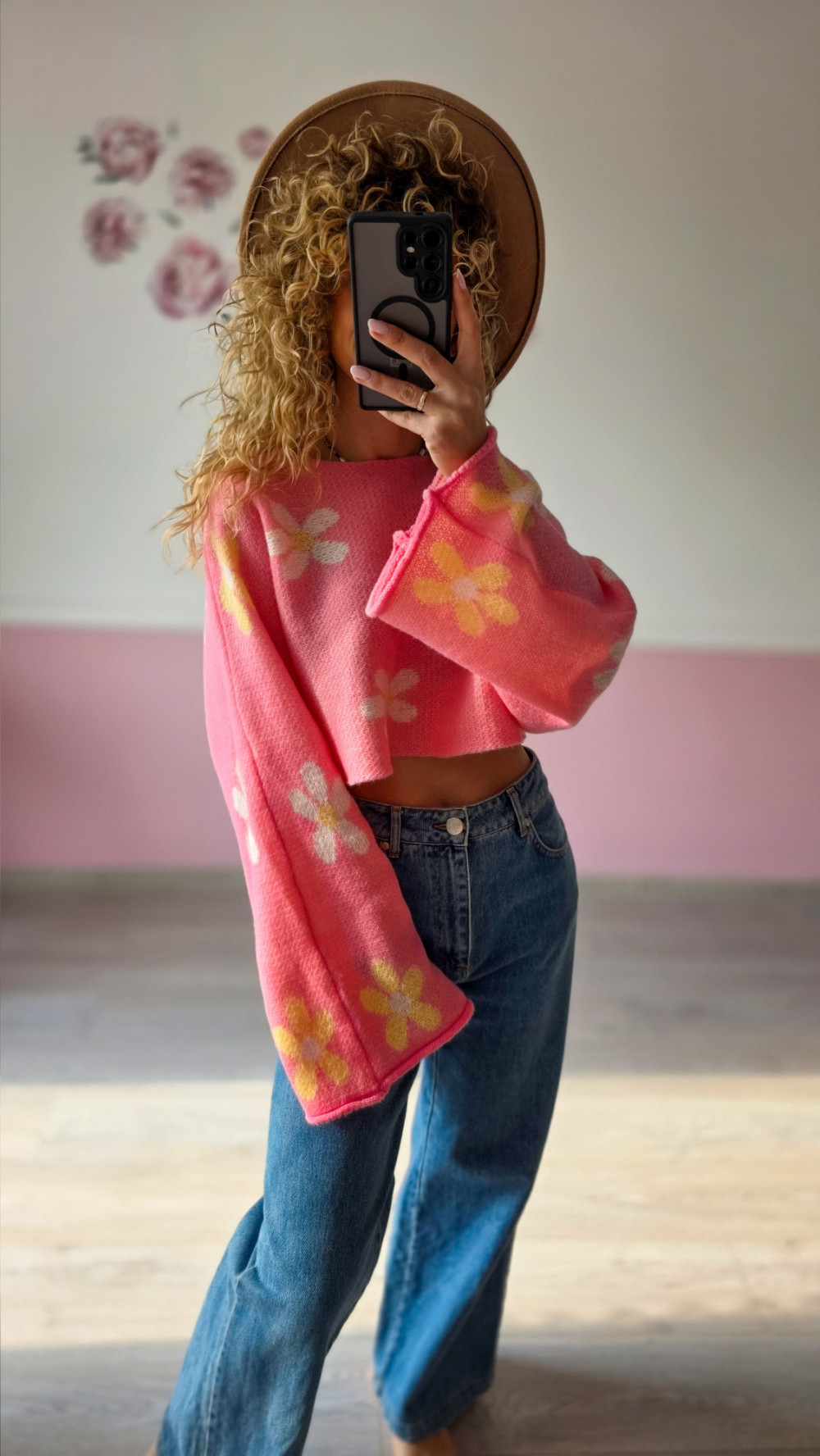Różowy krótki sweter z kwiatowym wzorem