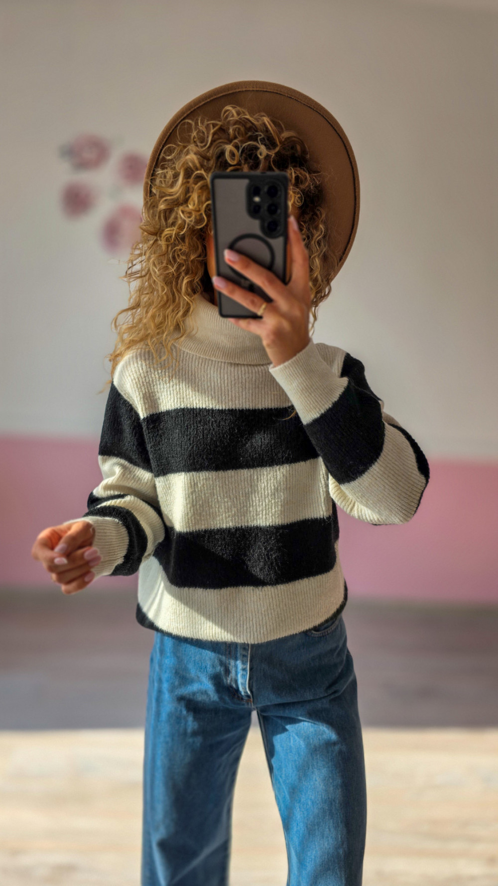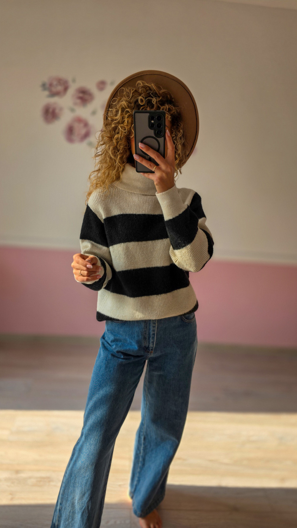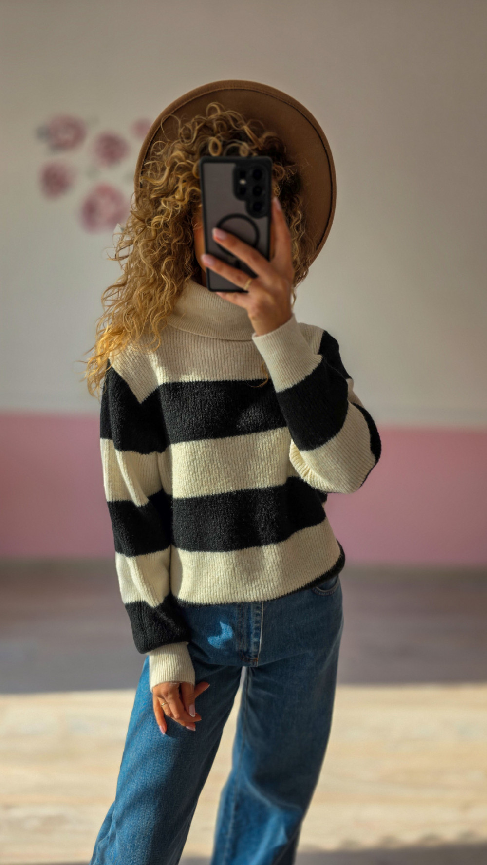 Modny sweter w czarno-białe pasy to klasyk, który nigdy nie wychodzi z mody. Miękka dzianina i luźny krój sprawiają, że jest niezwykle wygodny i idealny na chłodniejsze dni. Golf dodaje mu elegancji i sprawia, że świetnie prezentuje się zarówno w casualowych, jak i bardziej stylowych zestawieniach. To doskonały wybór na jesień i zimę dla kobiet ceniących komfort i ponadczasowy styl.
