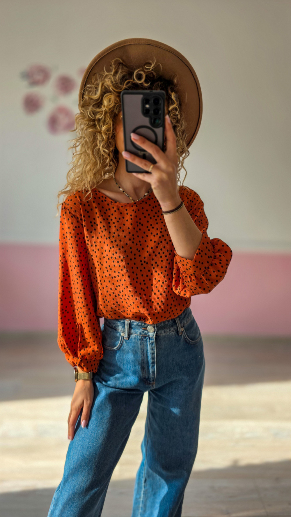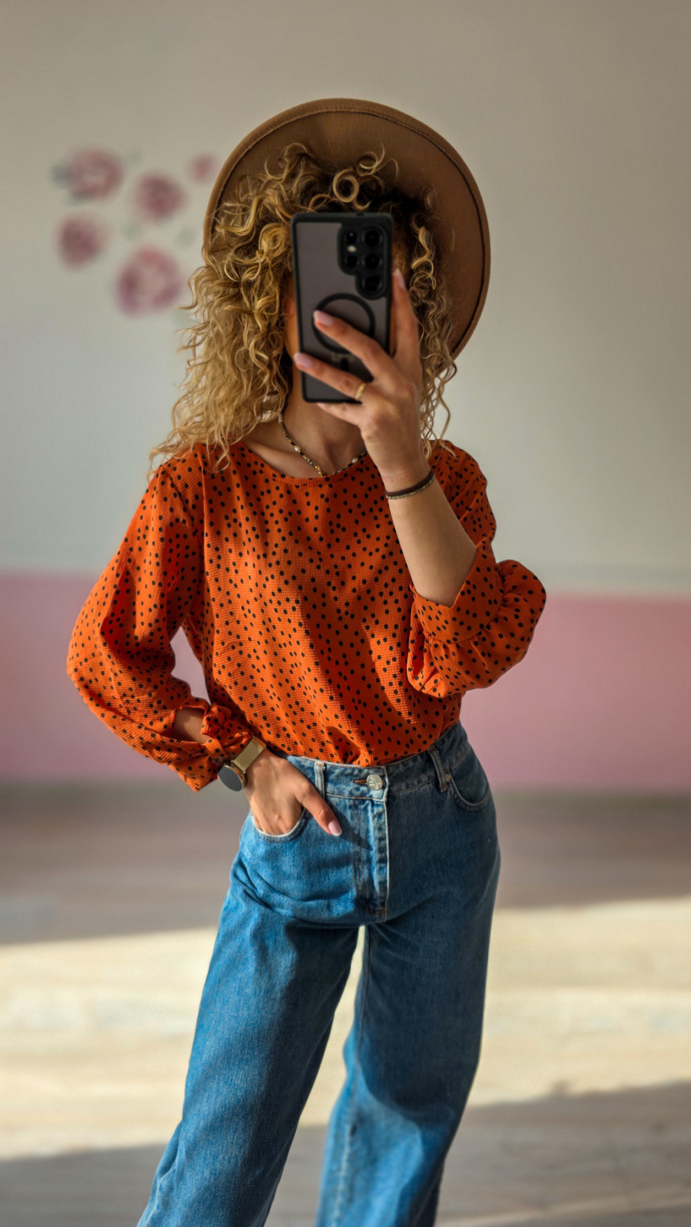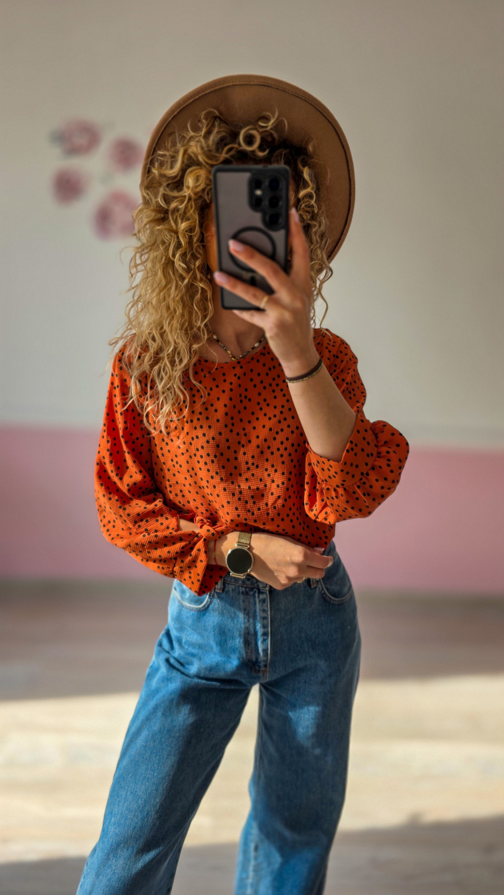 Bluzka, która łączy w sobie energię i kobiecość! Intensywny pomarańczowy kolor z subtelnym wzorem czarnych kropek dodaje stylizacji charakteru. Lekko bufiaste rękawy zakończone wiązaniem sprawiają, że wygląda lekko i romantycznie. Idealna do jeansów, spódnic czy eleganckich spodni — sprawdzi się zarówno do pracy, jak i na spotkanie z przyjaciółmi.