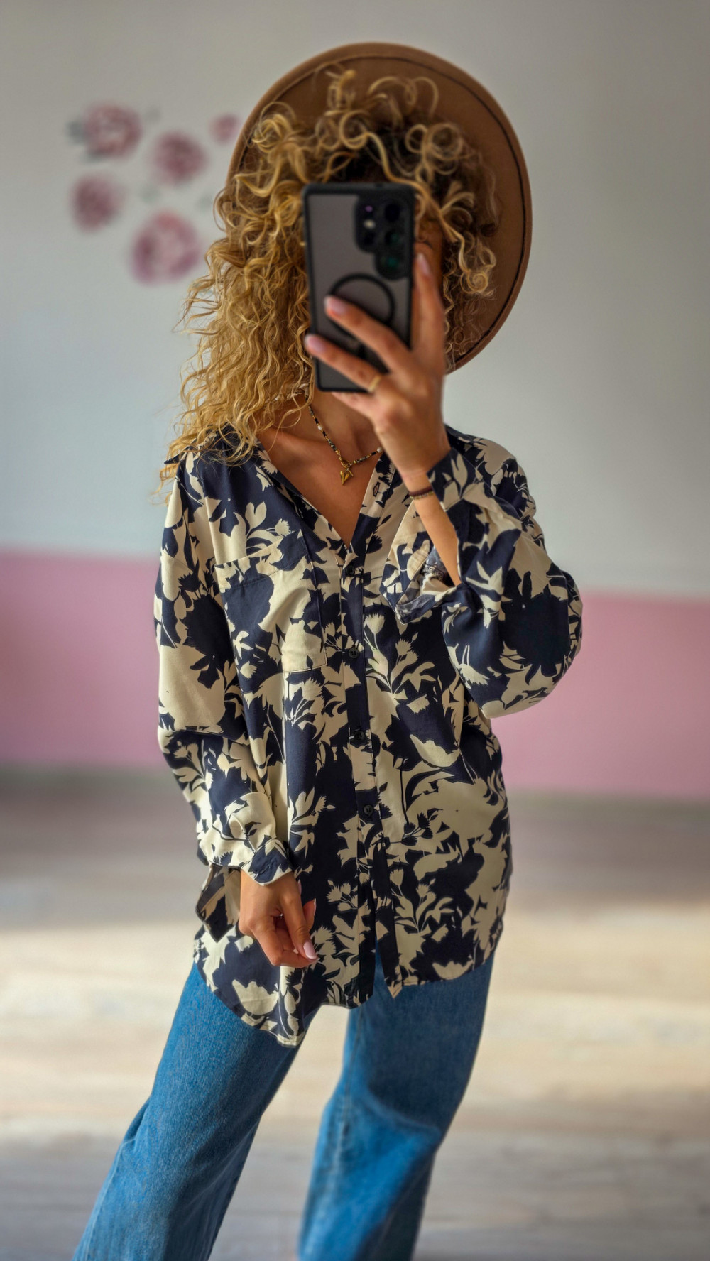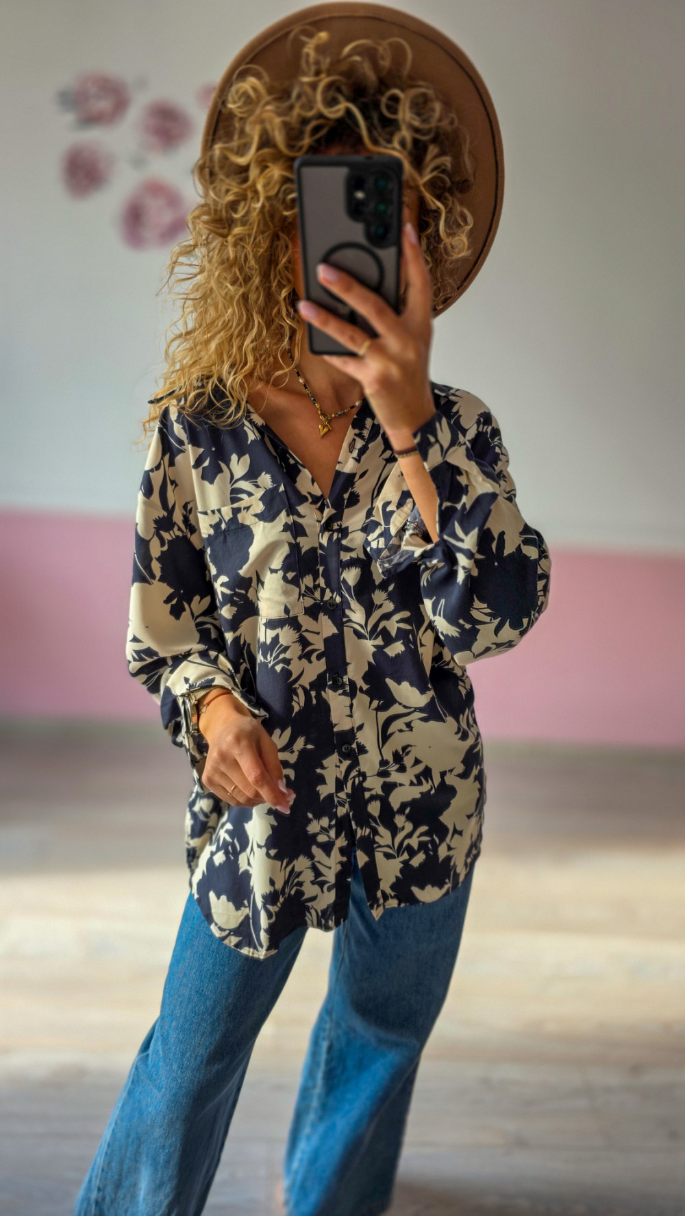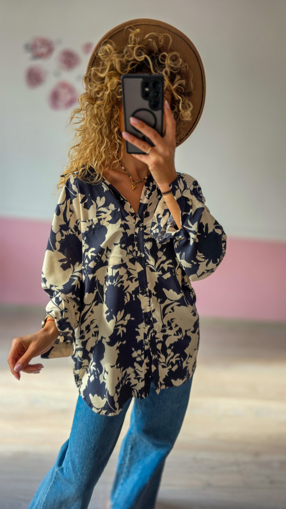 Koszula o luźnym kroju, która zachwyca delikatnym, roślinnym wzorem w kolorach granatu i beżu. Lekka, przewiewna tkanina pięknie układa się na sylwetce, a klasyczny kołnierzyk dodaje jej elegancji. Możesz ją nosić zarówno wpuszczoną w spodnie, jak i luźno — w zależności od okazji. Doskonała baza do stylizacji w duchu „smart casual”.