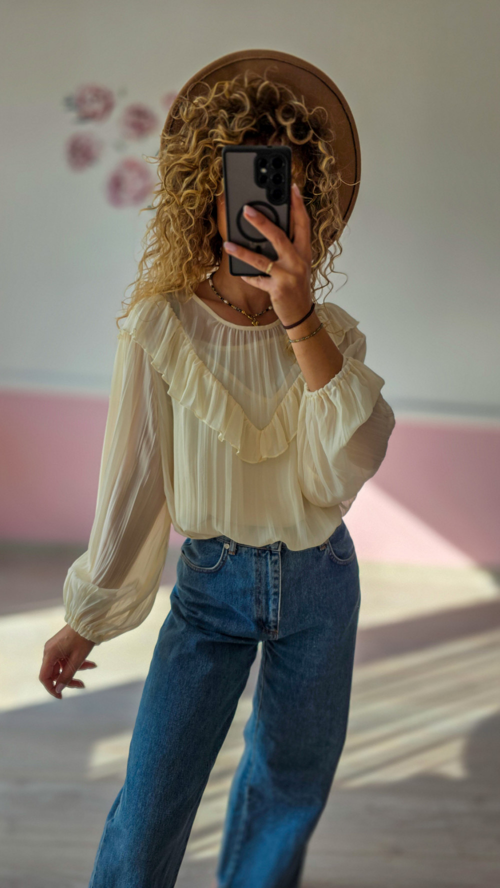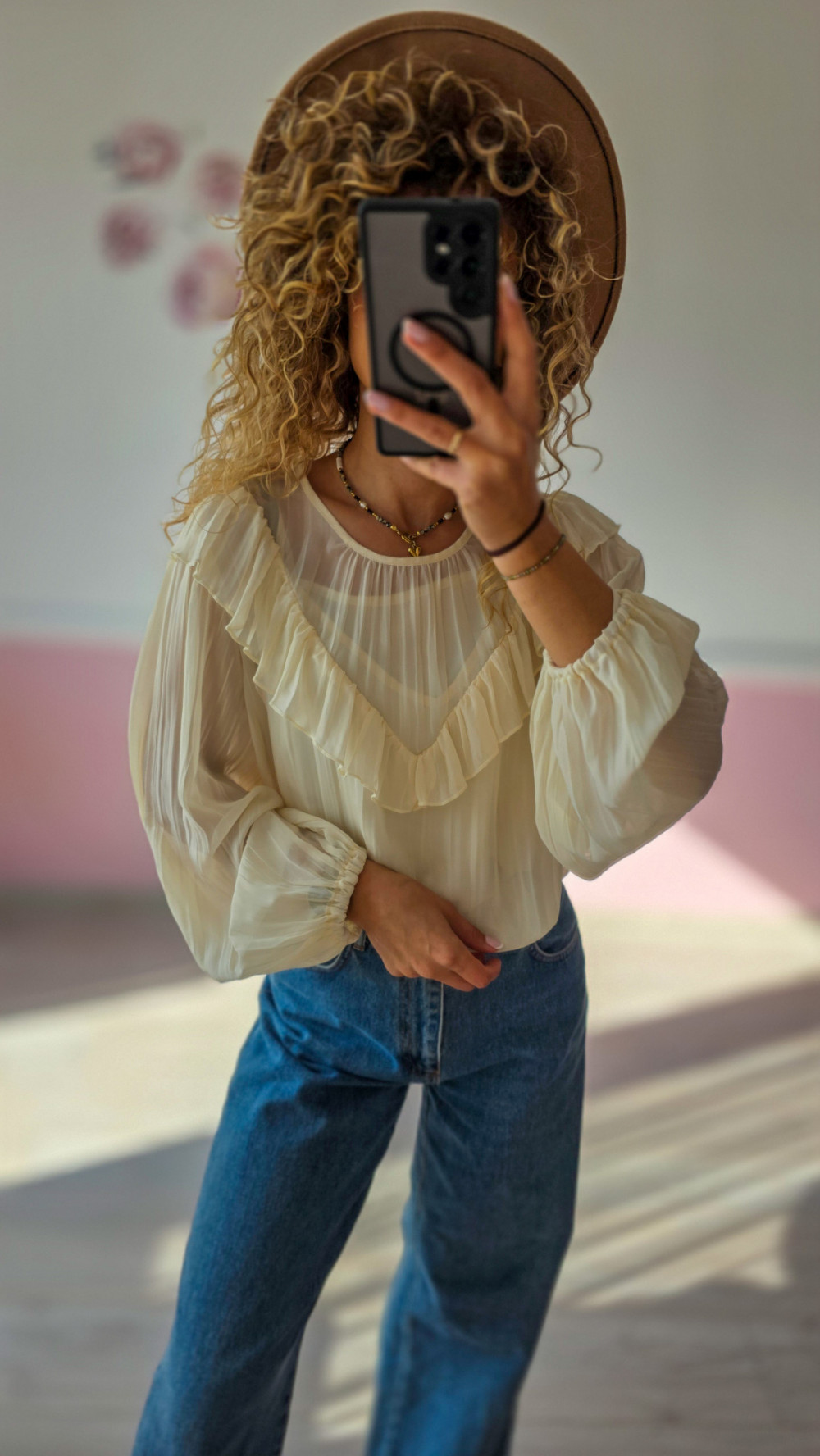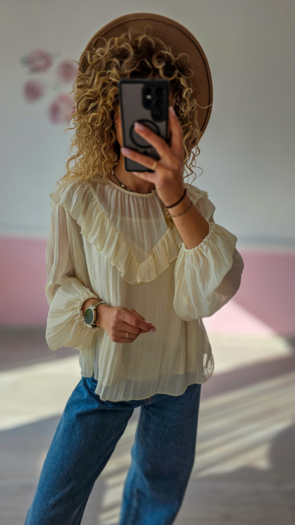 Romantyczna, lekka bluzka w kremowym kolorze, która zachwyca subtelnym plisowaniem i uroczą falbaną w kształcie litery V. Delikatnie prześwitująca tkanina nadaje jej kobiecego wdzięku, a luźny krój sprawia, że jest niezwykle komfortowa w noszeniu. Idealna na wyjątkowe okazje, ale też do codziennych stylizacji, gdy chcesz poczuć się wyjątkowo.
