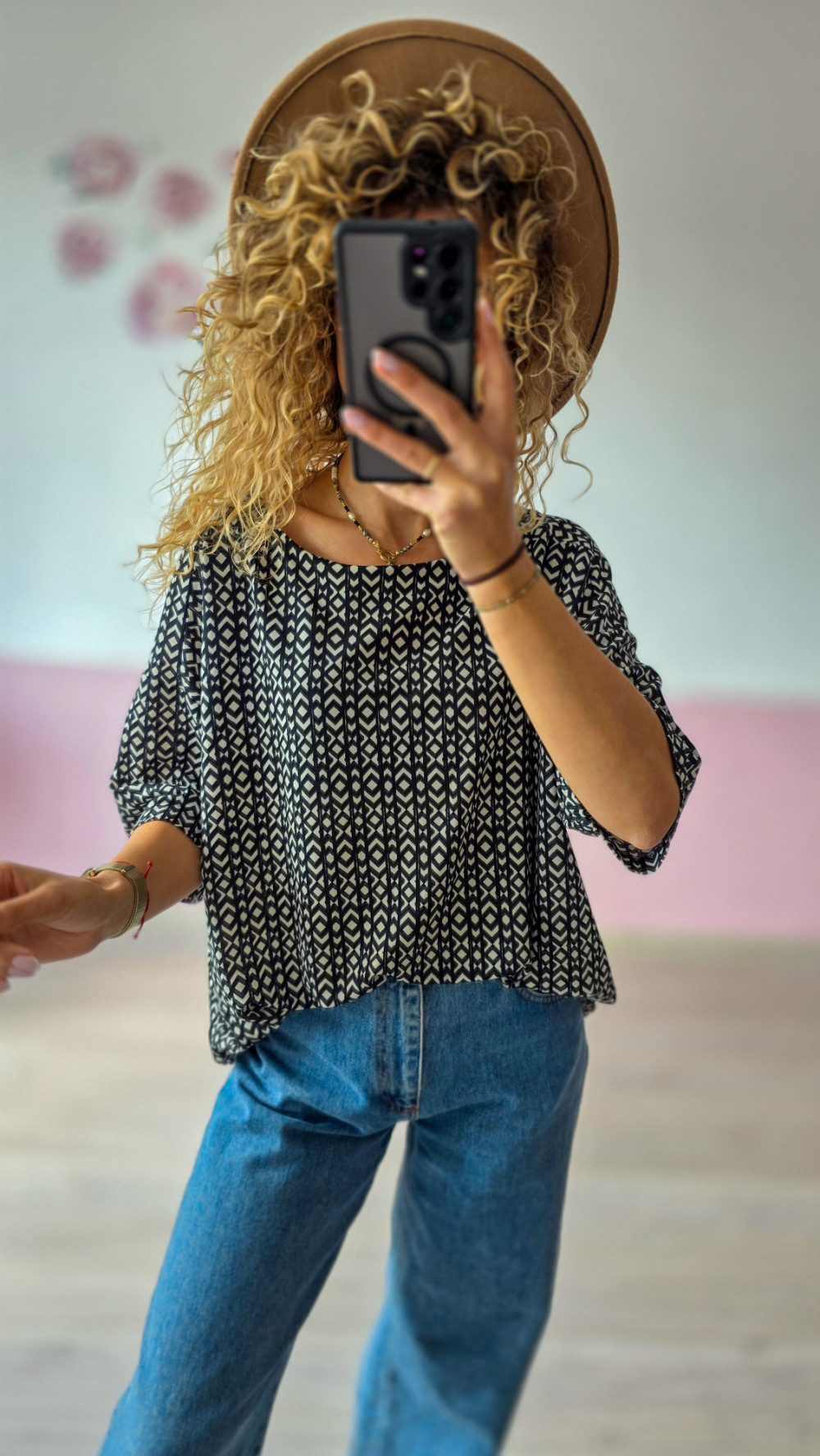Nowoczesna i stylowa bluzka o luźnym fasonie, ozdobiona subtelnym, geometrycznym wzorem w kolorze ecru. Wykonana z przyjemnej, lejącej tkaniny, zapewnia pełen komfort noszenia i świetnie sprawdza się w codziennych stylizacjach. Idealna zarówno do pracy, jak i na co dzień — z jeansami, cygaretkami czy spódnicą. Minimalistyczna, a jednocześnie wyrazista — dokładnie taka, jakiej potrzebujesz!
