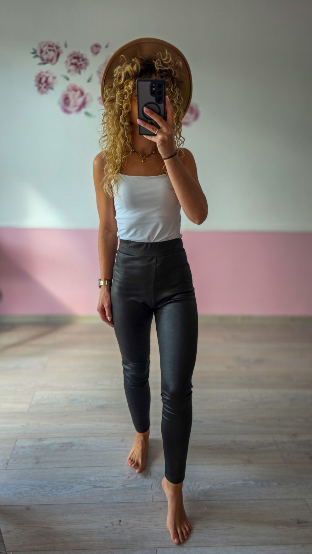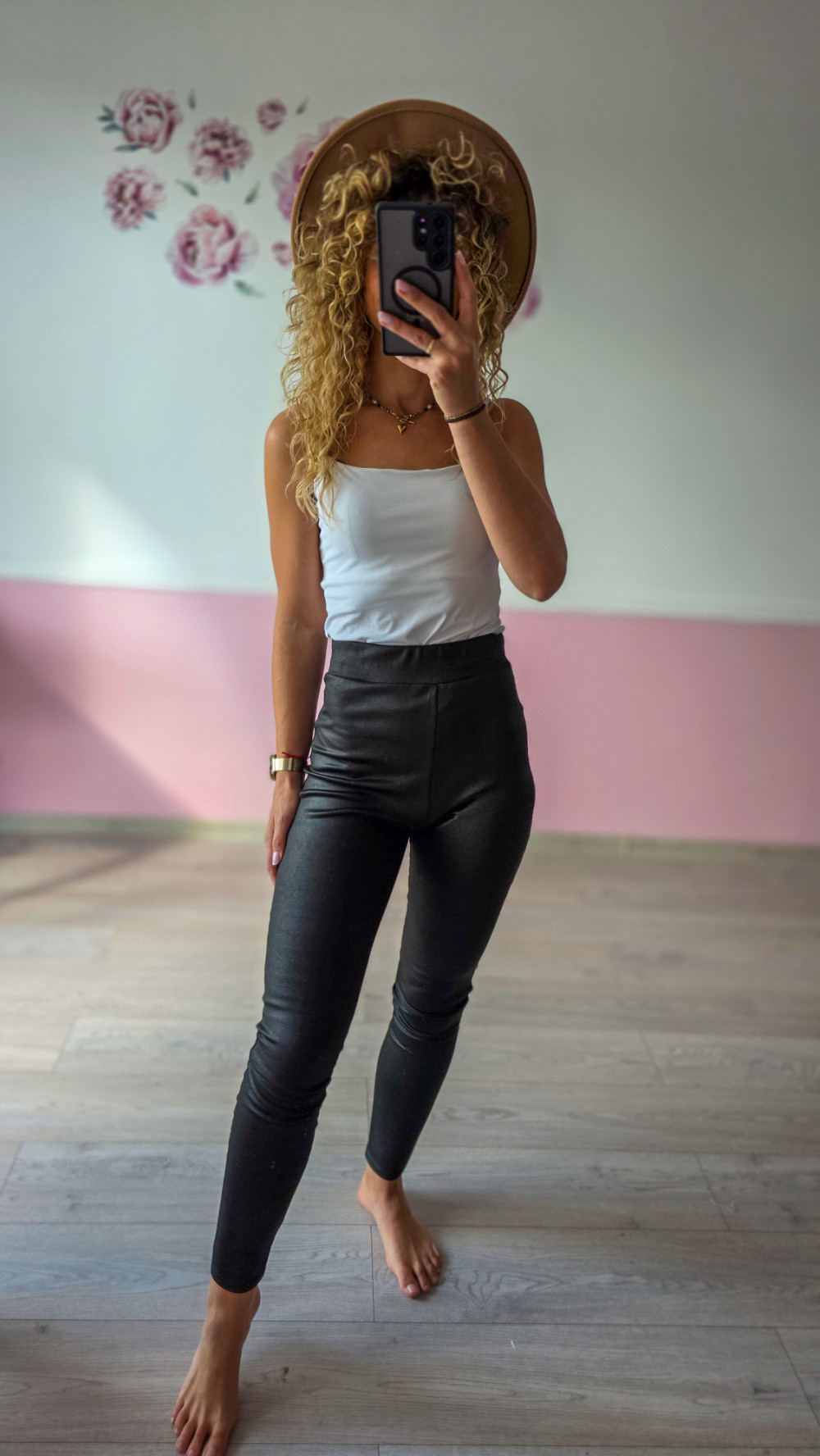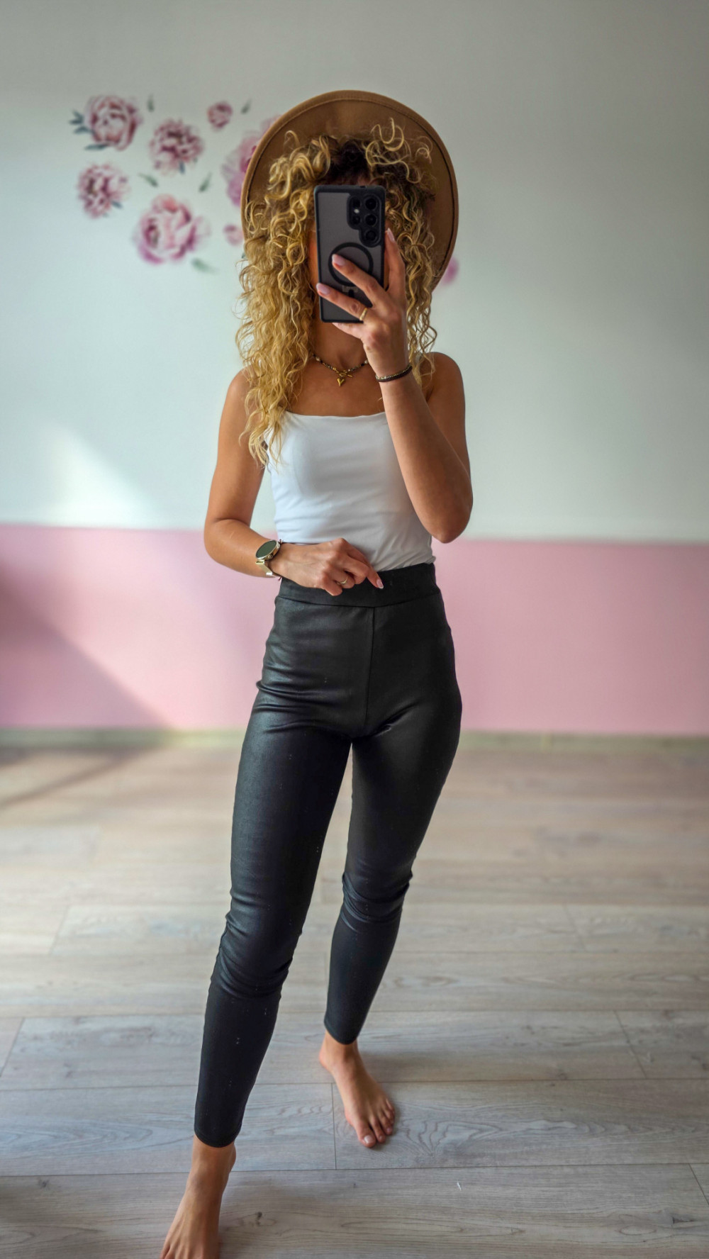 Czarne legginsy z wysokim stanem – modelująca talia i połyskujące wykończenie