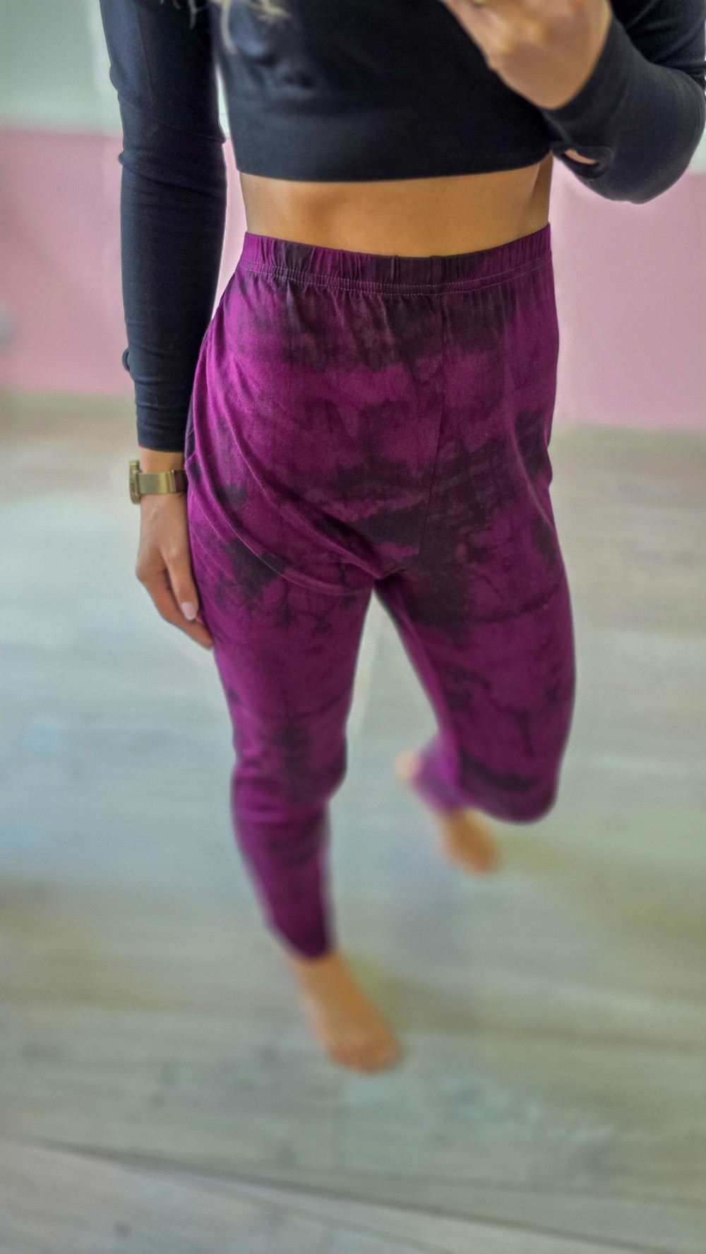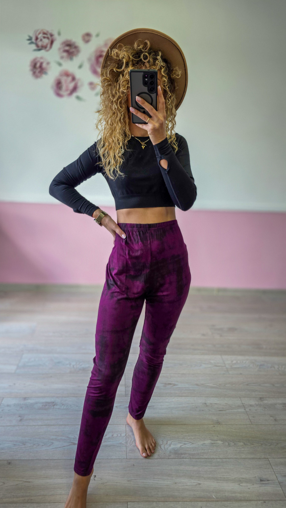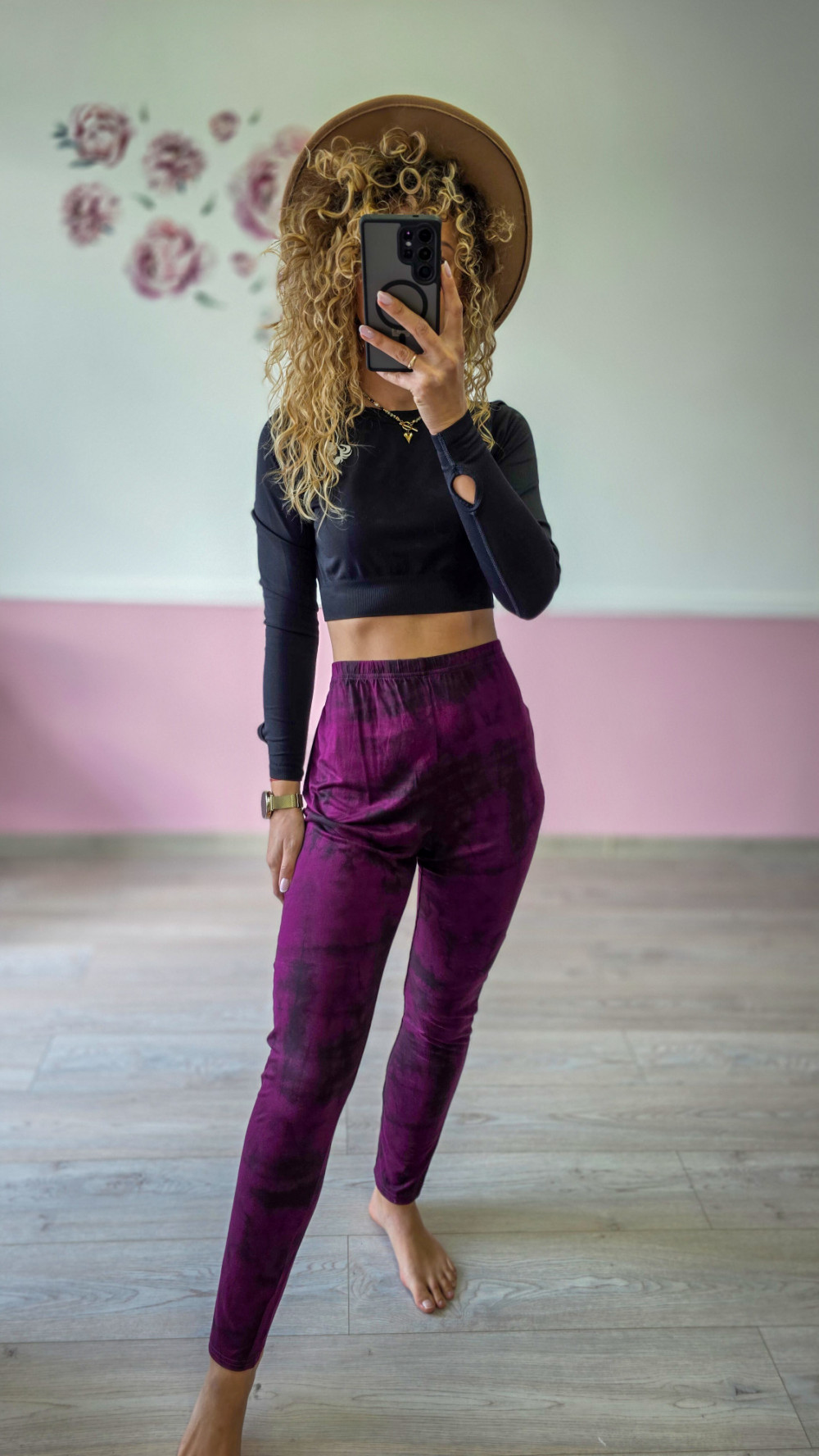 Fioletowe legginsy tie-dye – modny wzór i wygoda na co dzień