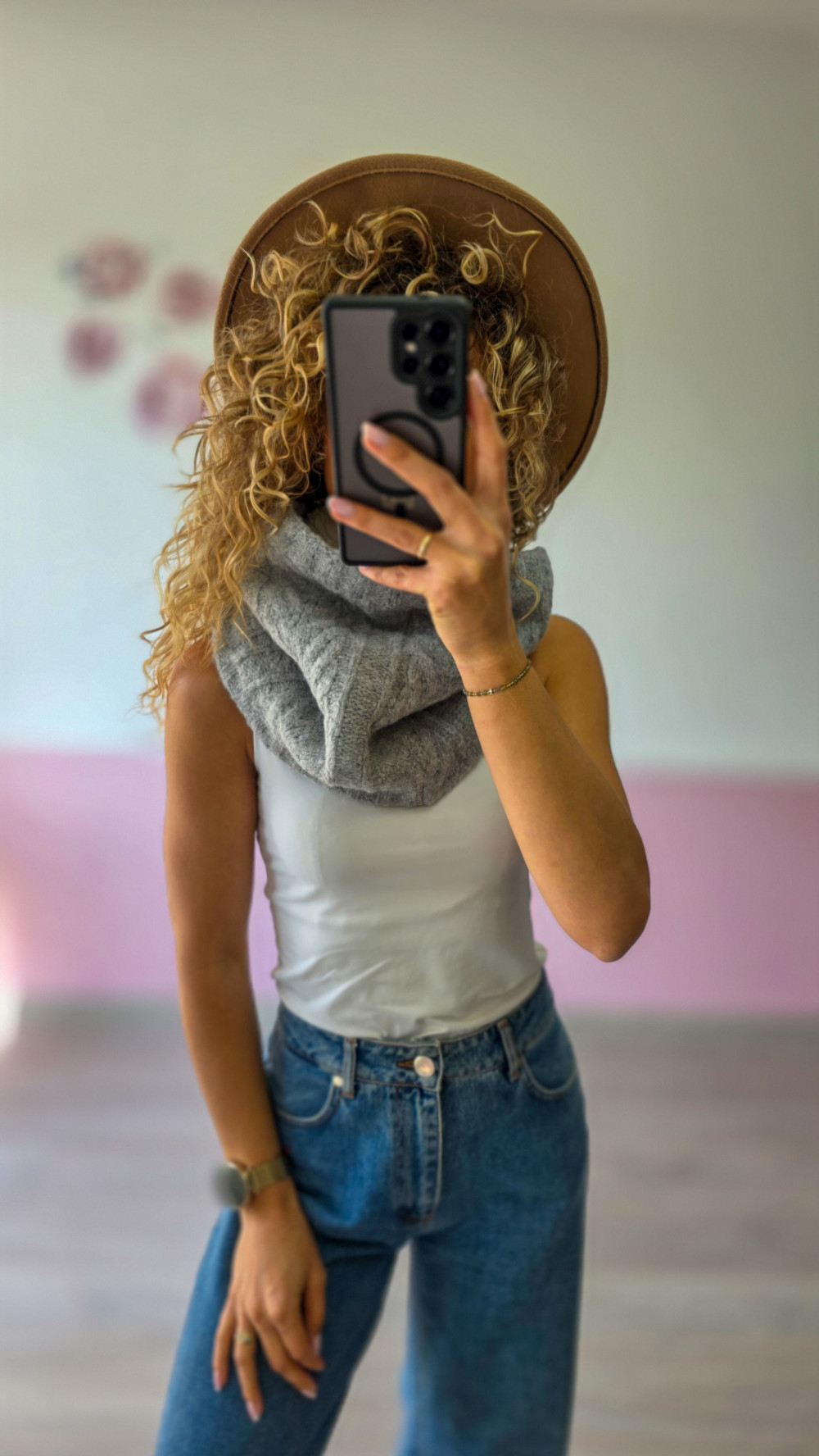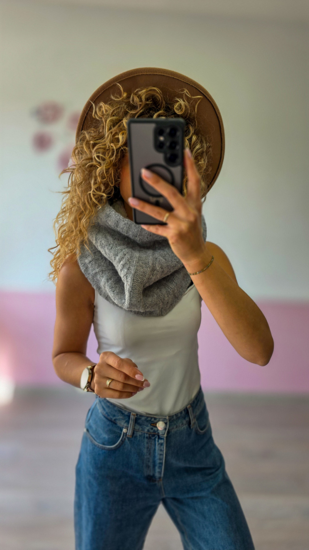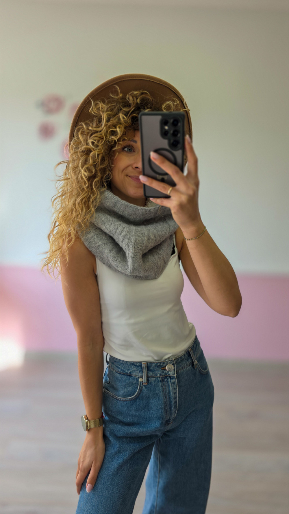 Ten elegancki, szary komin to niezbędny dodatek w jesienno-zimowej garderobie. Wykonany z przyjemnej w dotyku, elastycznej dzianiny, zapewnia komfort i ciepło nawet w chłodniejsze dni. Jego klasyczny kolor sprawia, że doskonale komponuje się z każdym stylem – od codziennego po bardziej elegancki.
