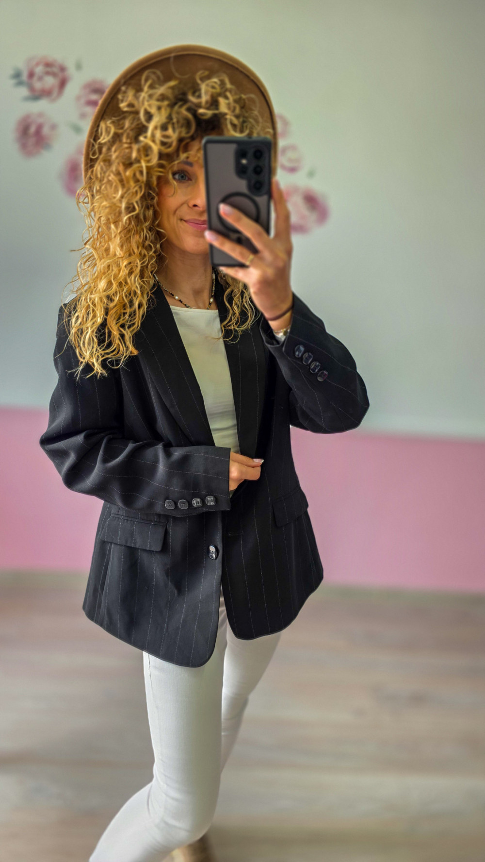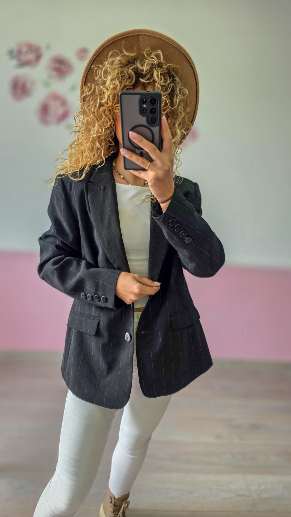 Klasyka, która zawsze się obroni. Czarna marynarka w delikatne paski to idealny wybór do pracy, na spotkanie lub elegancki wieczór. Fason z dłuższym krojem i subtelnym taliowaniem pięknie podkreśla sylwetkę, dodając jej lekkości i szyku.