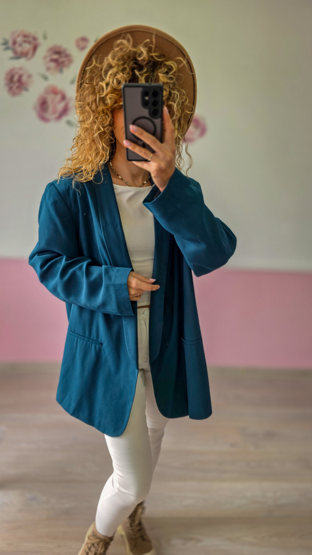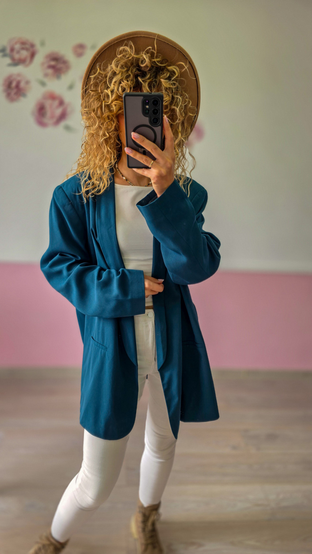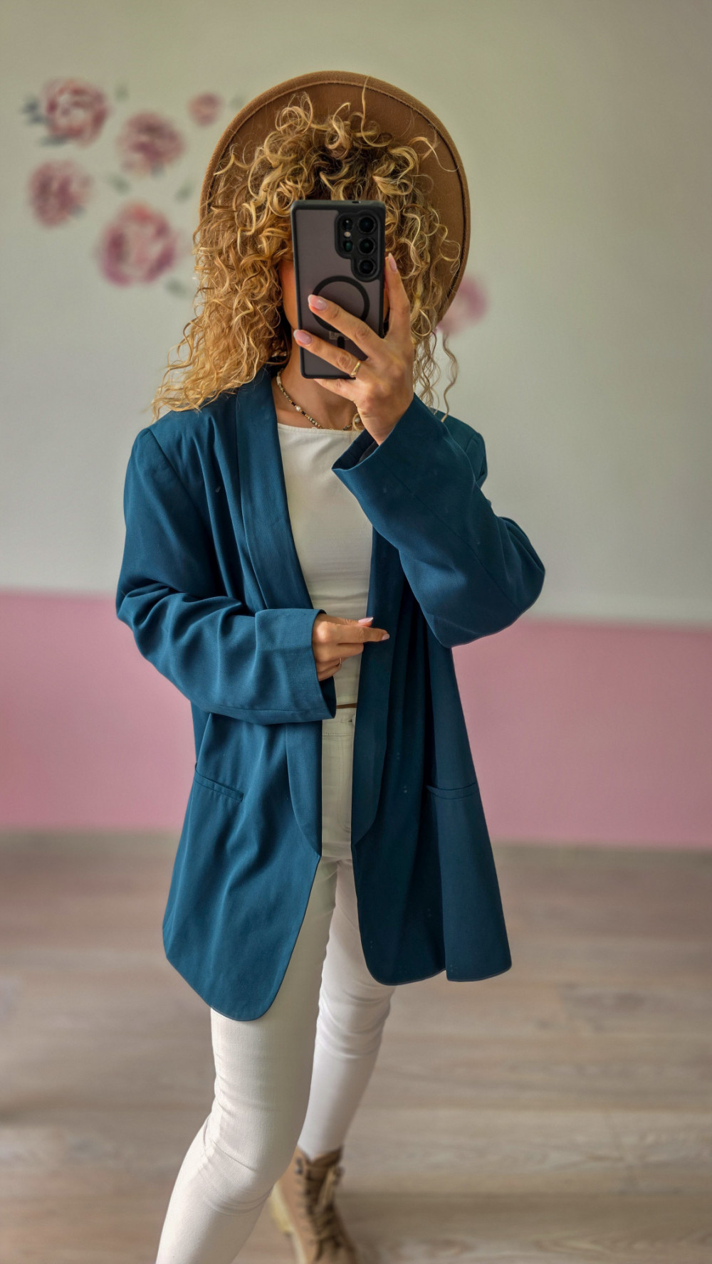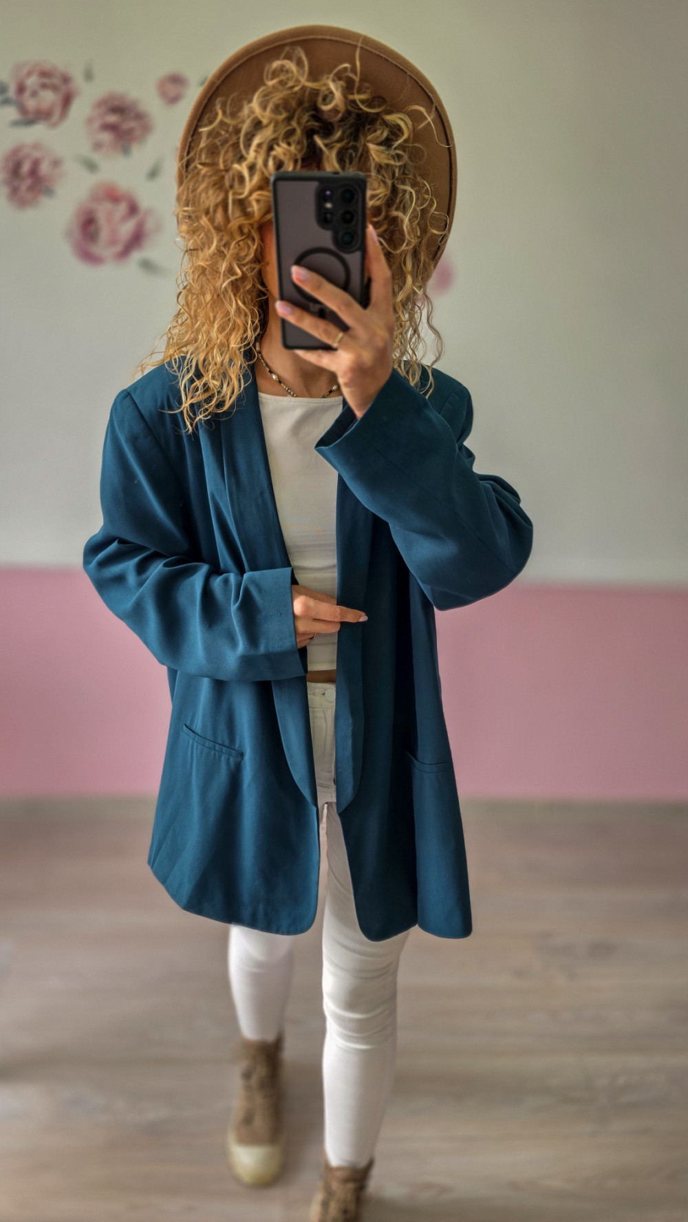 Jeśli lubisz wyróżniać się stylem, niebieska marynarka oversize będzie strzałem w dziesiątkę. Luźny krój i intensywny kolor dodają energii każdej stylizacji. Doskonała do codziennych zestawów z białym topem i spodniami, ale też do bardziej eleganckich looków.