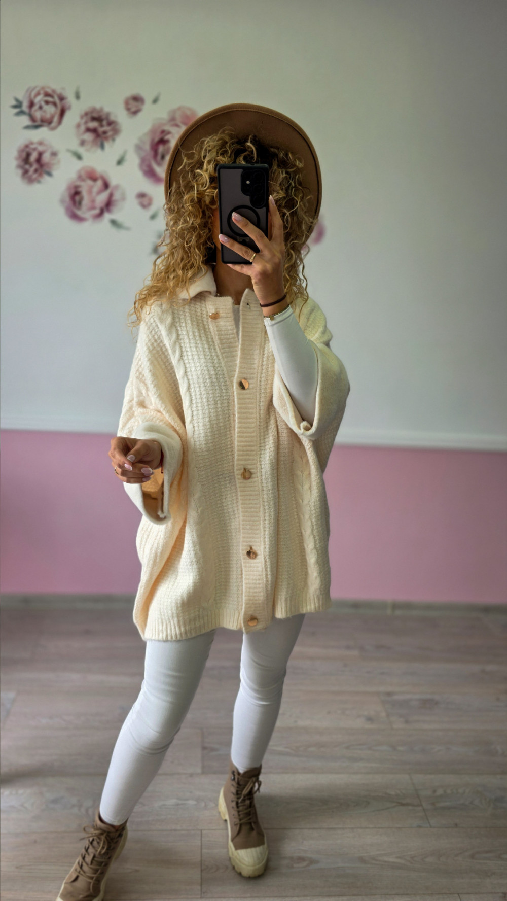 Jego luźny, oversize’owy krój sprawia, że ponczo pięknie układa się na sylwetce, nadając jej naturalnej lekkości. Miękka, dzianinowa tkanina otula ciało, zapewniając komfort i swobodę ruchów. Kremowy odcień wprowadza do stylizacji nutę elegancji i spokoju – to kolor, który nigdy nie wychodzi z mody.
