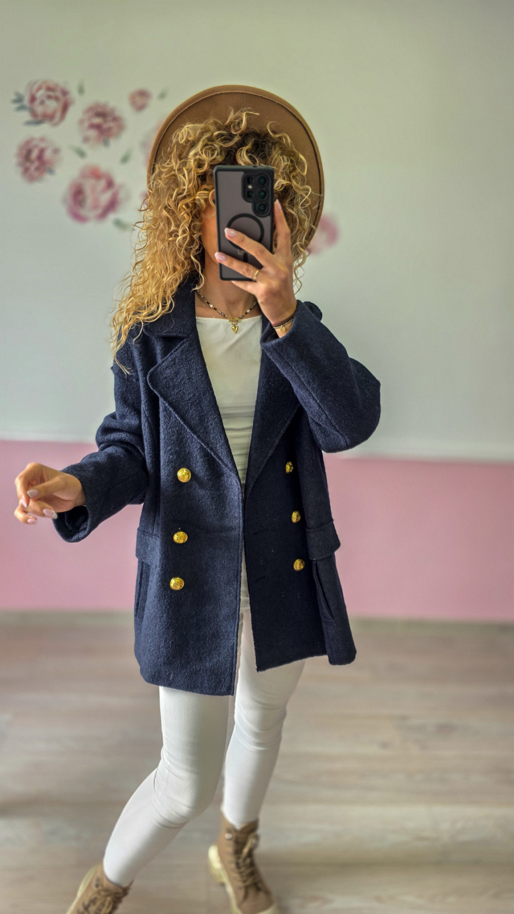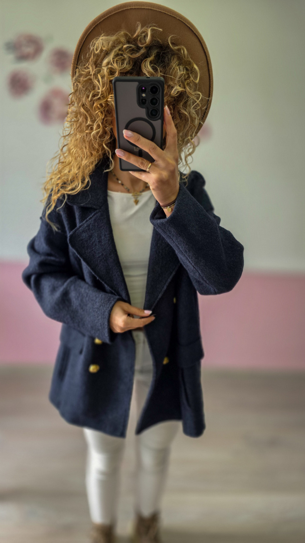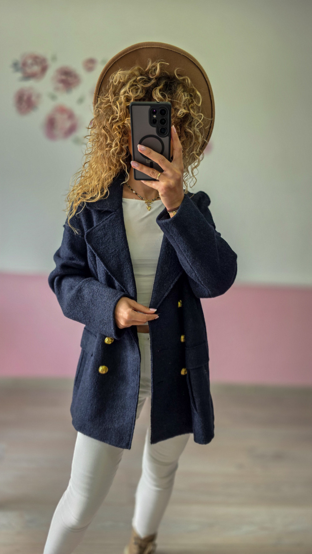 Dwurzędowe zapięcie podkreśla sylwetkę, a złote guziki dodają odrobiny szyku w stylu retro. To płaszcz, który sprawdzi się zarówno w klasycznych, jak i bardziej miejskich zestawieniach. Dzięki swojej uniwersalności będzie Twoim niezawodnym towarzyszem przez wiele sezonów.