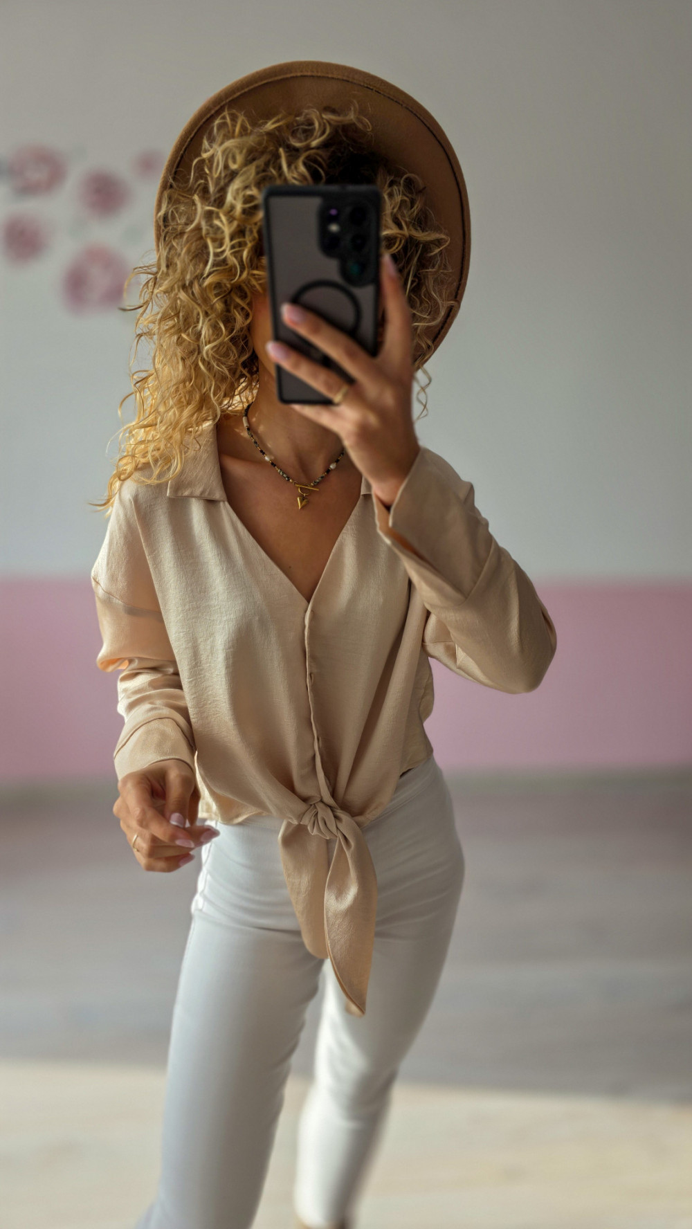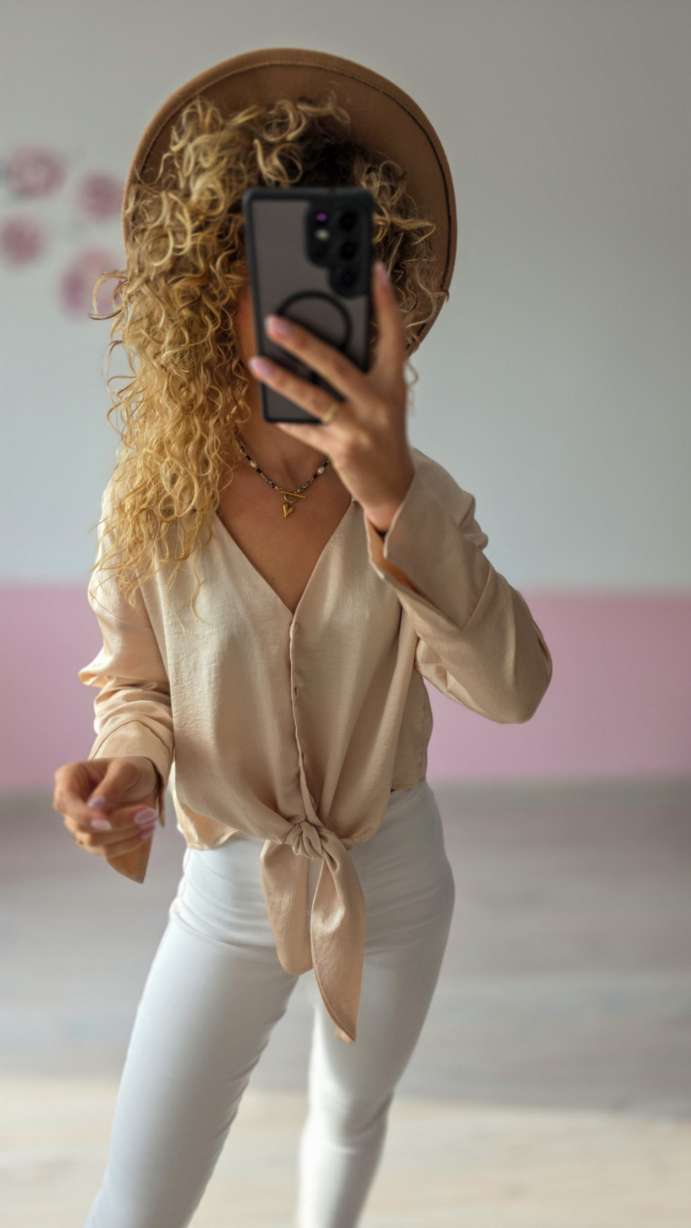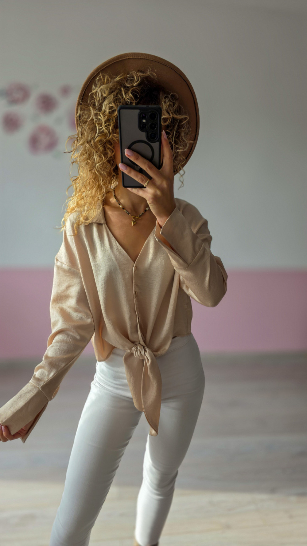 Bluzka satynowa damska – beżowa, z wiązaniem z przodu