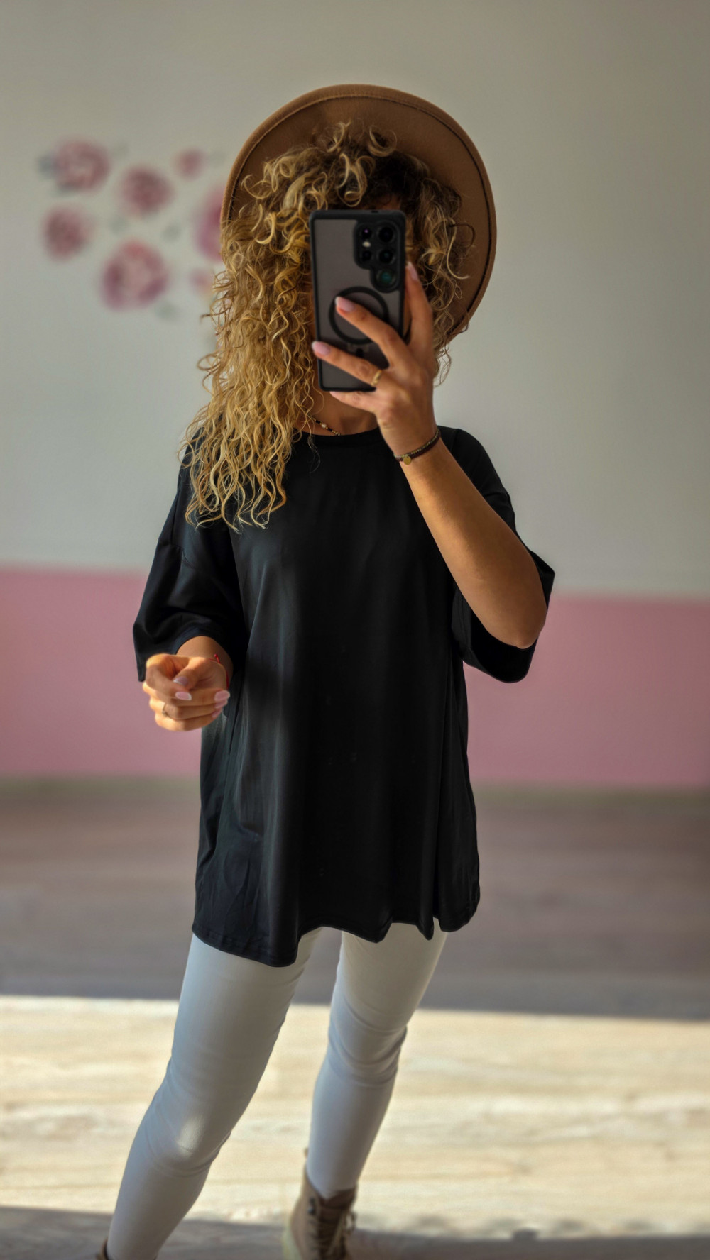 Stylowa i wygodna czarna tunika damska oversize to modna propozycja dla kobiet ceniących luz i wyjątkowe detale. Z przodu klasyczna i minimalistyczna, z tyłu zachwyca efektownym nadrukiem anielskich skrzydeł z połyskującymi zdobieniami.