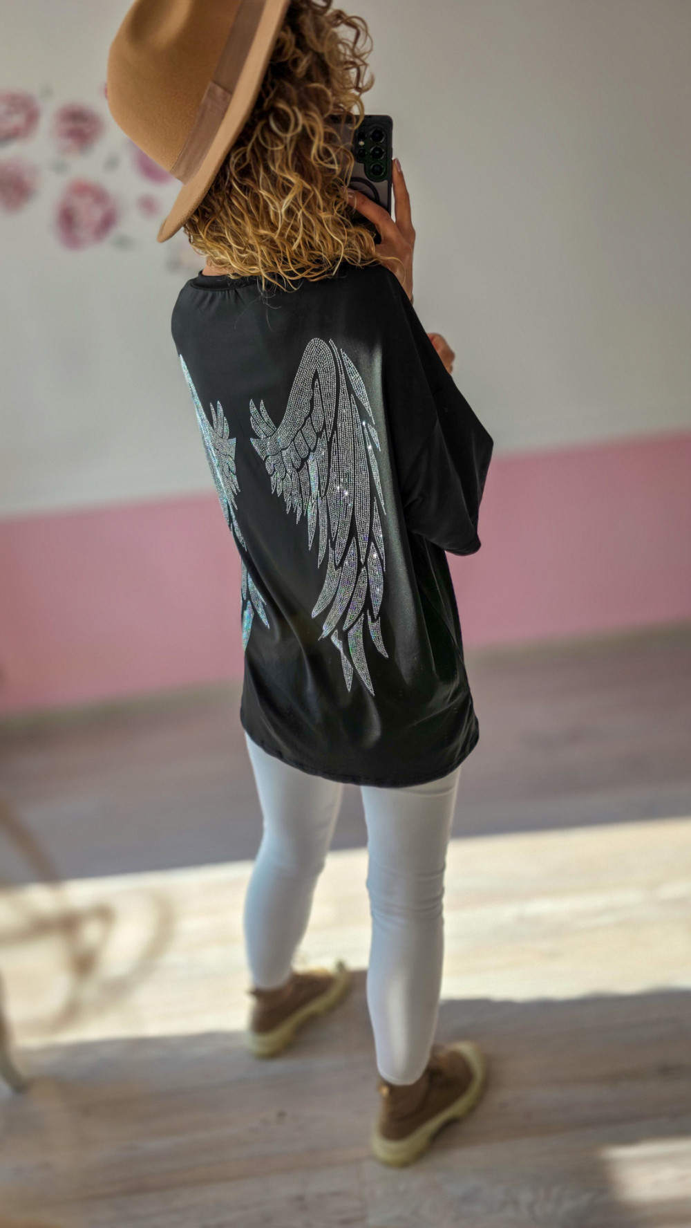 Tunika oversize z anielskimi skrzydłami – czarna z błyszczącym nadrukiem