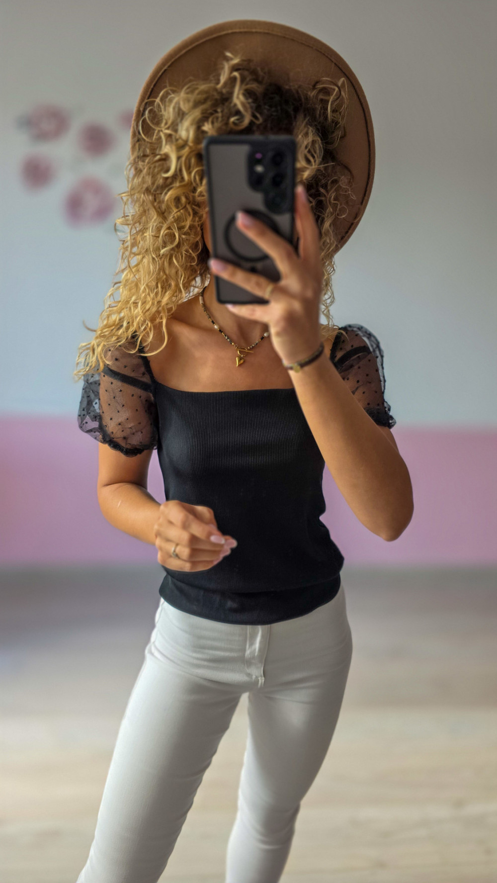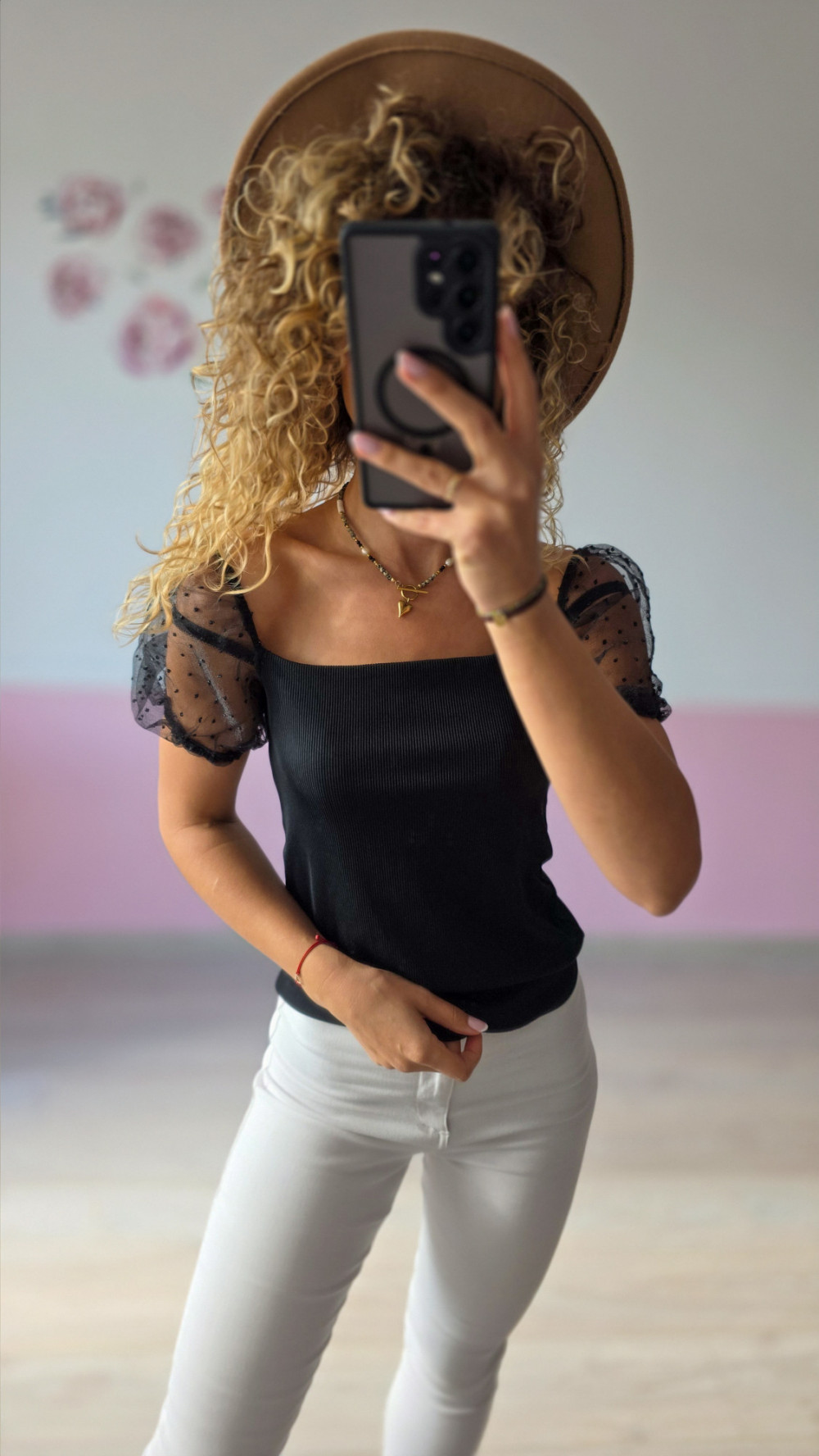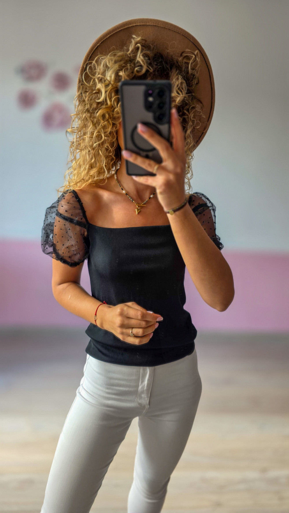 Elegancki czarny top z odkrytymi ramionami i tiulowymi rękawkami w kropki to połączenie klasy i kobiecości. Idealny na wieczorne wyjście, randkę lub imprezę. Dopasowany fason pięknie podkreśla sylwetkę, a delikatny tiul dodaje lekkości i romantycznego charakteru.