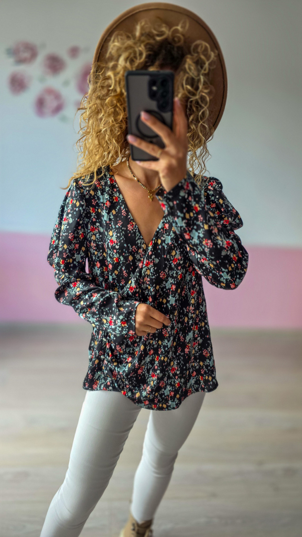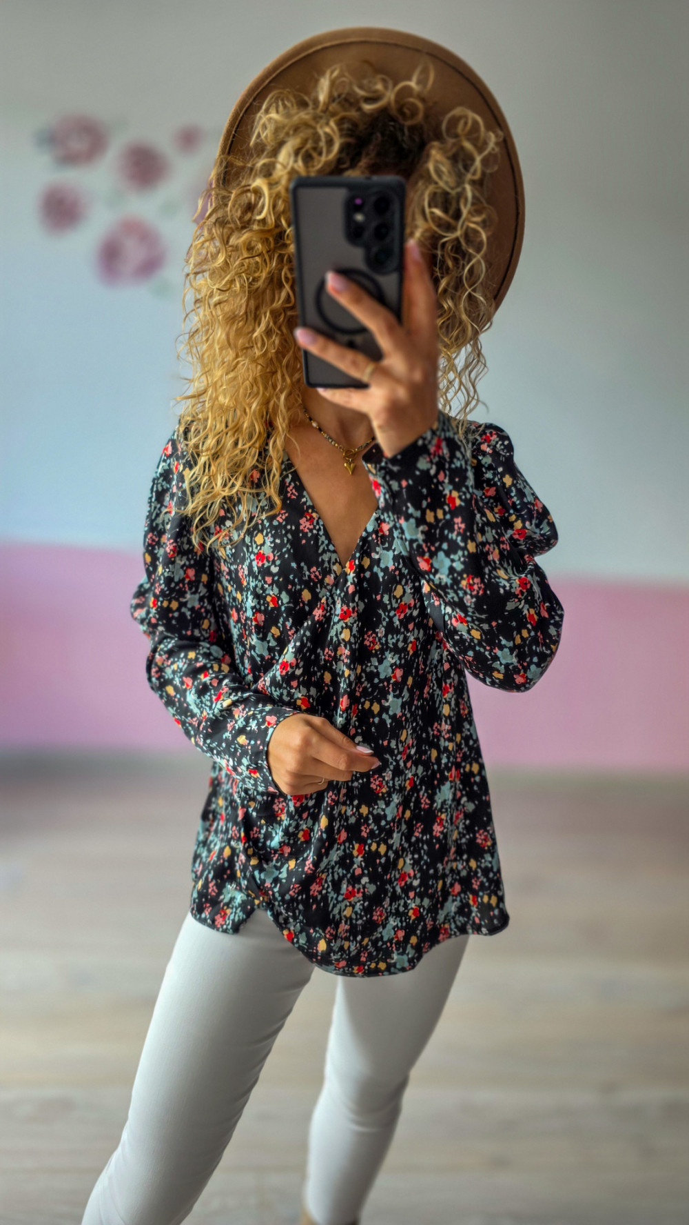 Romantyczna bluzka w kwiatowy print na czarnym tle. Kopertowy dekolt pięknie podkreśla dekolt i dodaje kobiecego uroku, a lekko bufiaste rękawy nadają całości lekkości. To idealny wybór do biura, na randkę lub spotkanie z przyjaciółkami.