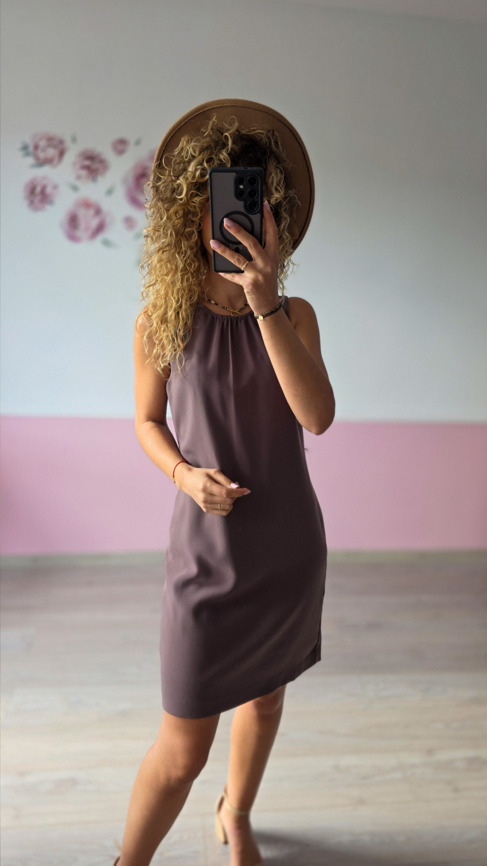Elegancka sukienka o prostym kroju w odcieniu cappuccino to klasyka, która nigdy nie wychodzi z mody. Delikatne marszczenie przy dekolcie dodaje subtelności, a gładki materiał pięknie układa się na sylwetce. Doskonała na każdą okazję – wystarczy zmienić dodatki, by uzyskać zarówno codzienny, jak i bardziej formalny look.