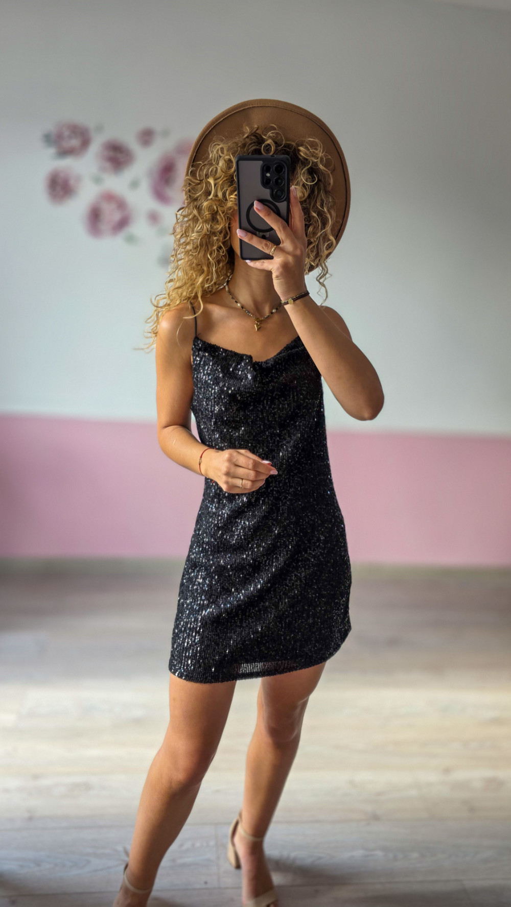 Zachwycaj blaskiem w tej czarnej cekinowej sukience mini! To idealna propozycja na sylwestra, imprezę lub wyjątkowy wieczór. Cekiny pięknie odbijają światło, tworząc efekt glamour, a cienkie ramiączka i delikatny dekolt dodają kobiecości. Sukienka dopasowuje się do sylwetki, podkreślając kształty i zapewniając wygodę przez całą noc.