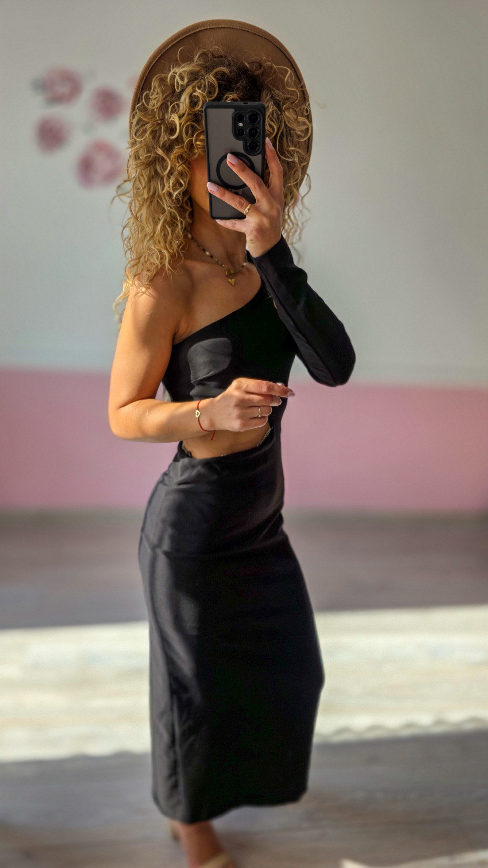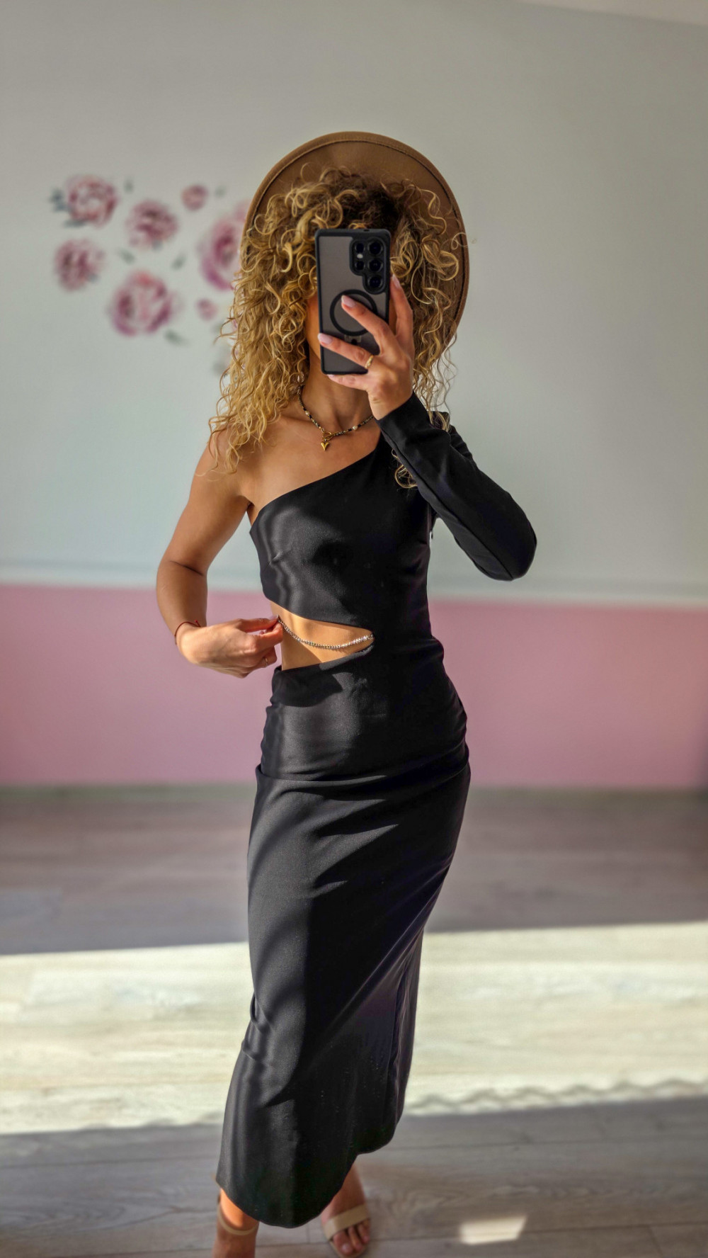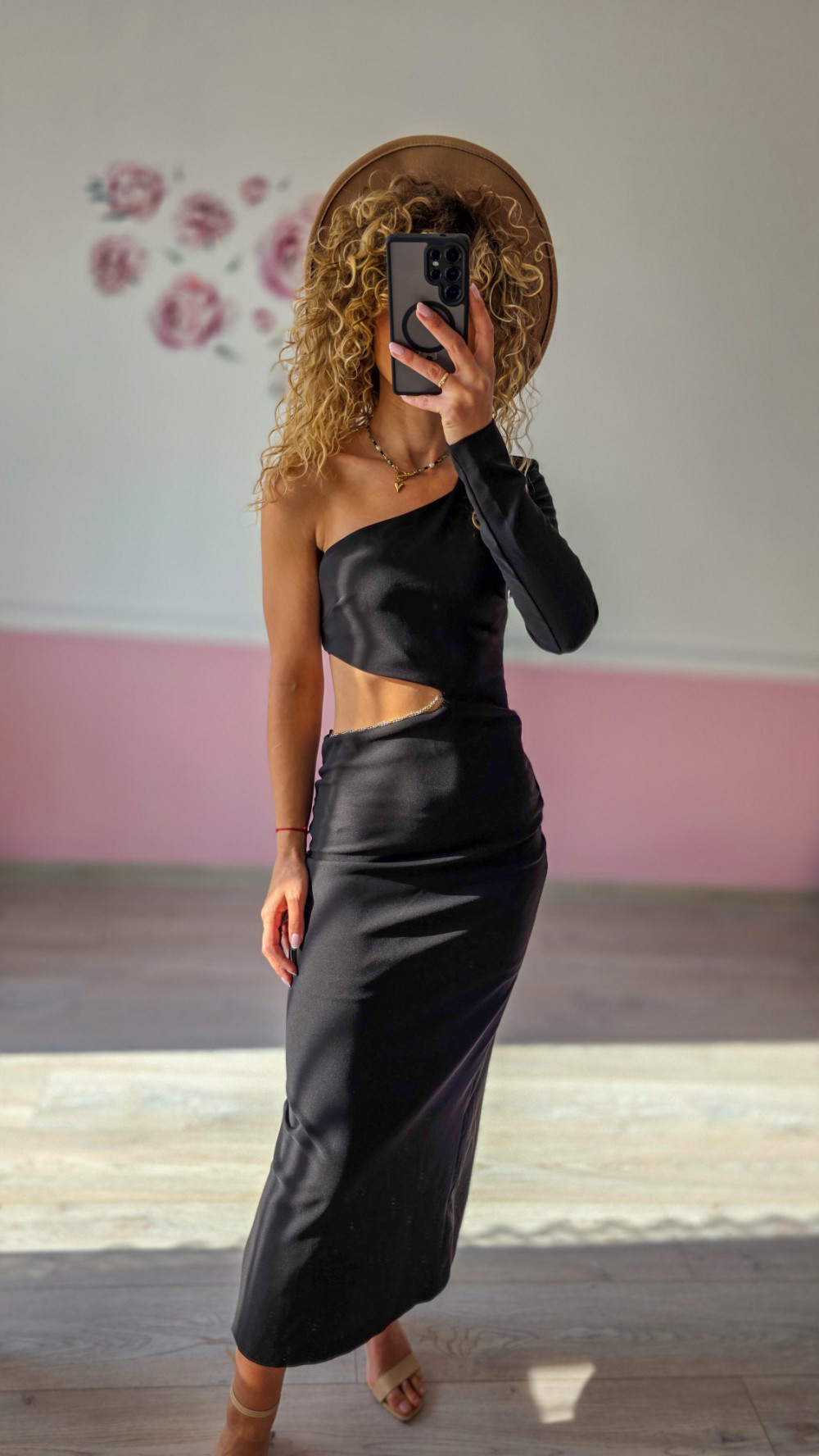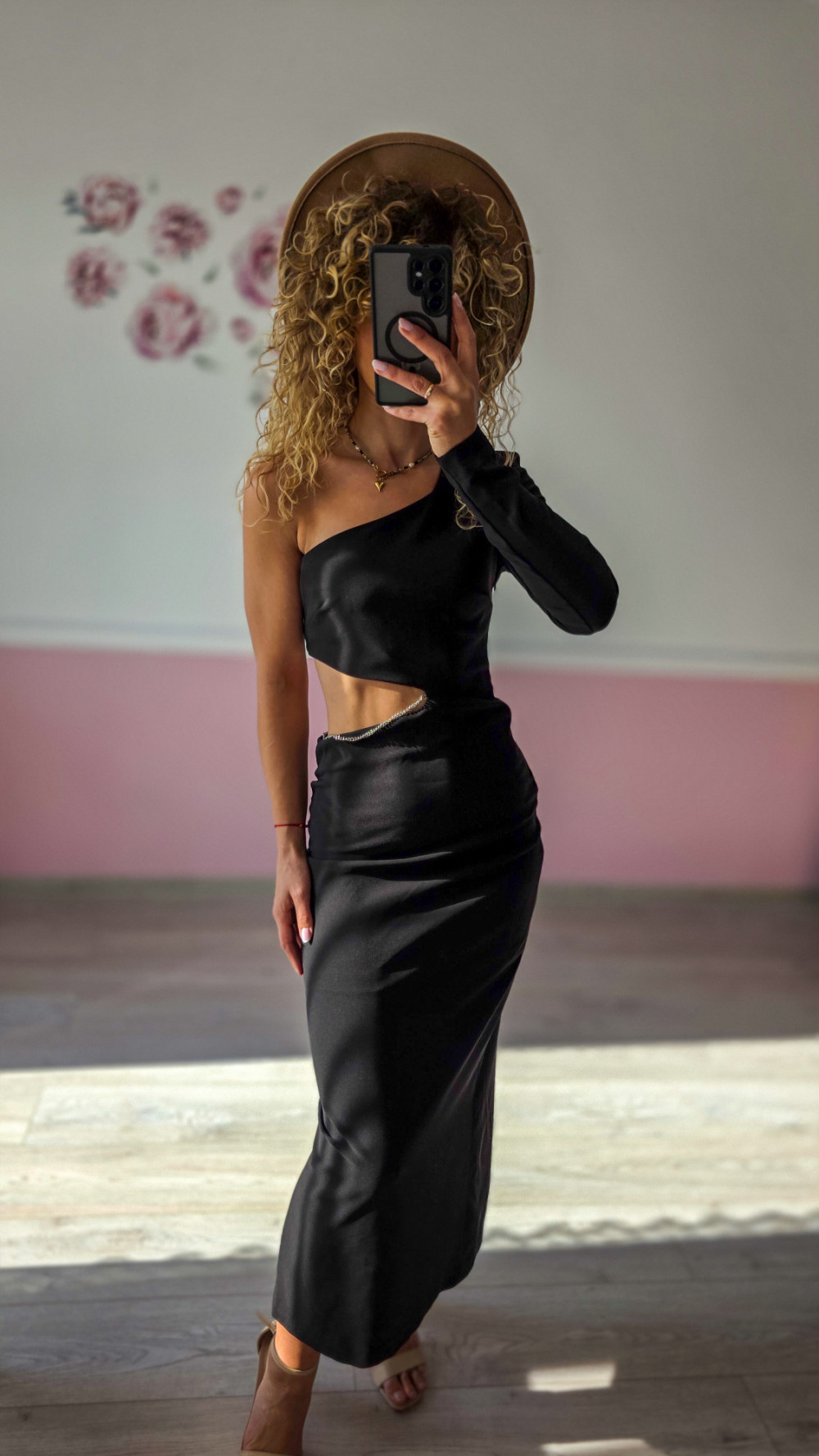 Postaw na wyjątkowy look z klasą! Ta czarna sukienka maxi z jednym rękawem i efektownym wycięciem w talii to idealny wybór na wieczorne wyjścia, bankiety czy eleganckie przyjęcia. Satynowe wykończenie pięknie mieni się w świetle, a dopasowany krój podkreśla sylwetkę. To model, który przyciąga spojrzenia i emanuje pewnością siebie.