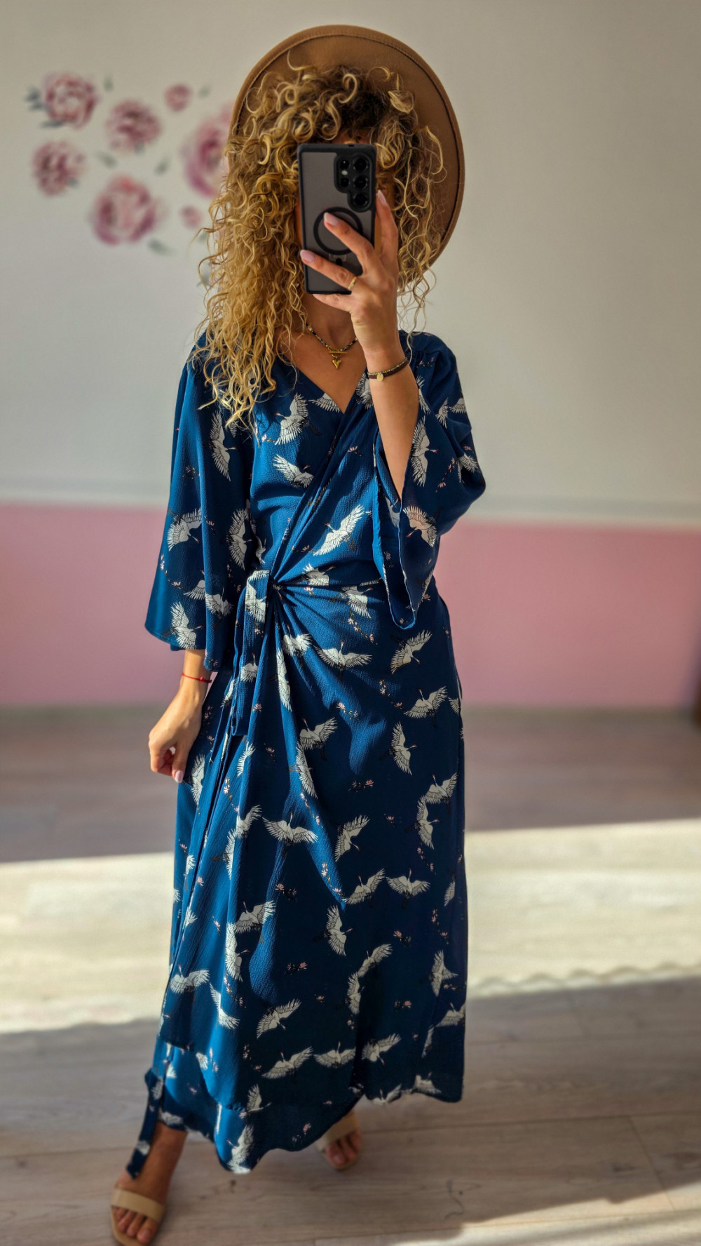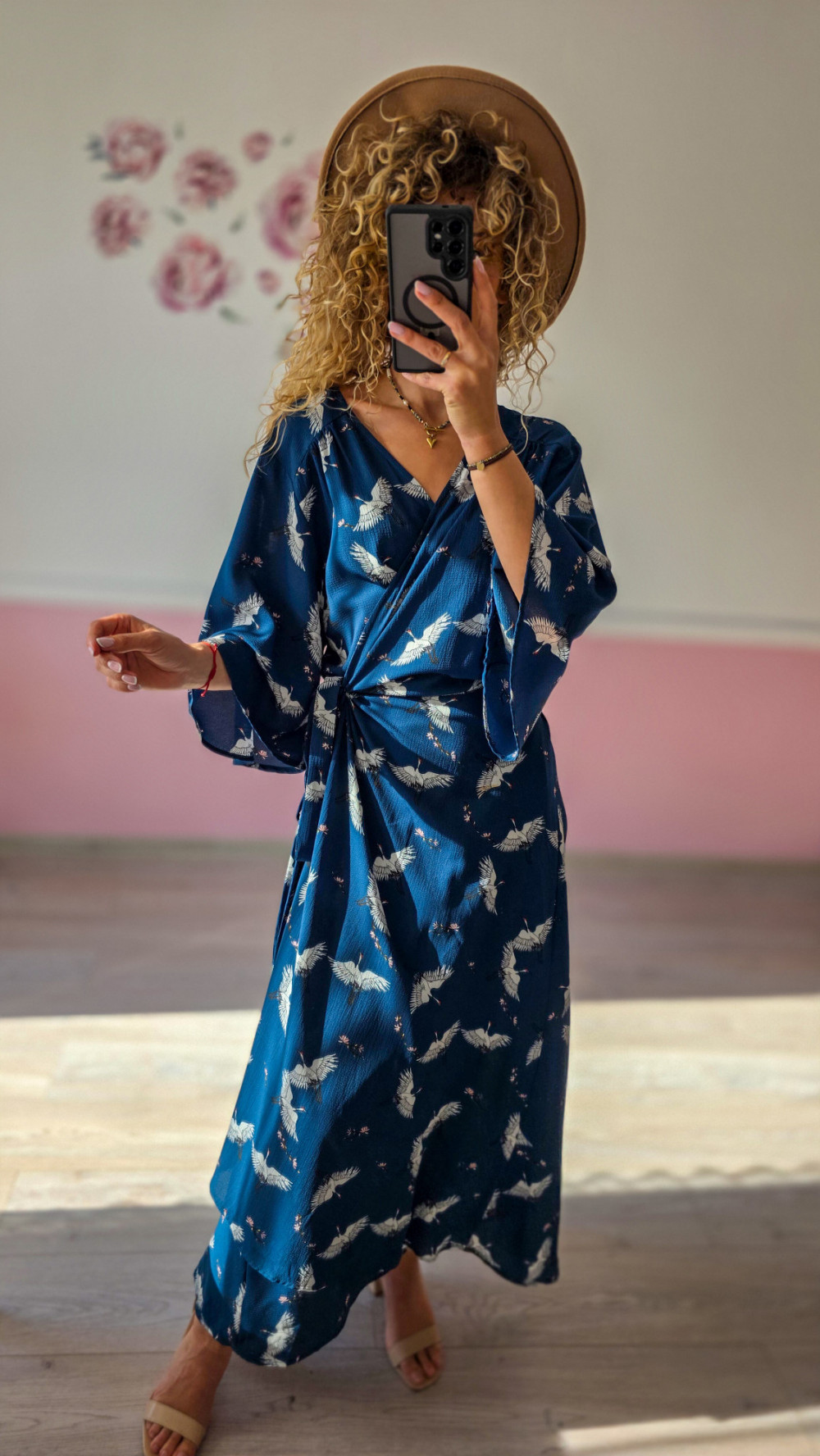 Wyjątkowa sukienka maxi o luźnym kroju i przepięknym, orientalnym wzorze z motywem żurawi. Lekka tkanina pięknie układa się na sylwetce, a wiązanie w talii pozwala dopasować fason do figury. Szerokie rękawy i kopertowy dekolt dodają całości lekkości i kobiecego wdzięku. Idealna na lato, wakacje lub wieczorne wyjście.