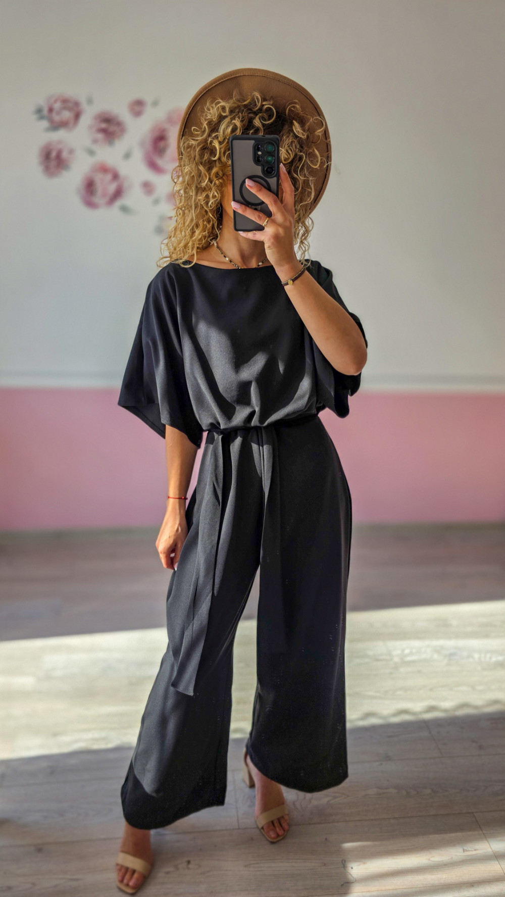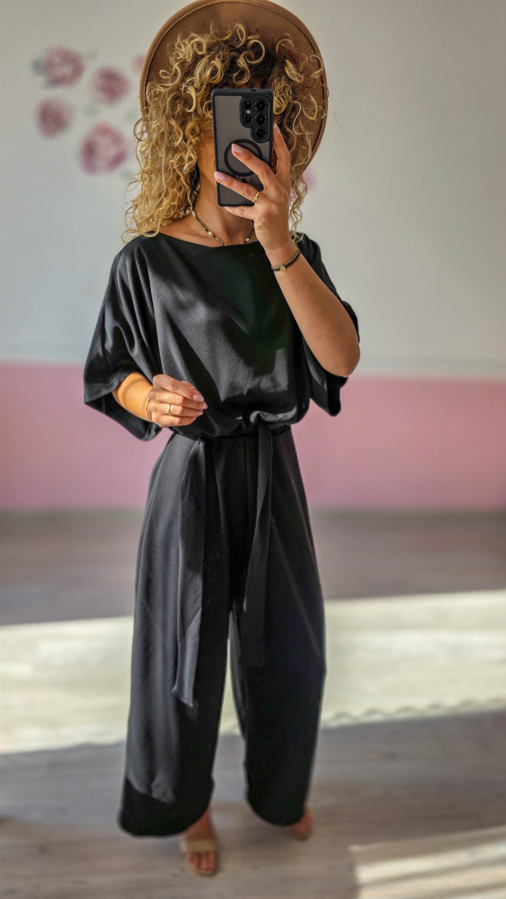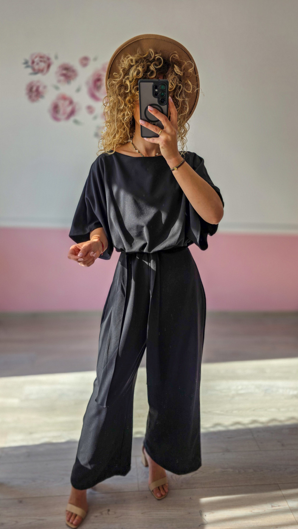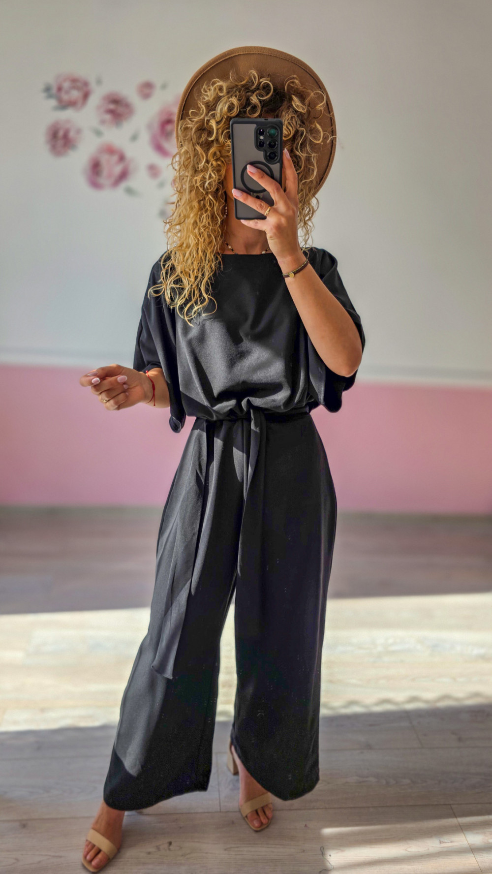 Czarny kombinezon z paskiem i szerokimi nogawkami