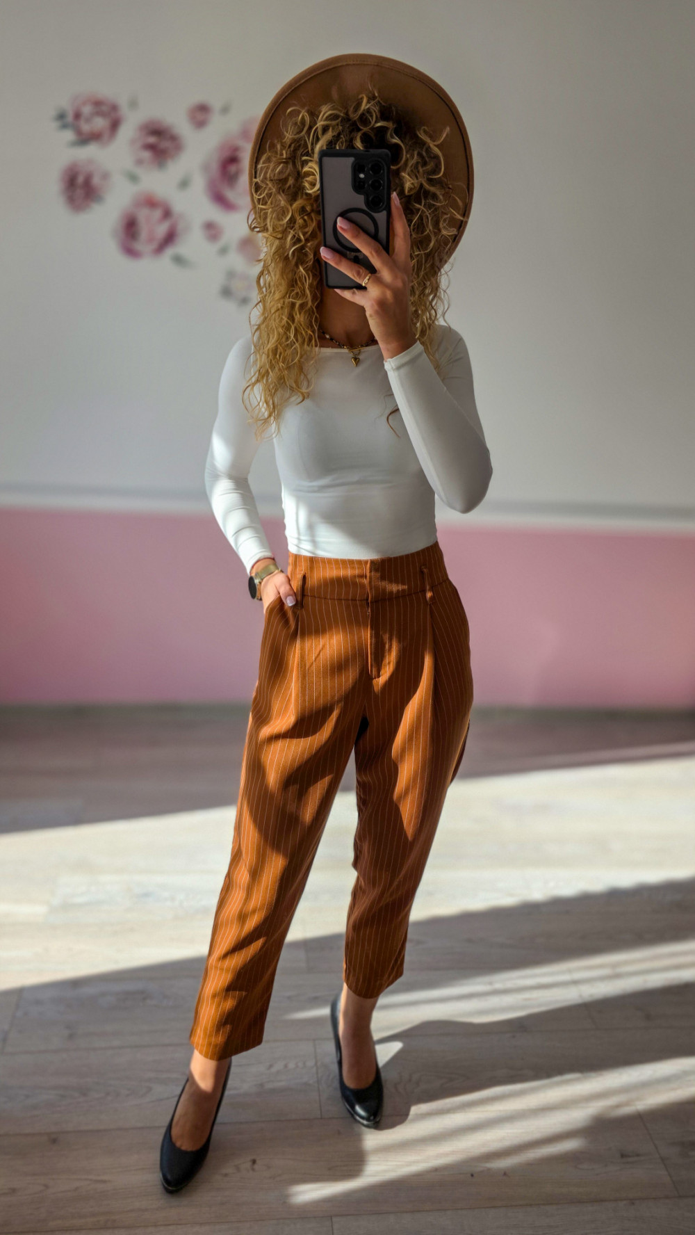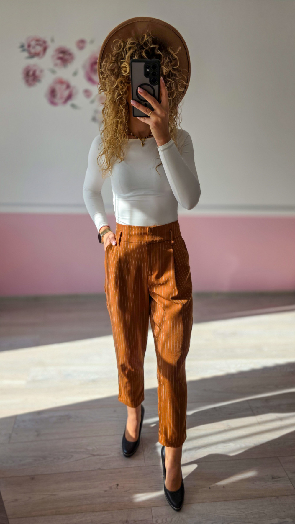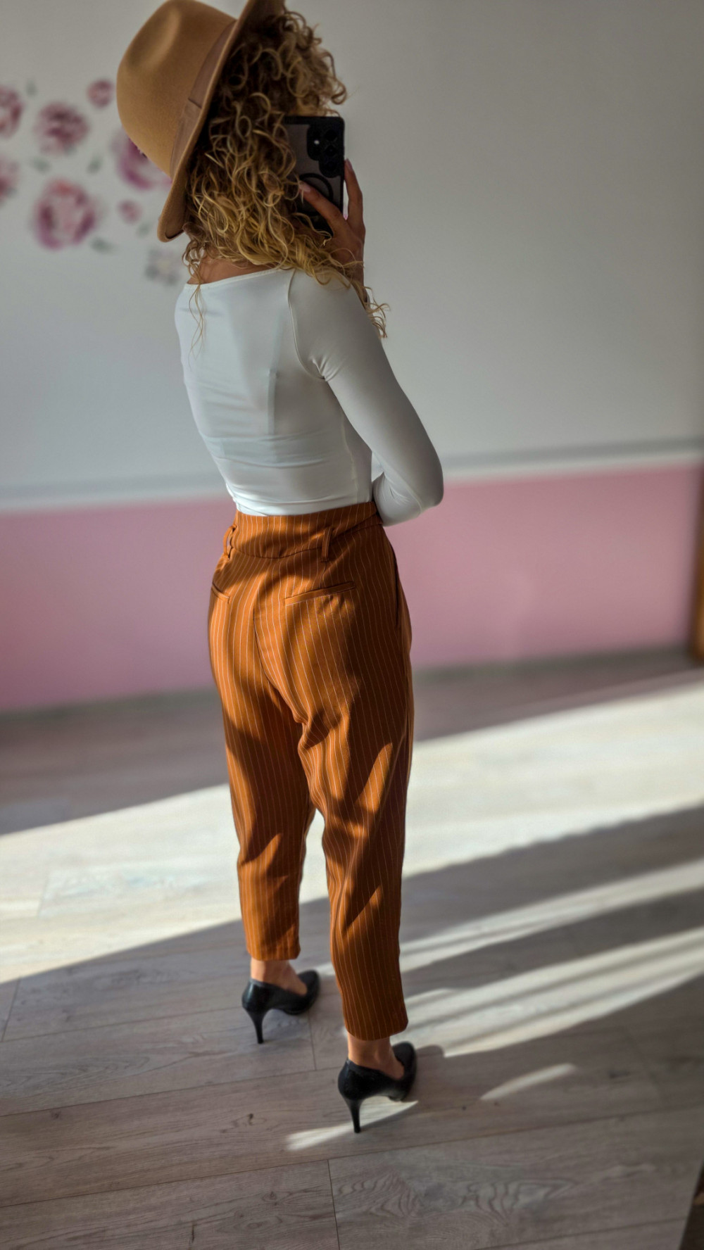 Eleganckie spodnie w rudym kolorze w delikatne prążki to idealna opcja do biura i na spotkania. Lekka tkanina i luźniejszy krój zapewniają komfort, a pionowe paski optycznie wydłużają nogi.