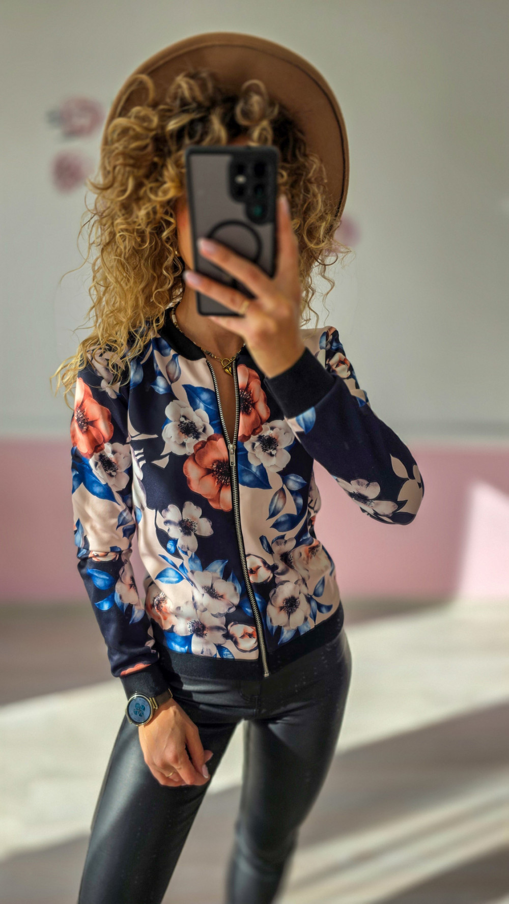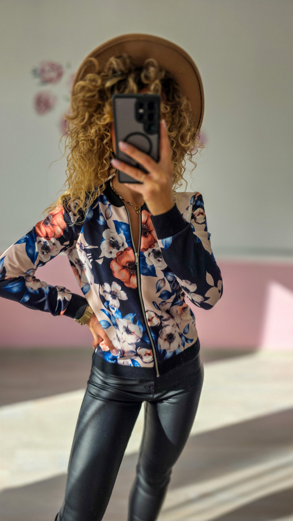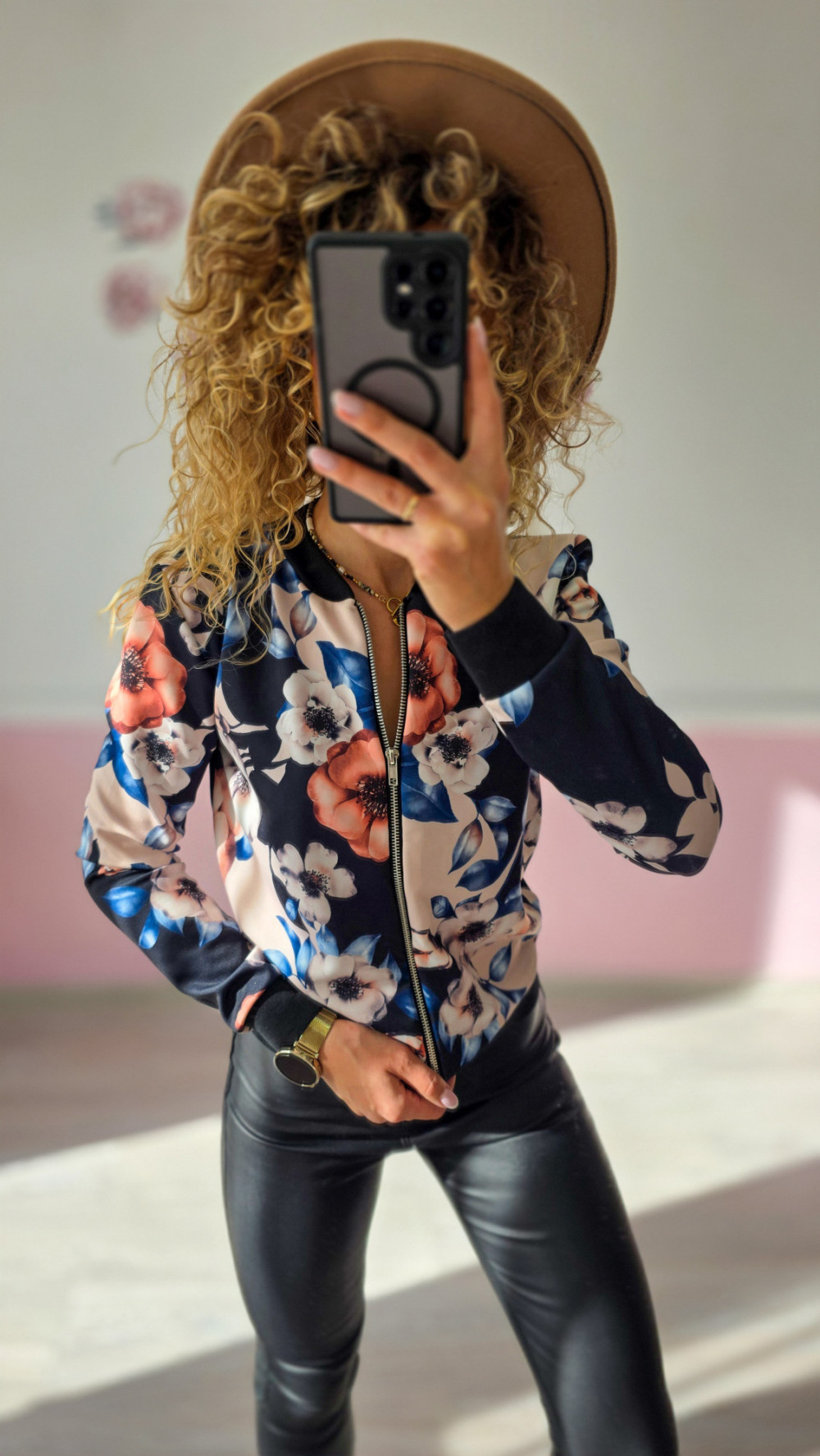 Bluza bomberka damska w kwiaty – granatowo-beżowa S/M