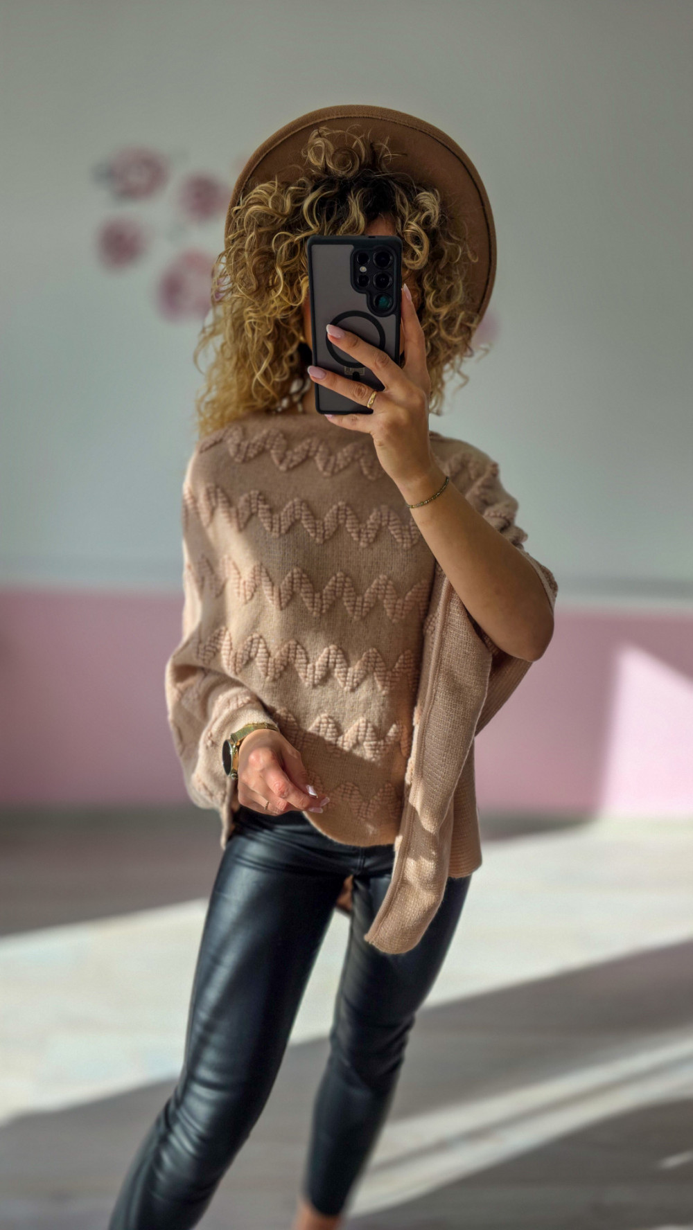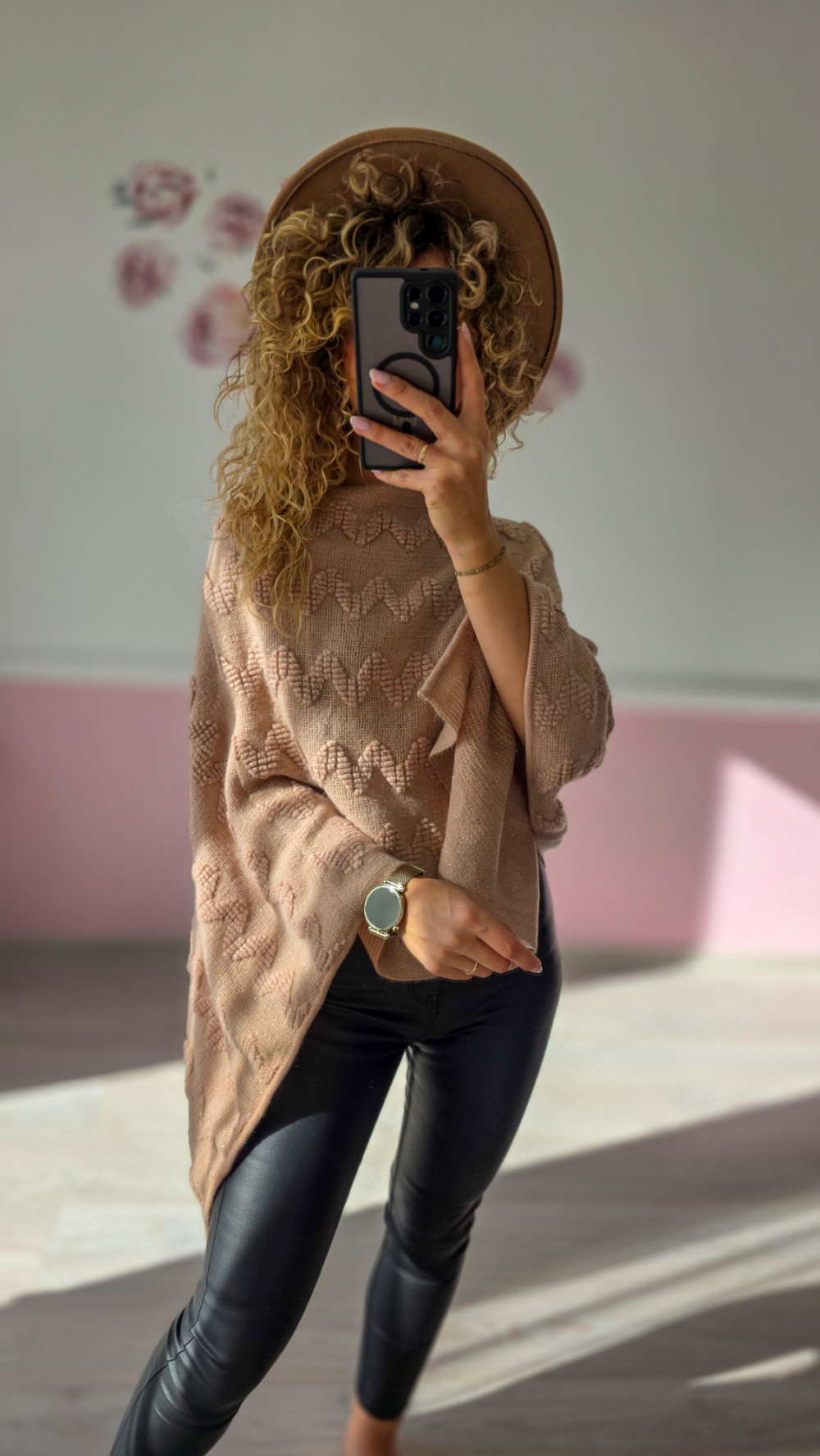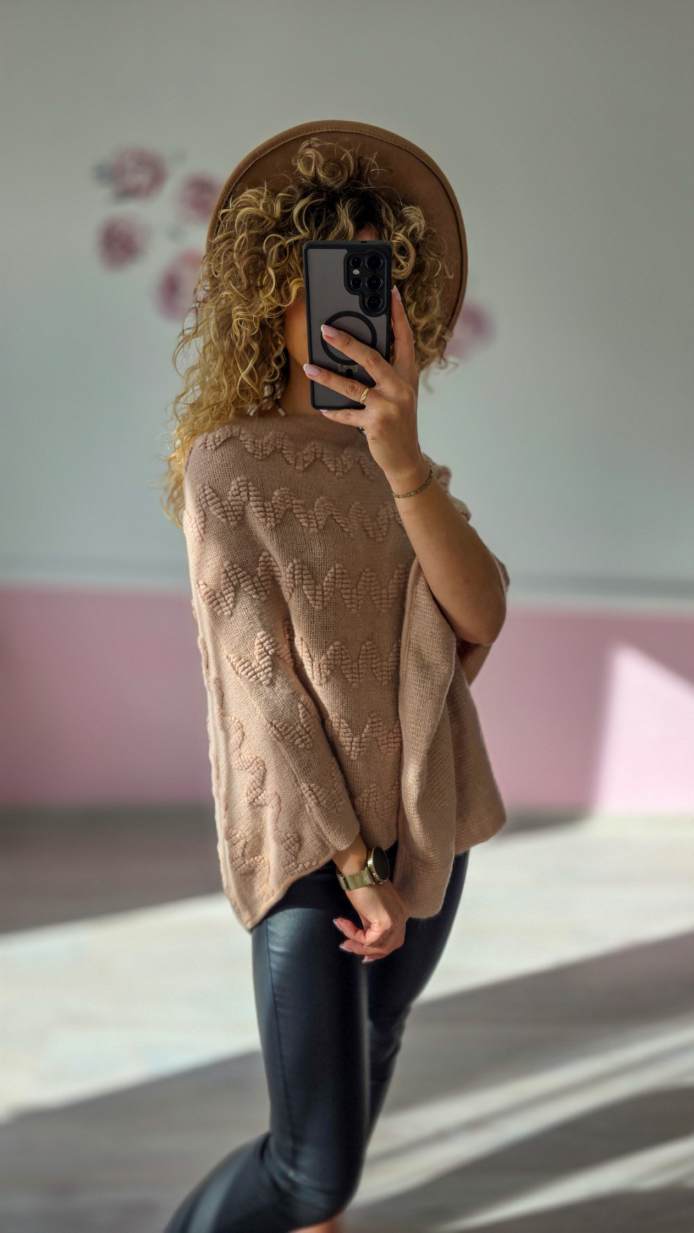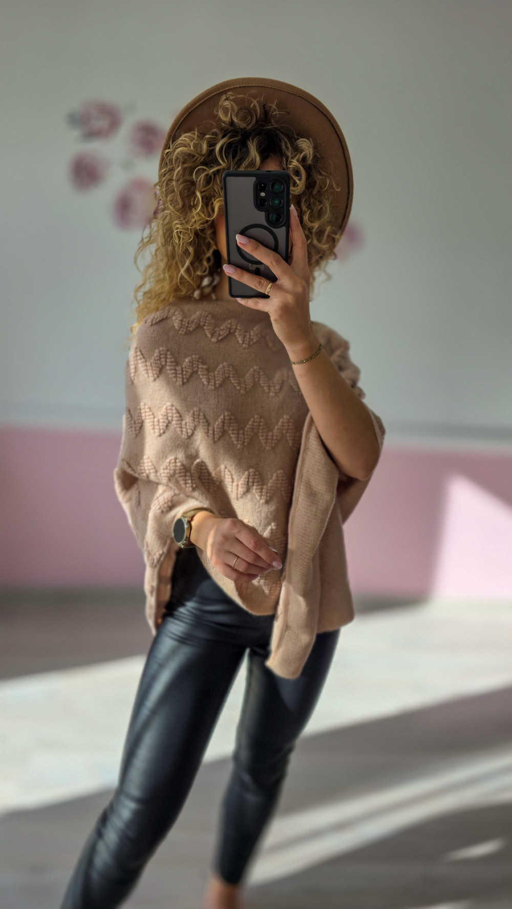 Pudrowe ponczo damskie z ozdobnym splotem S-L