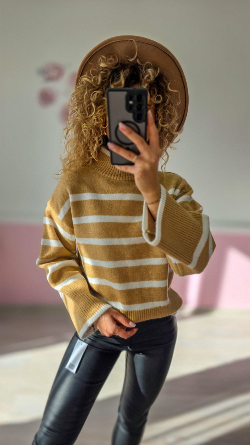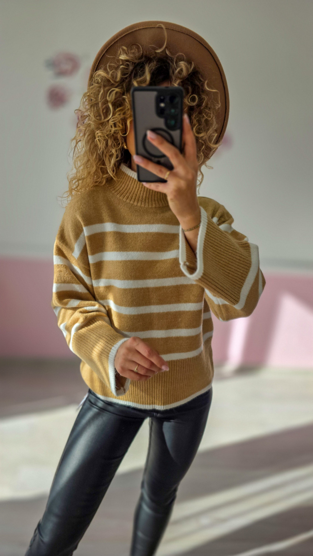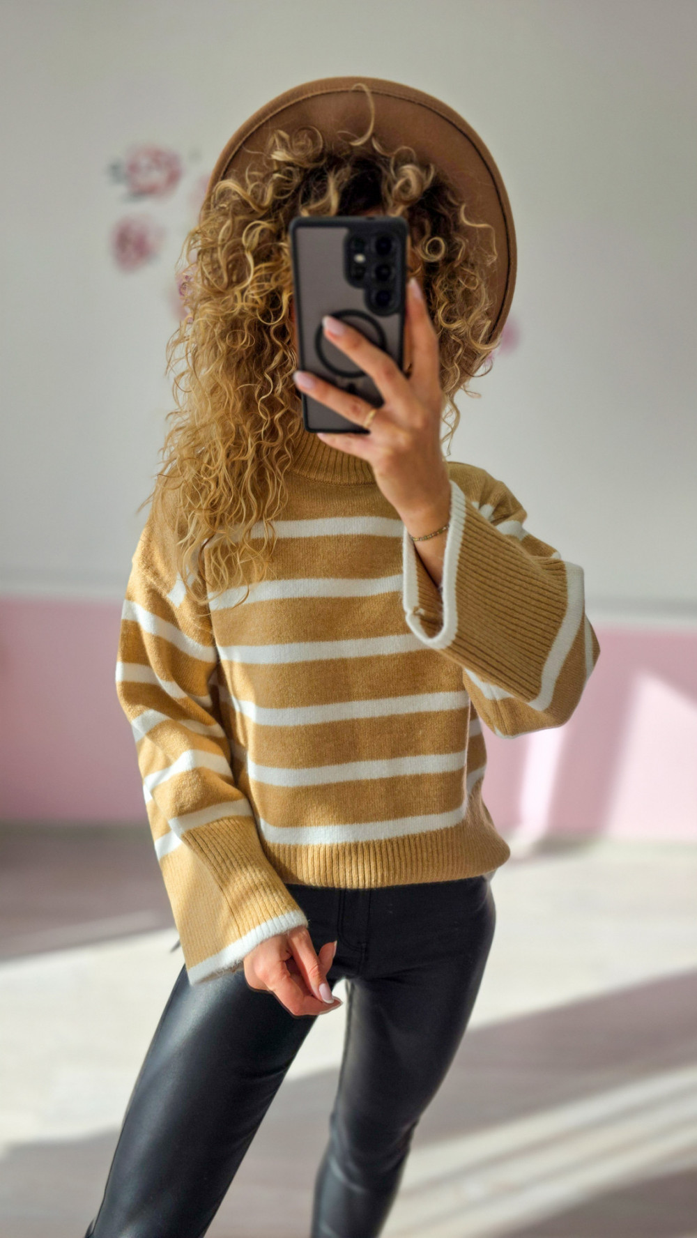 Ciepły i stylowy sweter damski w paski w odcieniach karmelu i bieli to doskonały wybór na chłodniejsze dni. Wykonany z miękkiej dzianiny, zapewnia komfort noszenia i przytulność.