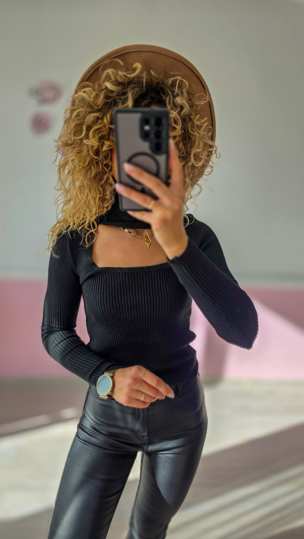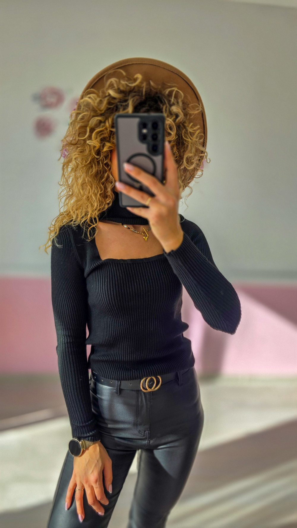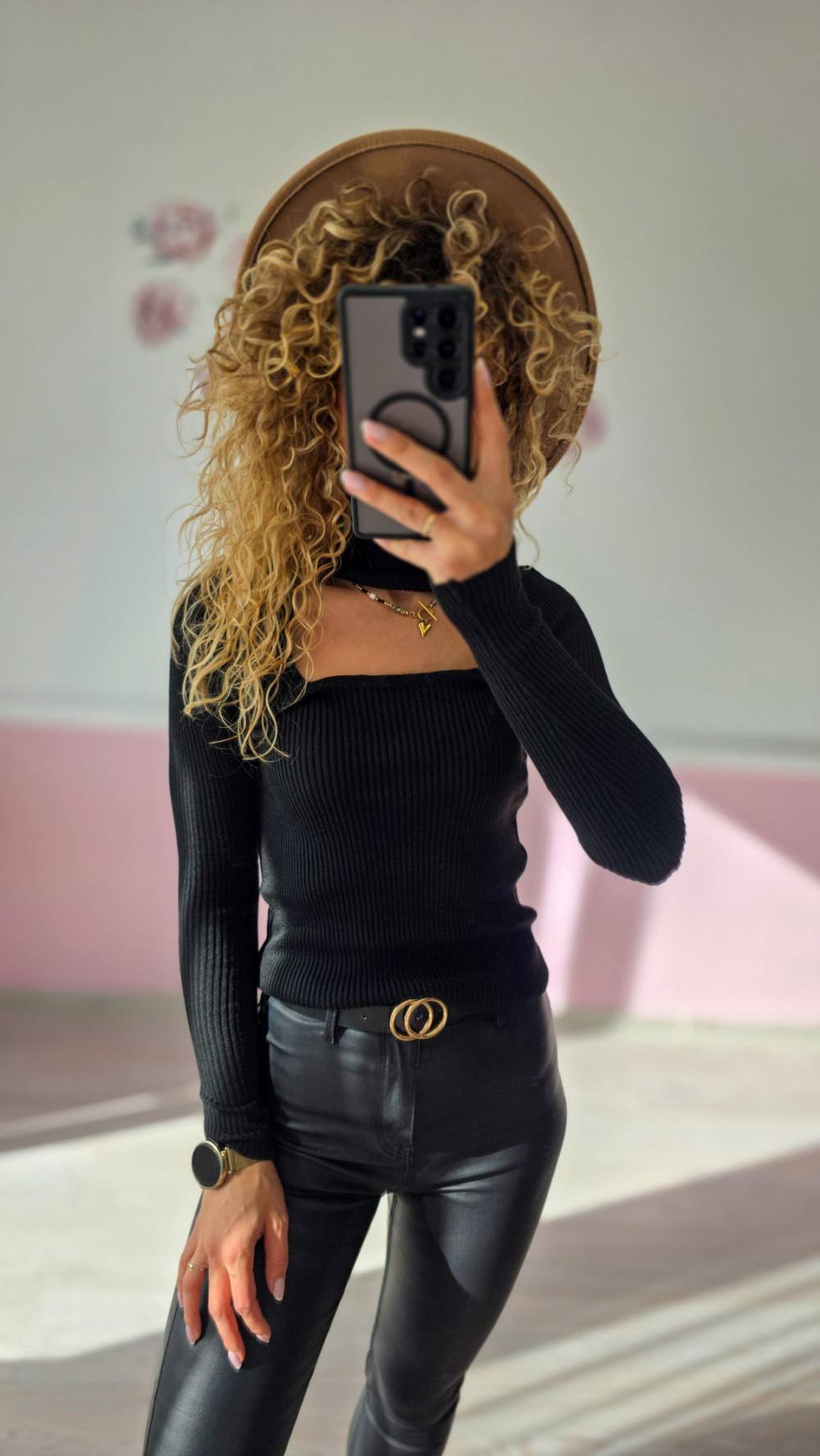 Nowoczesny i kobiecy czarny sweter z wycięciem przy dekolcie to propozycja dla odważnych kobiet, które lubią łączyć klasykę z nutą oryginalności.
