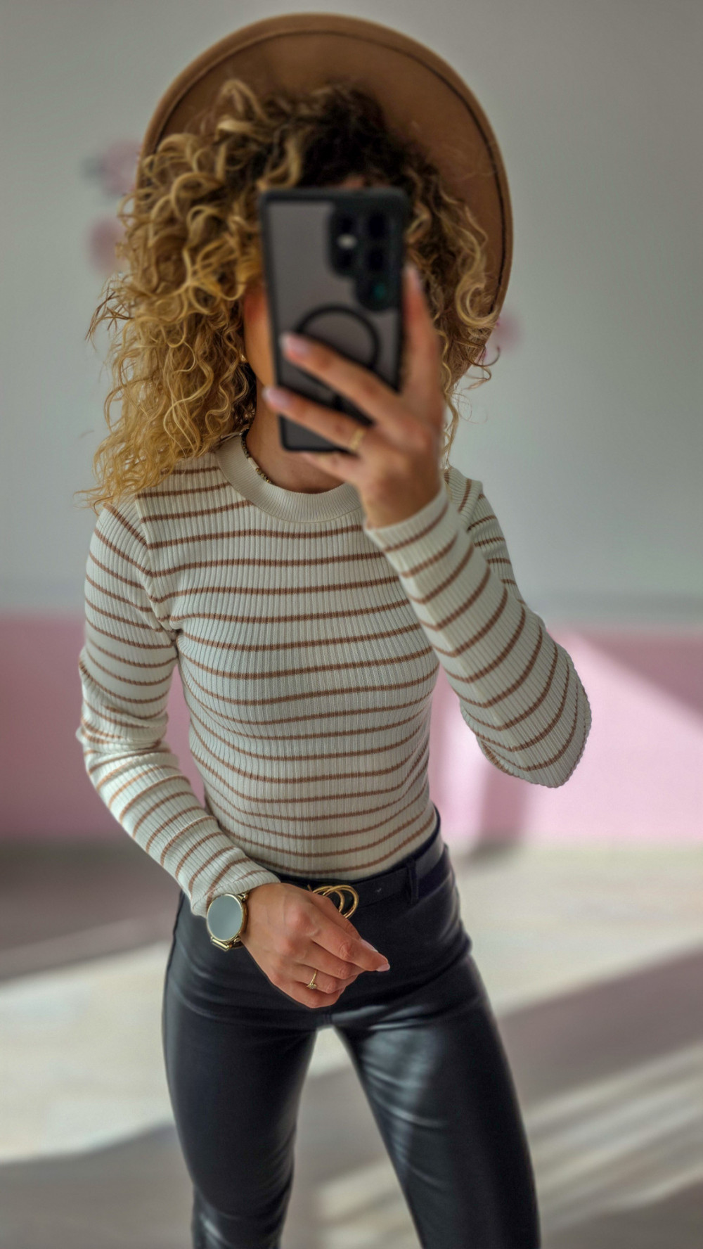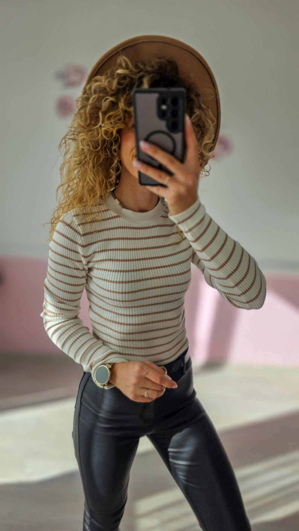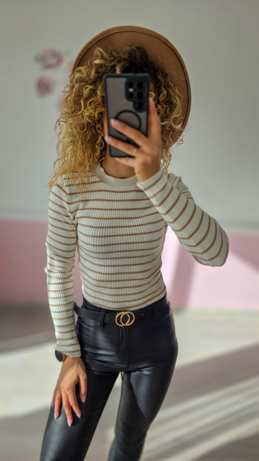 Stylowy i kobiecy prążkowany sweterek w paski to idealna propozycja na każdą porę roku. Wykonany z elastycznej, przyjemnej w dotyku dzianiny, doskonale dopasowuje się do sylwetki i zapewnia wygodę przez cały dzień.