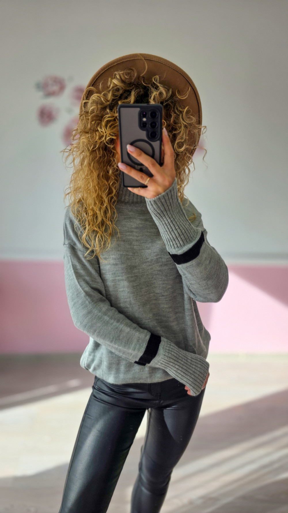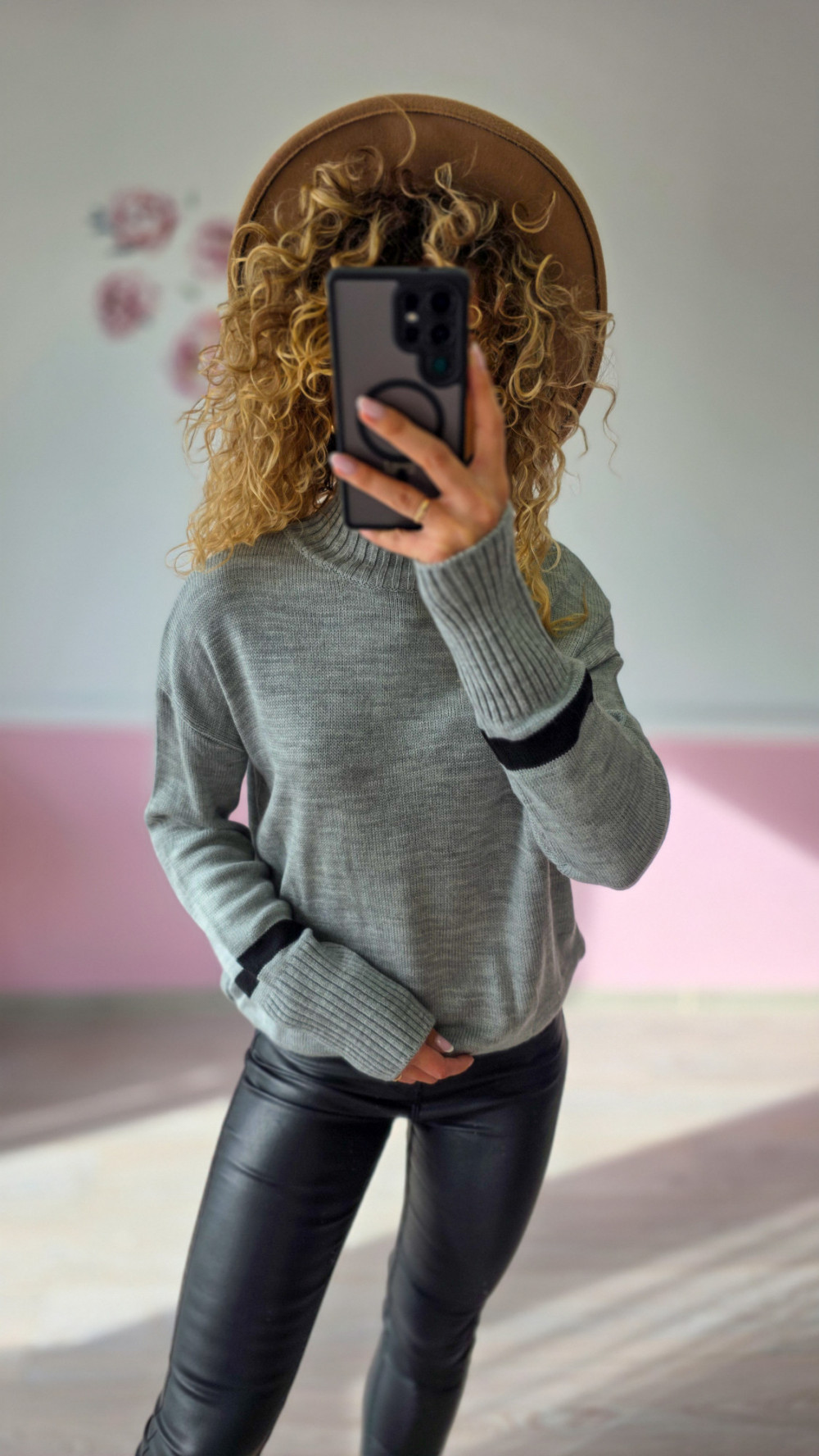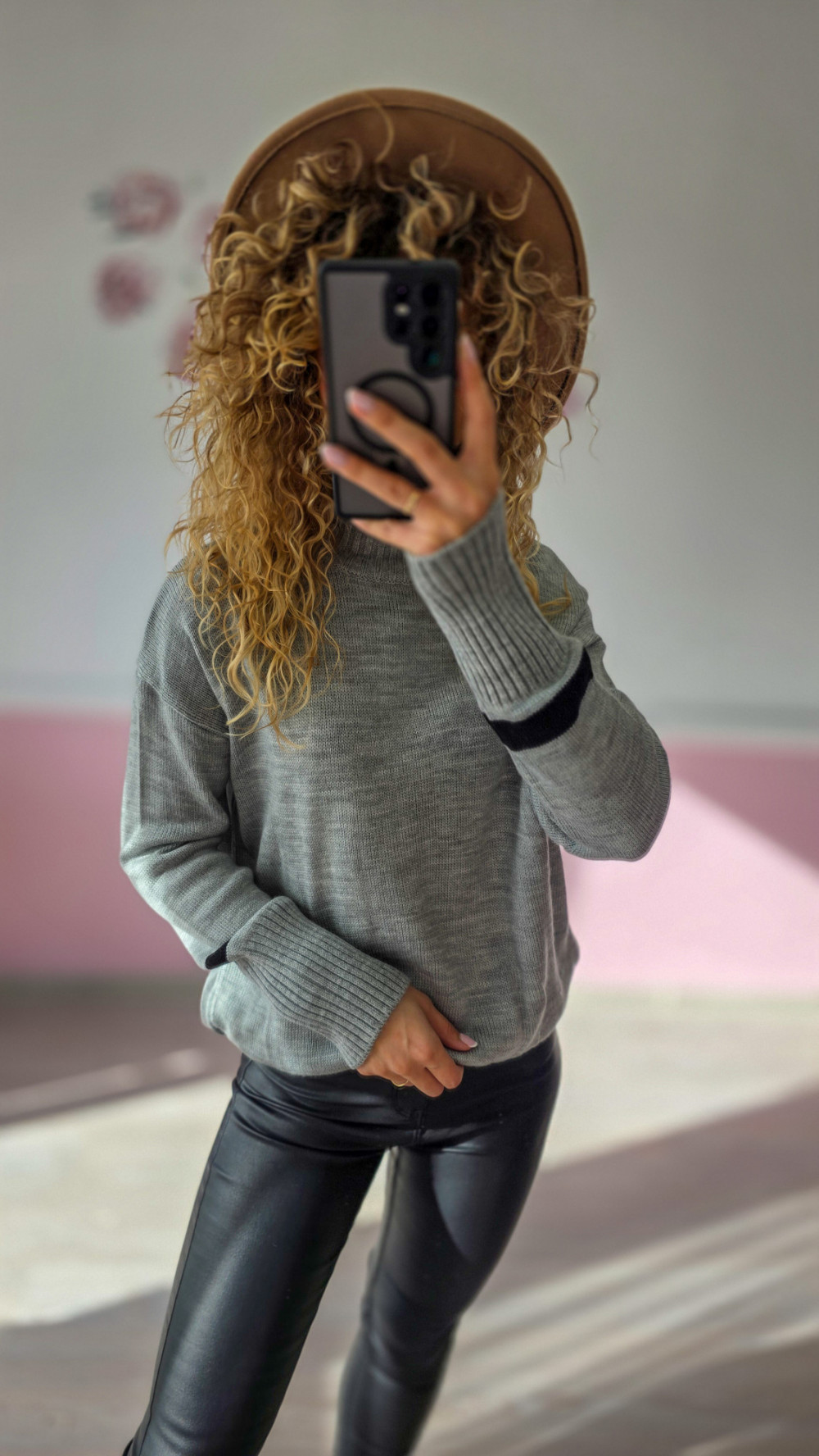 Uniwersalny i stylowy szary sweter damski to idealny wybór do codziennych stylizacji. Wykonany z miękkiego materiału, zapewnia komfort i ciepło, a czarne detale na rękawach dodają mu charakteru.