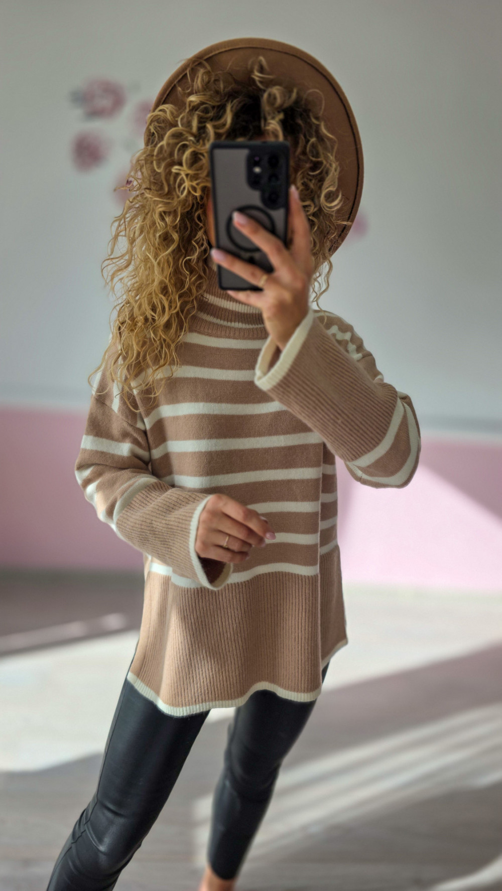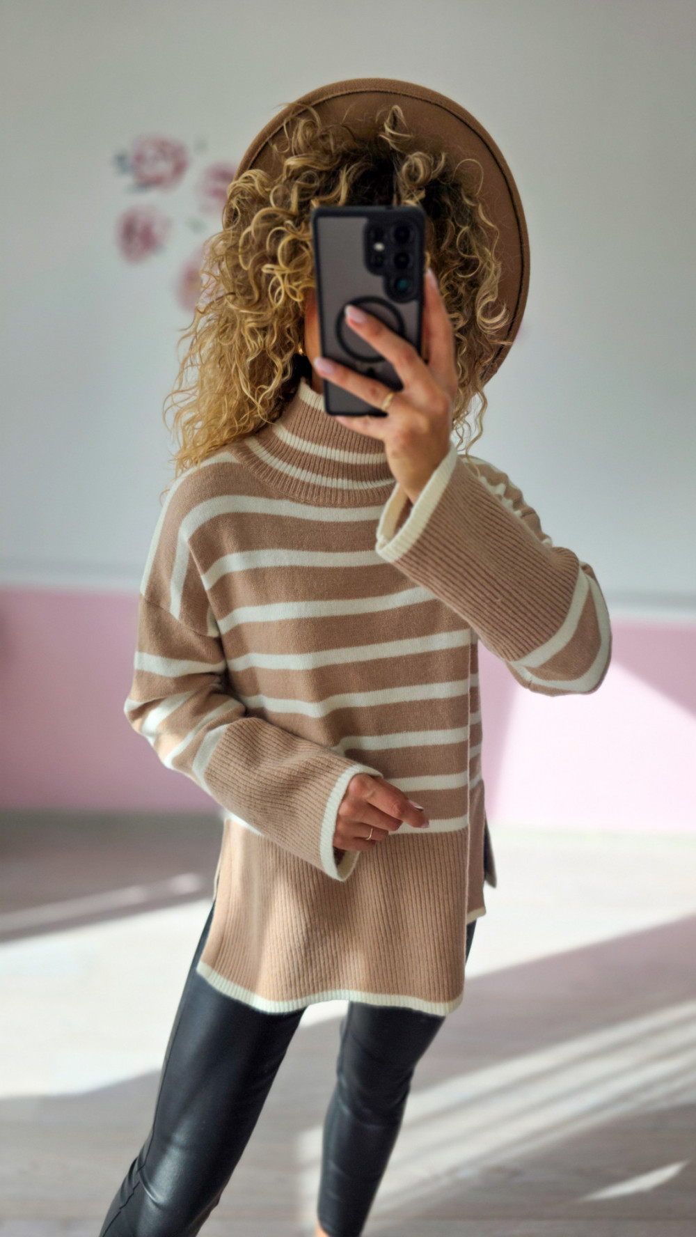 Sweter w paski – beżowo-kremowy z golfem M/L