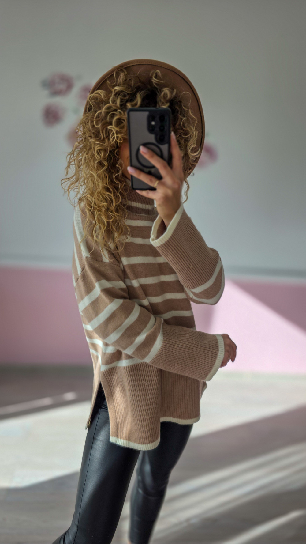 Ciepły i stylowy sweter damski w paski w odcieniach beżu i kremu to idealny wybór na jesień i zimę. Wykonany z miękkiej, przyjemnej w dotyku dzianiny, zapewnia komfort noszenia i świetnie prezentuje się w codziennych stylizacjach.