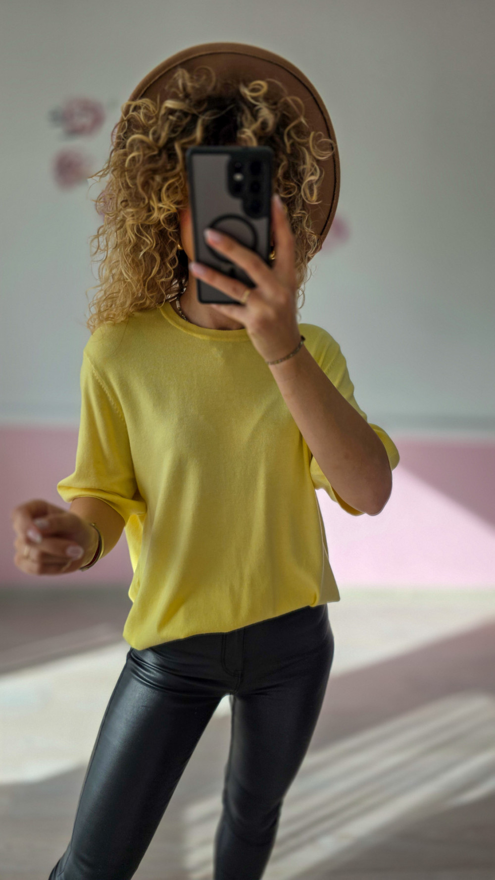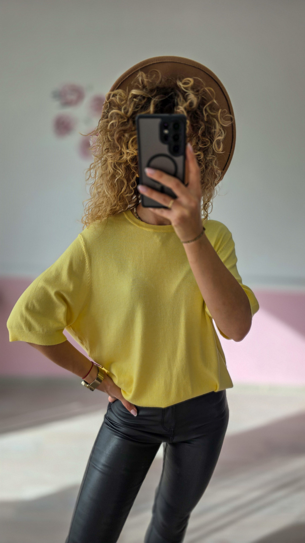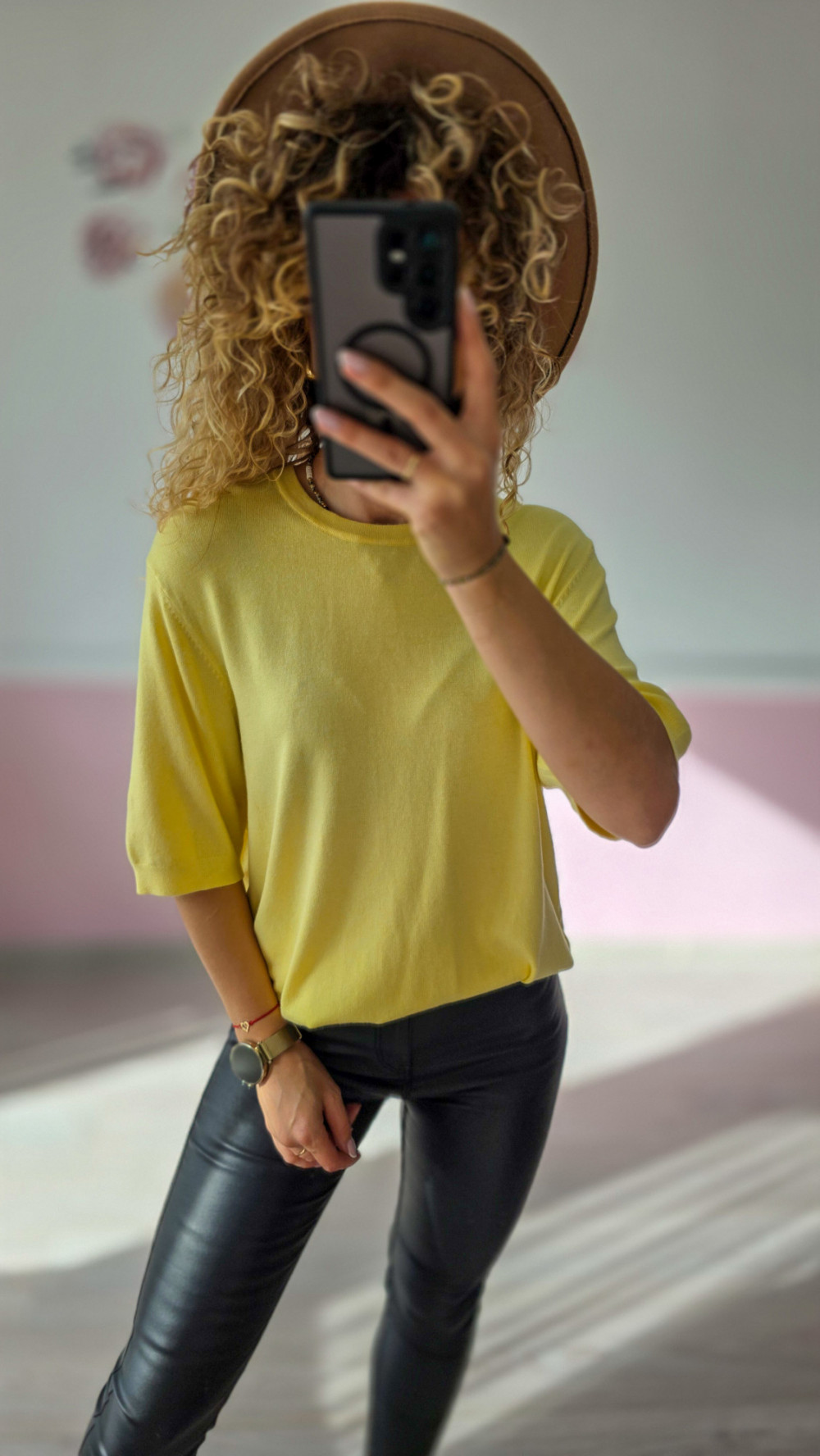 Radosny i modny żółty sweterek z krótkim rękawem doda energii każdej stylizacji.