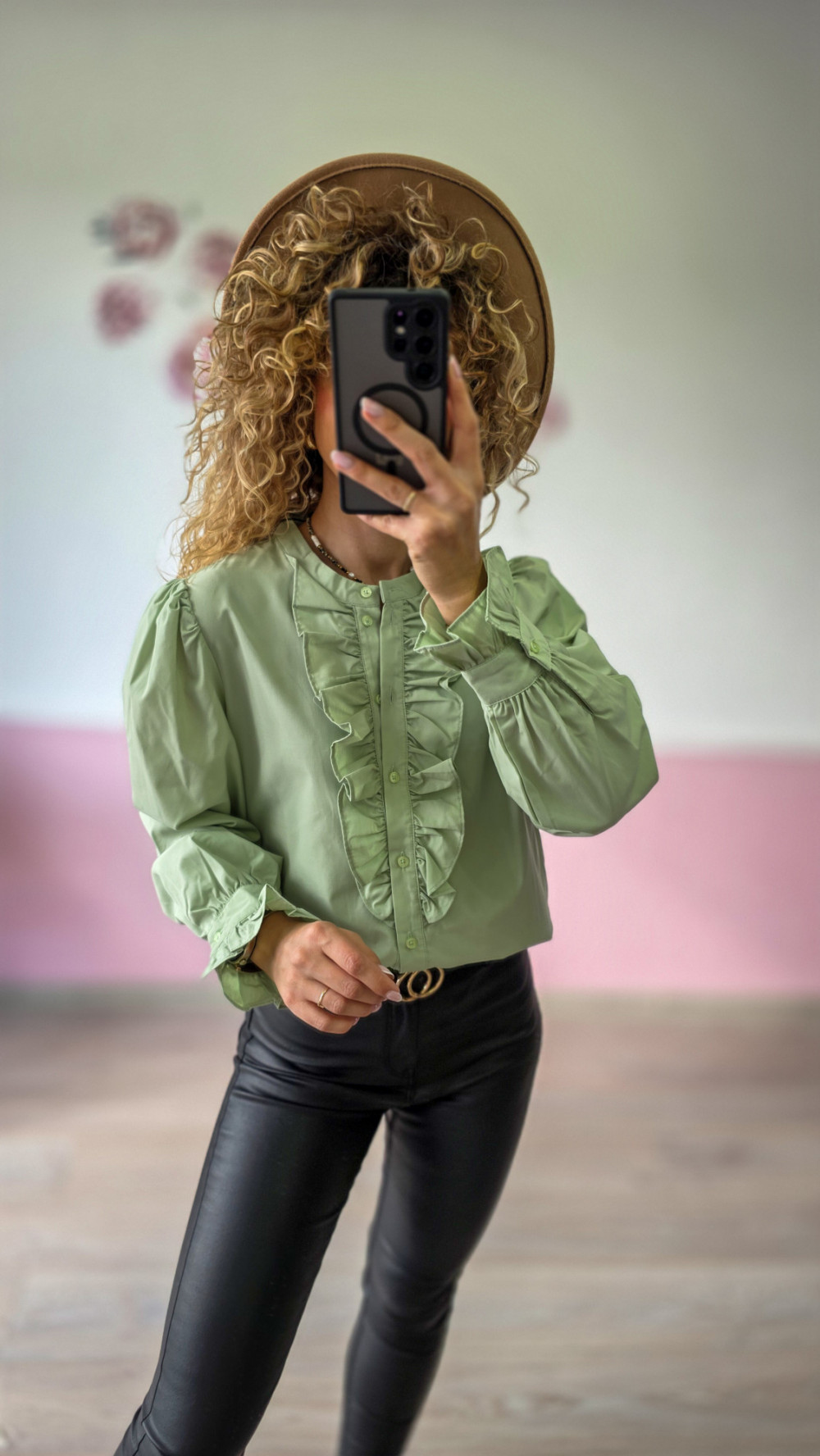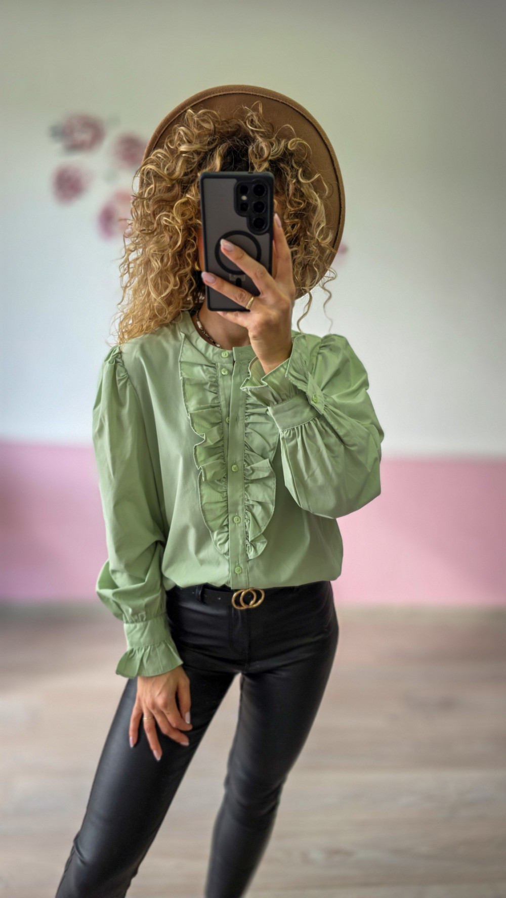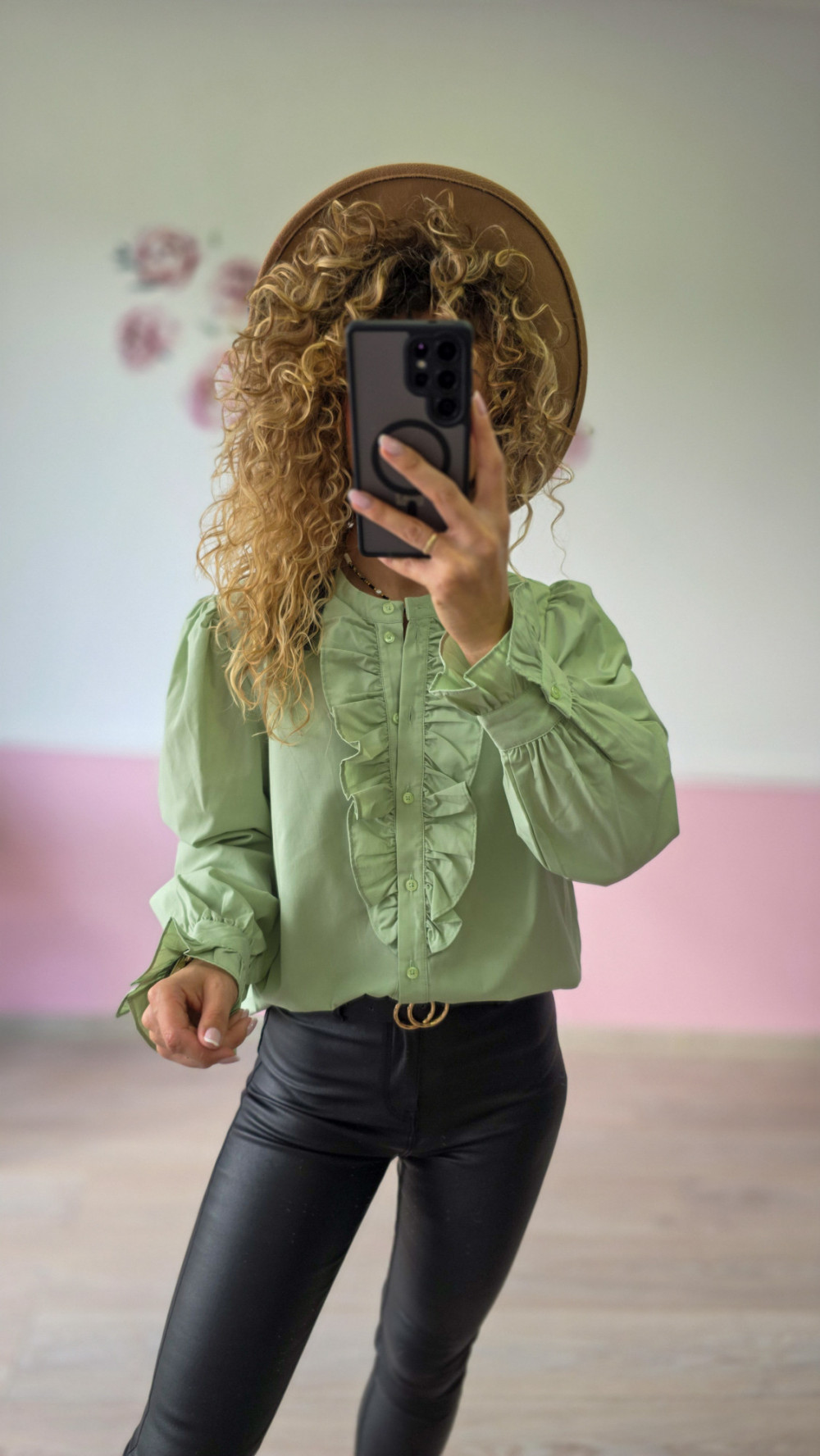 Stylowa zielona koszula z falbanami to połączenie klasyki i romantycznego wdzięku. Delikatne zdobienia wzdłuż zapięcia i bufiaste rękawy nadają jej wyjątkowego charakteru. Idealna do biura, na spotkanie lub eleganckie wyjście.