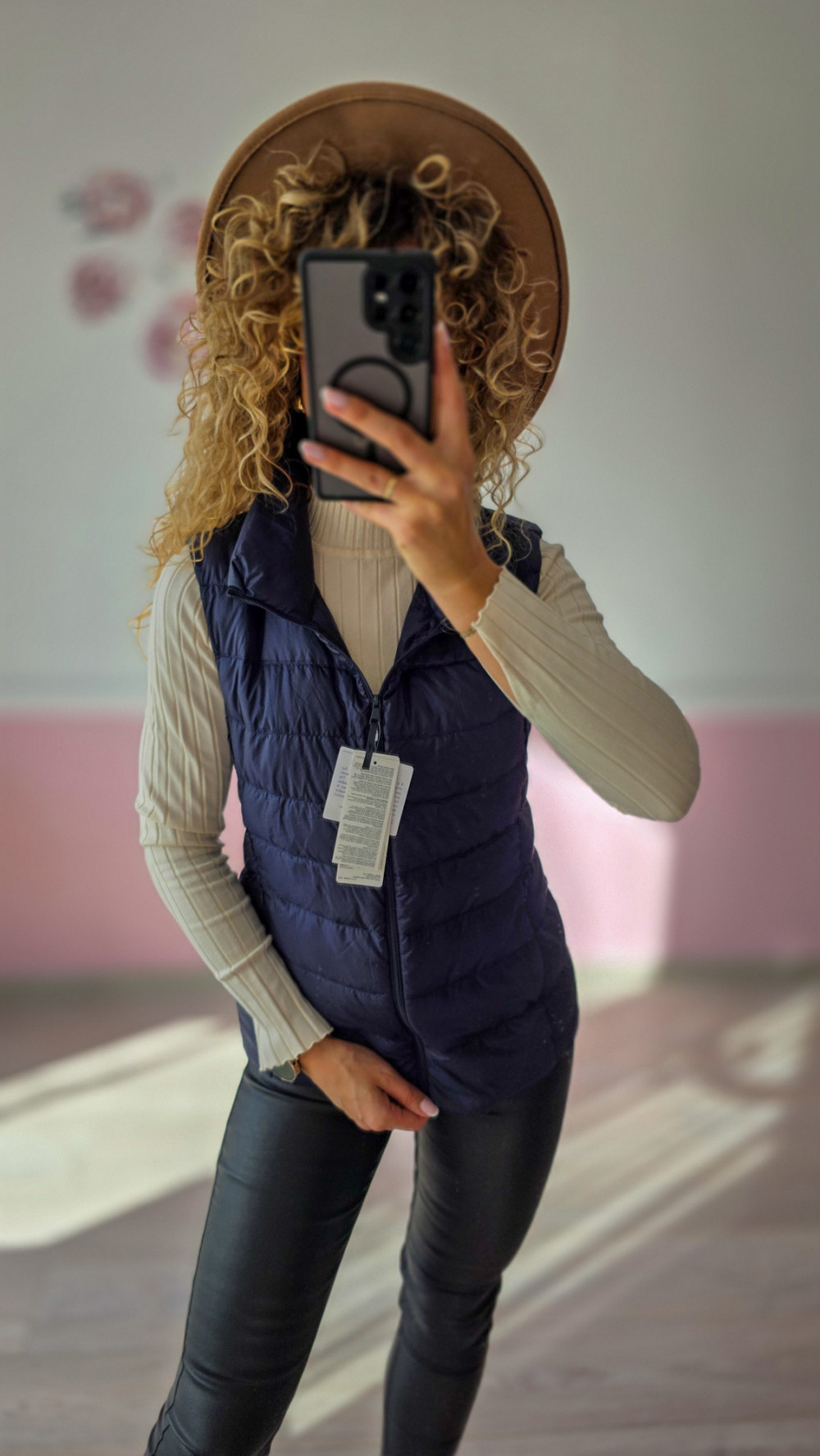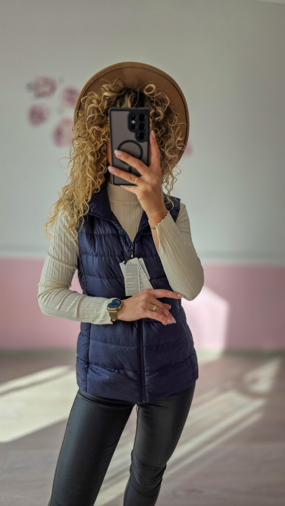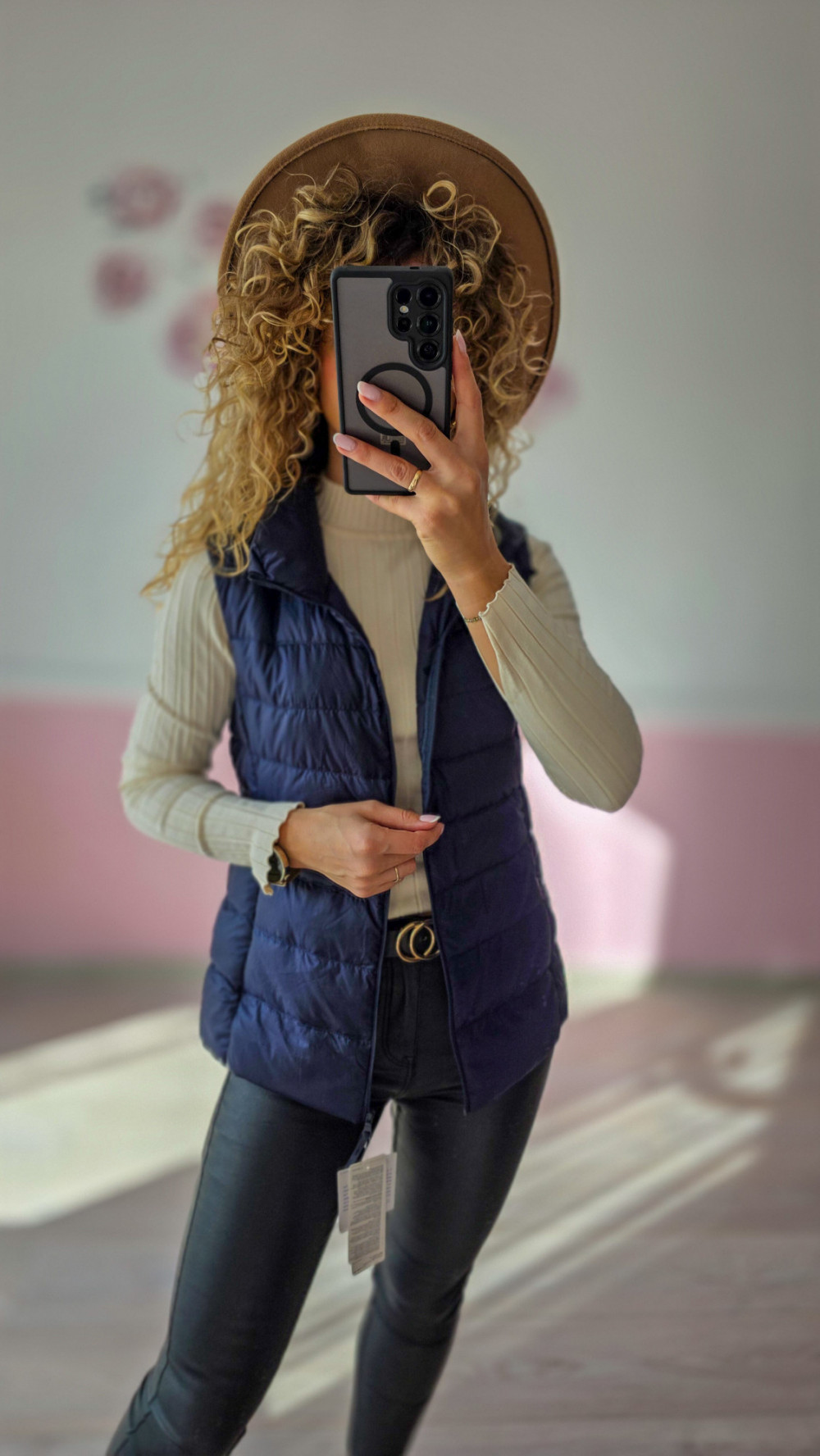 Zapinana na suwak, z wysokim kołnierzem i praktycznymi kieszeniami, zapewnia komfort oraz ochronę przed chłodem. Granatowy odcień dodaje elegancji i świetnie łączy się z beżami, czernią i szarościami. Kamizelka pasuje zarówno do sportowych, jak i casualowych stylizacji – możesz ją nosić z golfem, bluzą lub koszulą.