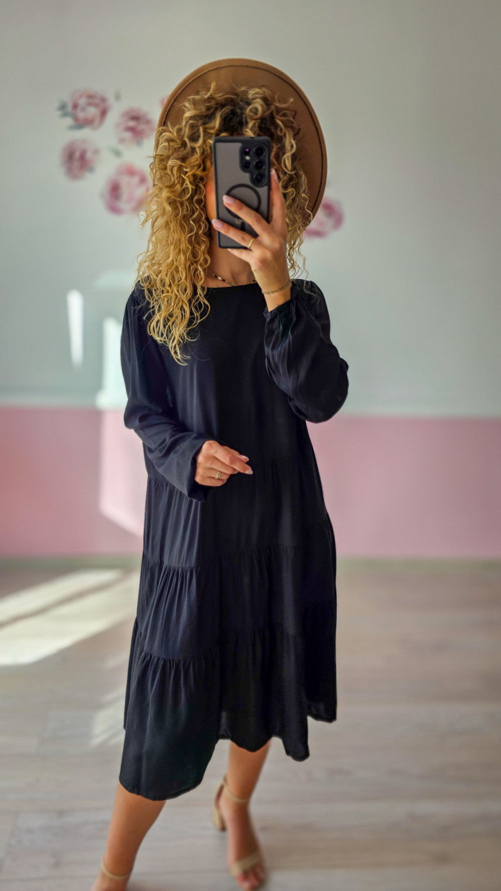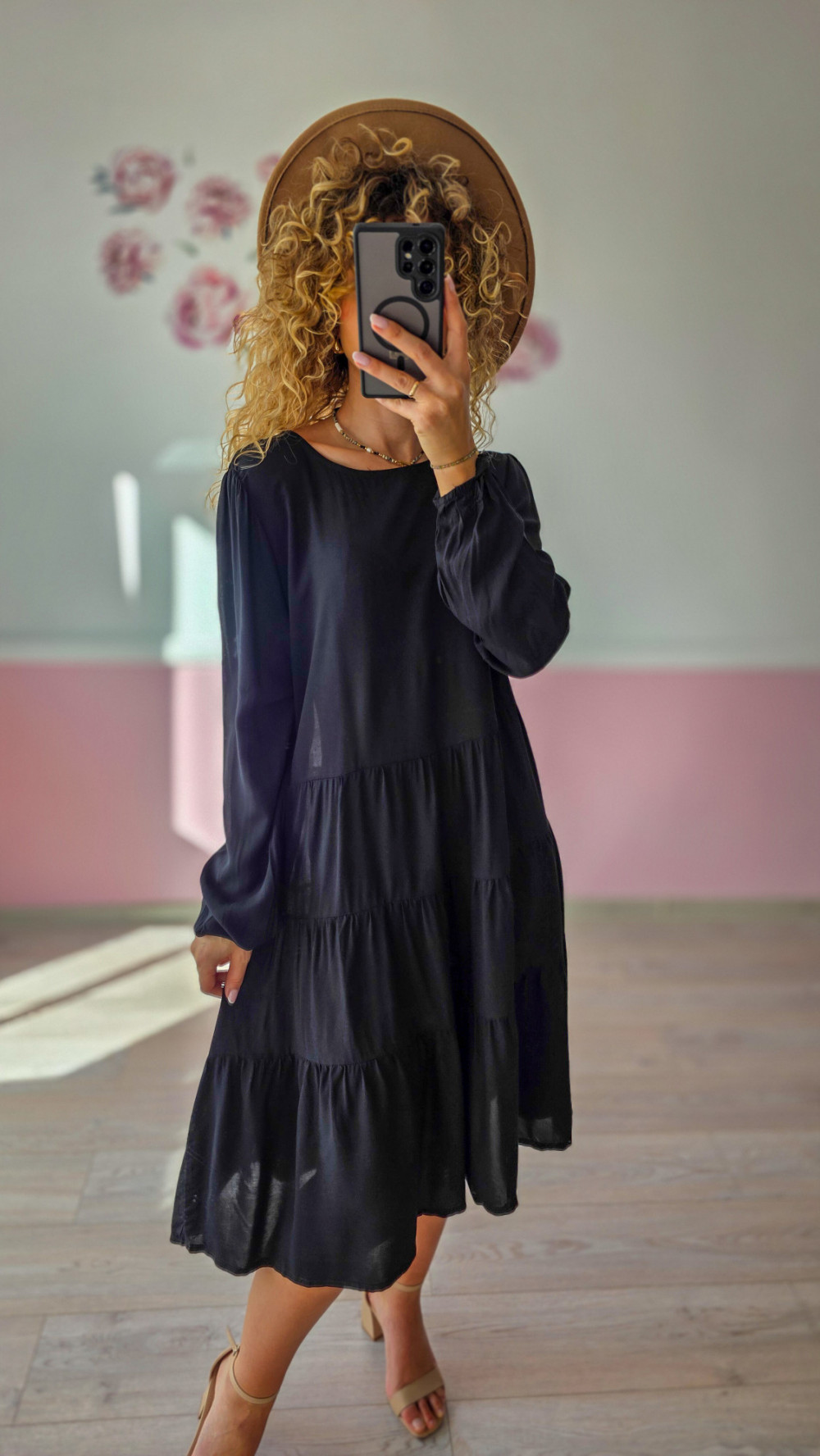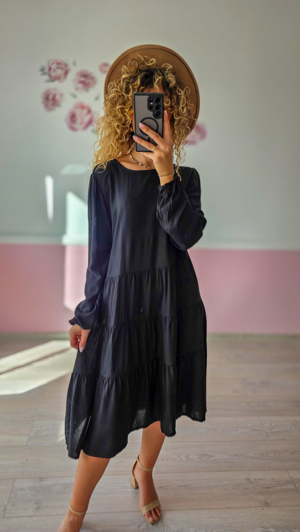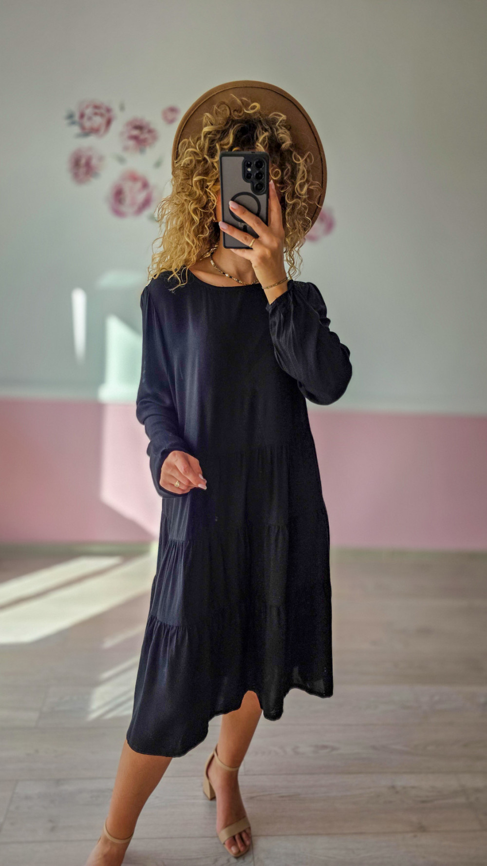 Zwiewna czarna sukienka z falbanami to must have w każdej kobiecej szafie. Luźny, rozkloszowany fason pięknie układa się w ruchu, a długie rękawy dodają jej elegancji i delikatności. Wykonana z lekkiego materiału, który zapewnia komfort przez cały dzień, sprawdzi się zarówno na co dzień, jak i na spotkania ze znajomymi.
