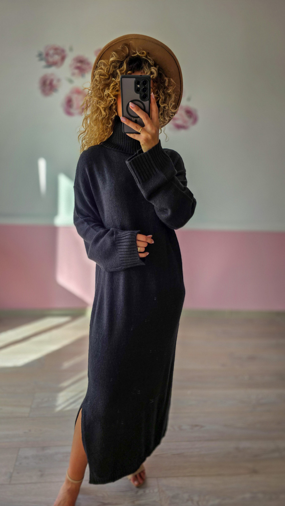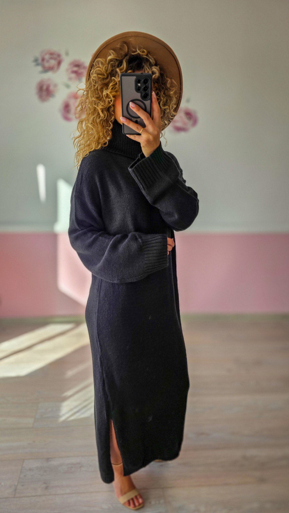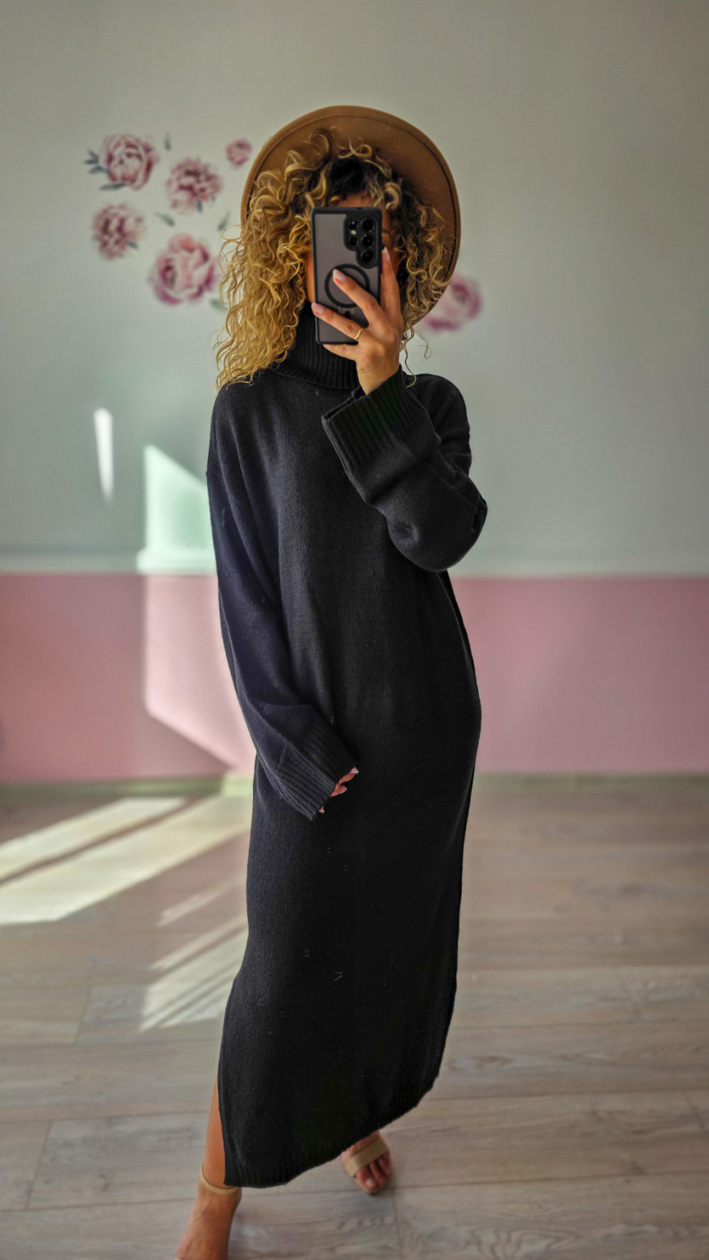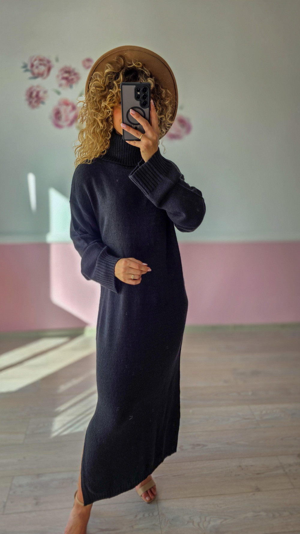 Czarna dzianinowa sukienka maxi z golfem – ciepła i stylowa