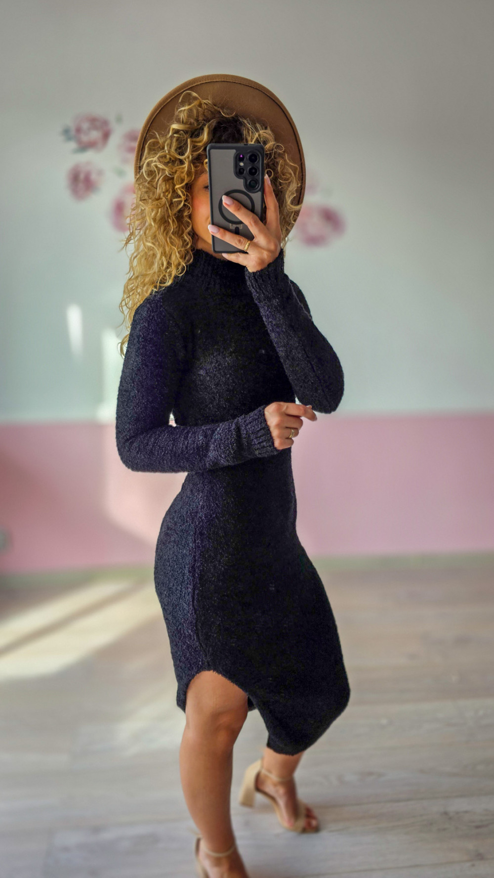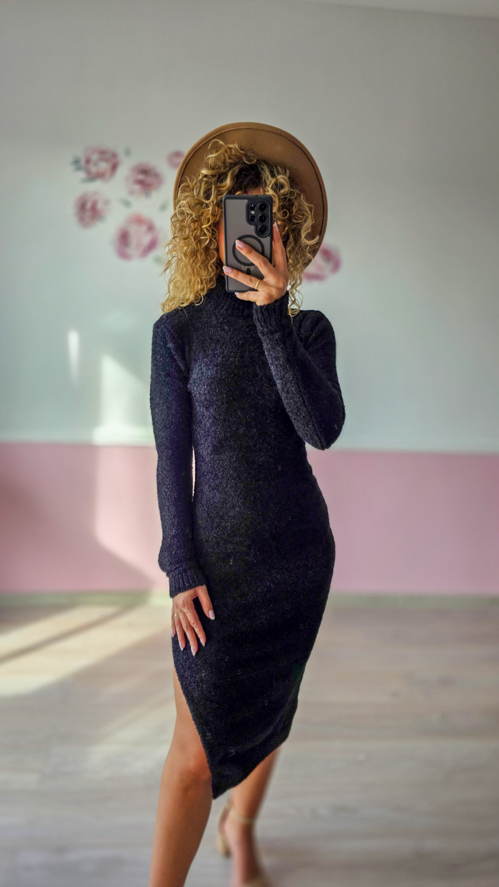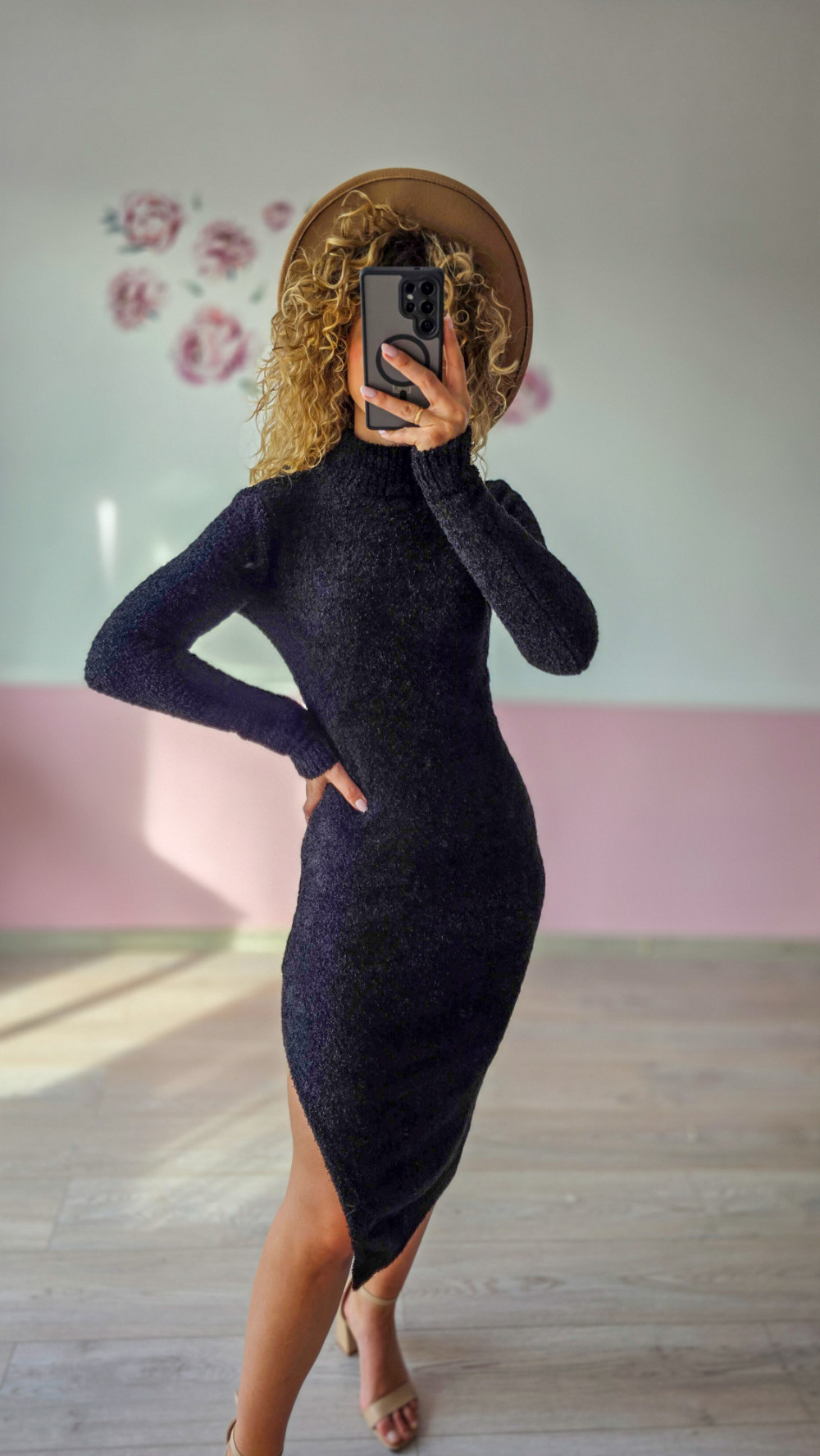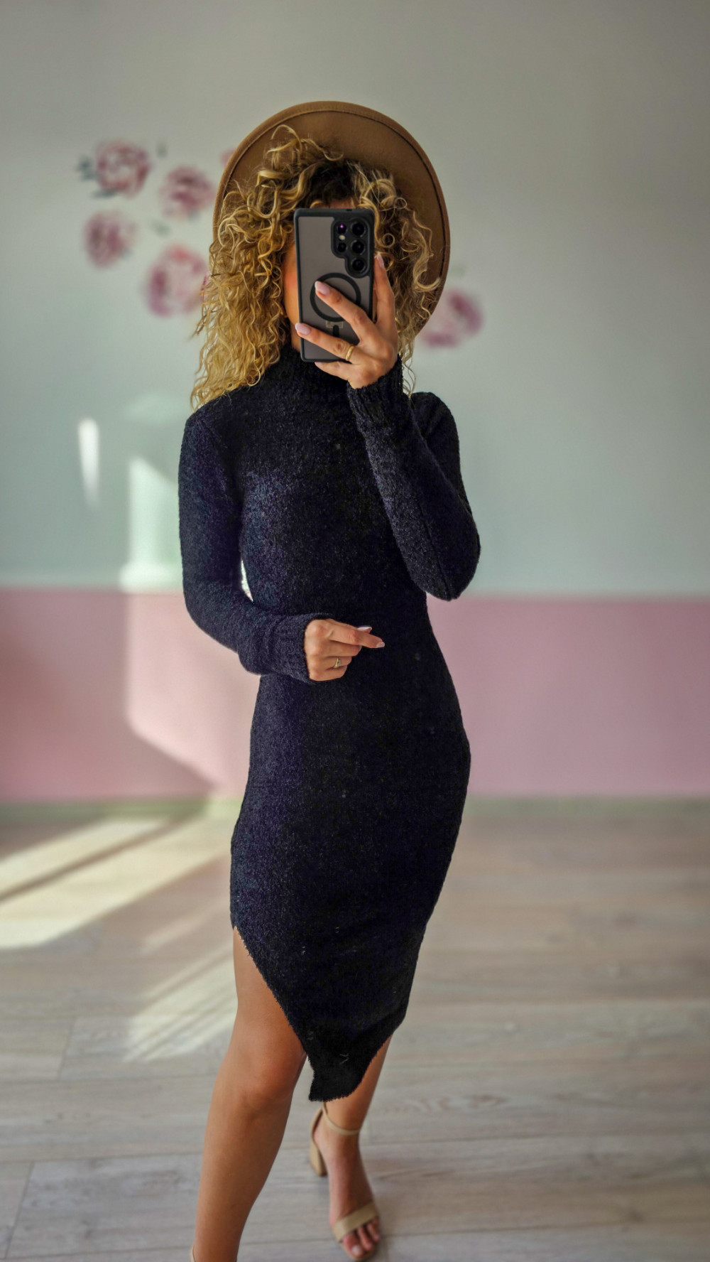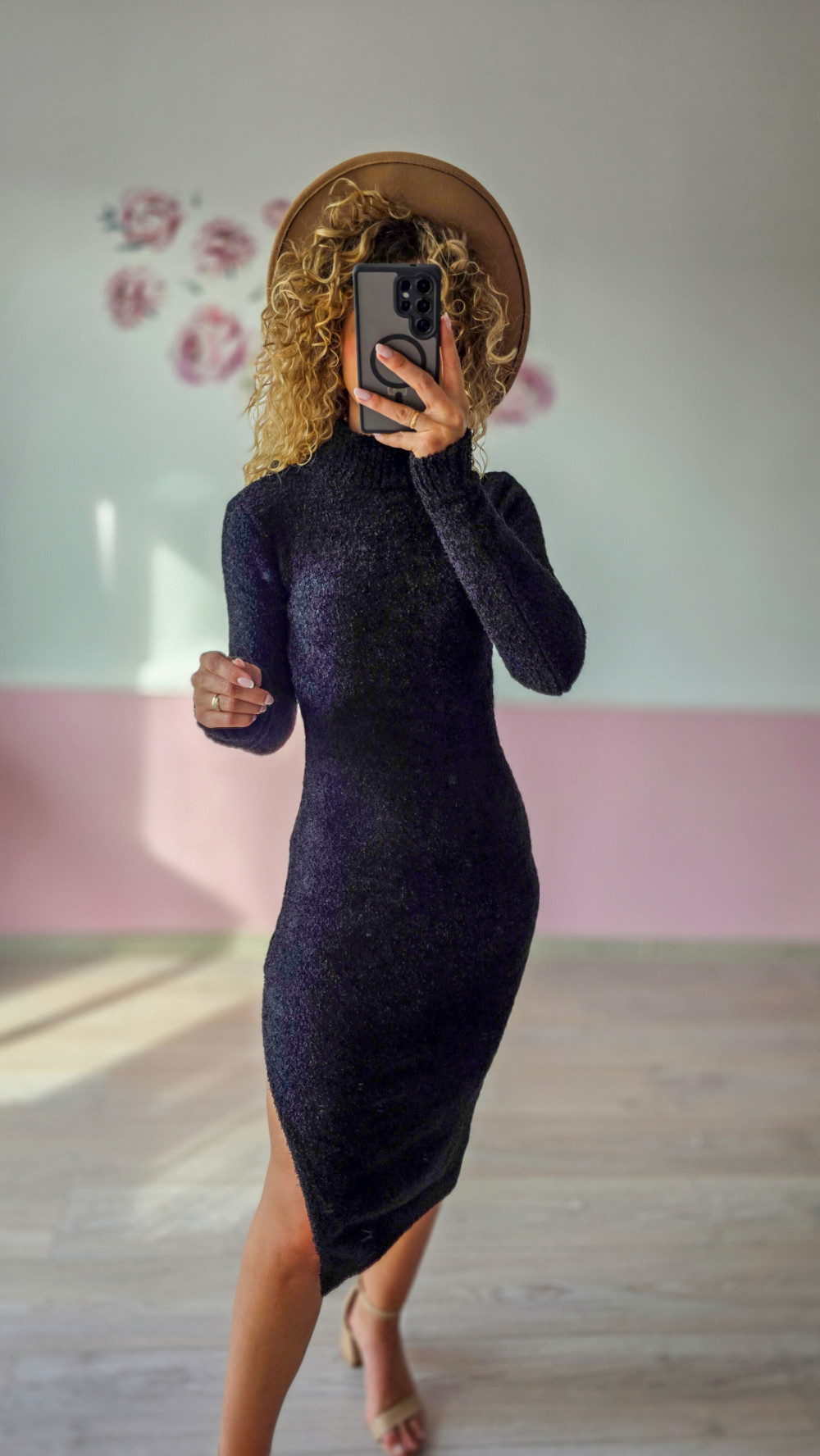 Ta czarna dopasowana sukienka z delikatnym połyskiem to idealny wybór dla kobiet, które lubią minimalizm w wyjątkowym wydaniu. Elastyczny materiał pięknie dopasowuje się do sylwetki, a klasyczny golf i długi rękaw dodają jej elegancji.