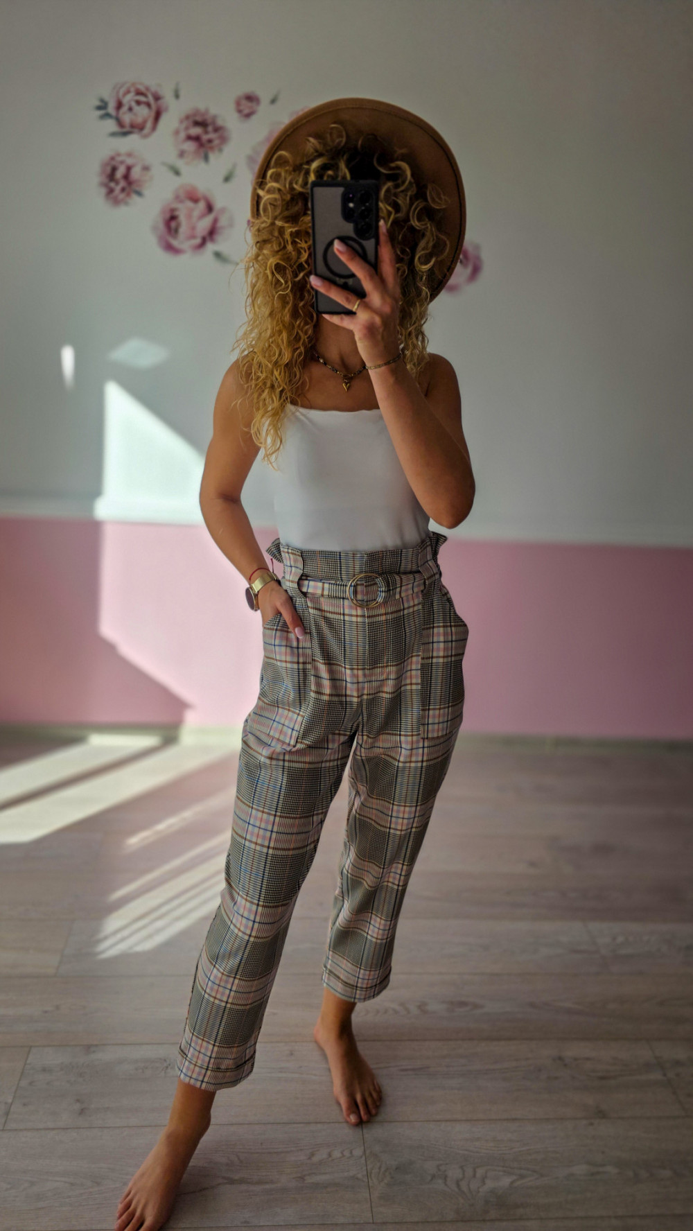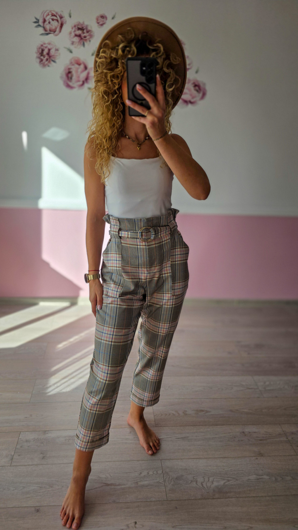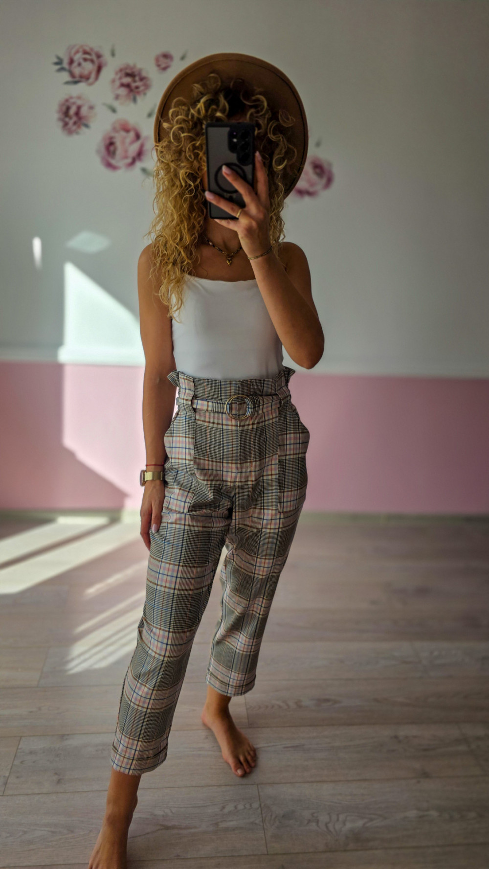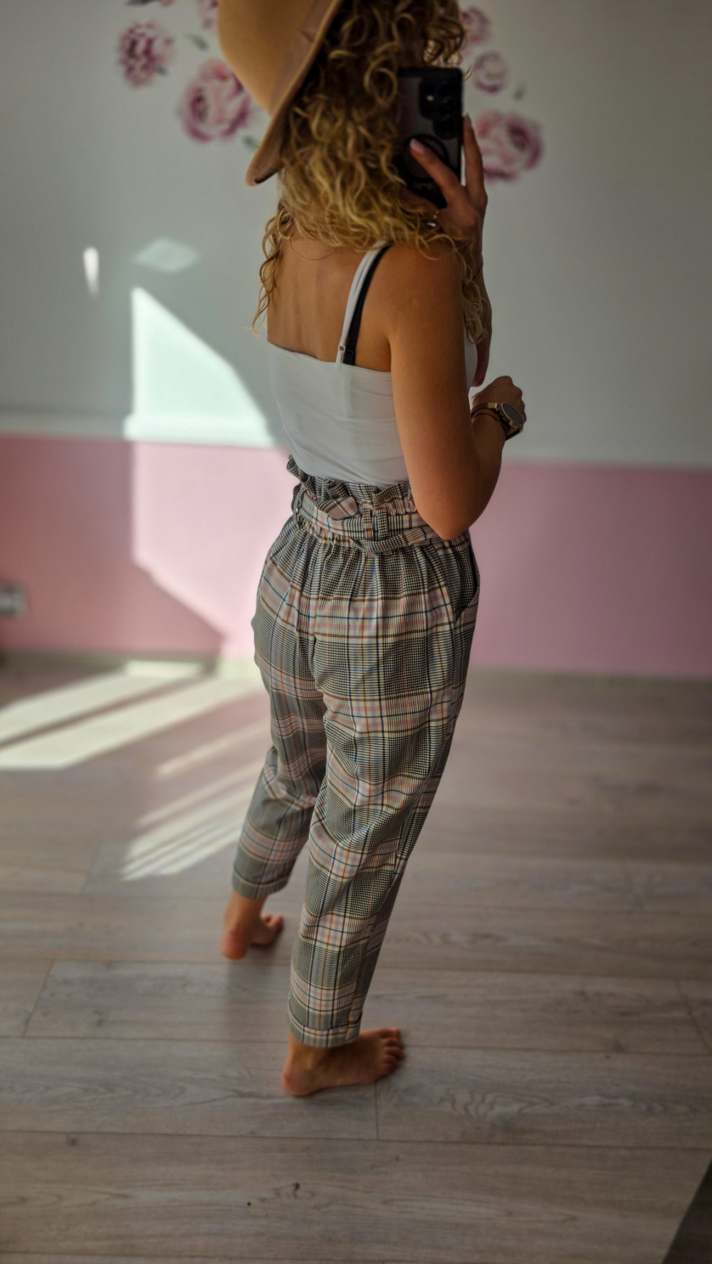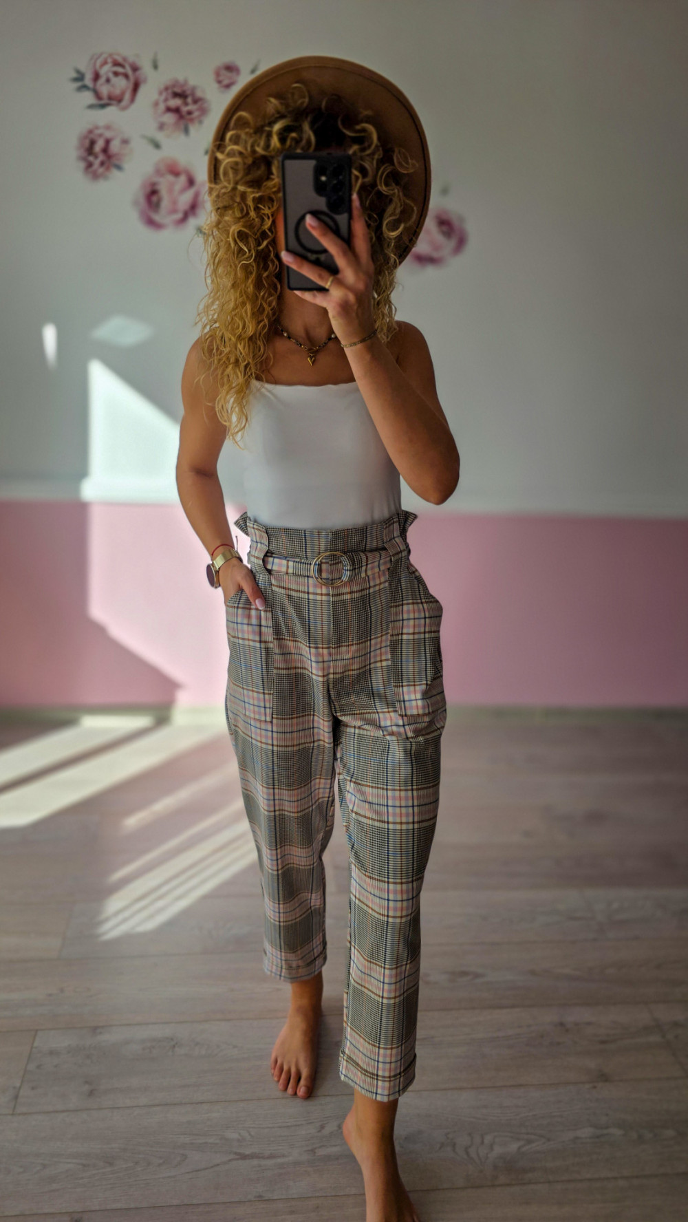 Te spodnie w kratkę to idealna propozycja dla kobiet, które lubią połączenie klasyki z modnym twistem. Wysoki stan z marszczeniem i paskiem w talii pięknie podkreśla sylwetkę, a zwężane nogawki dodają lekkości. Wzór w odcieniach beżu i różu nadaje im wyjątkowego charakteru.